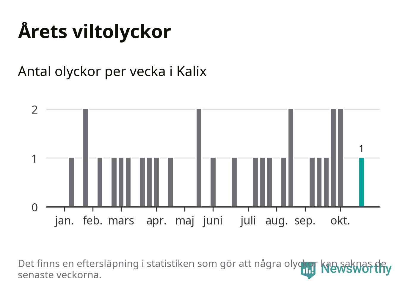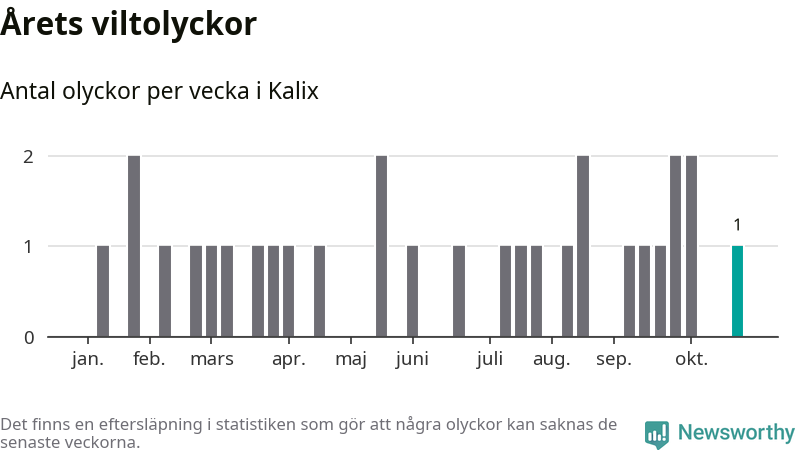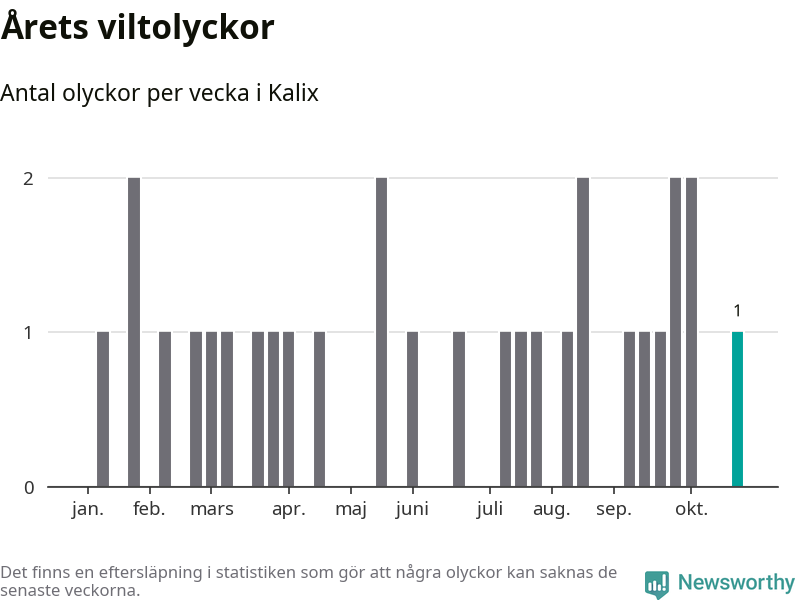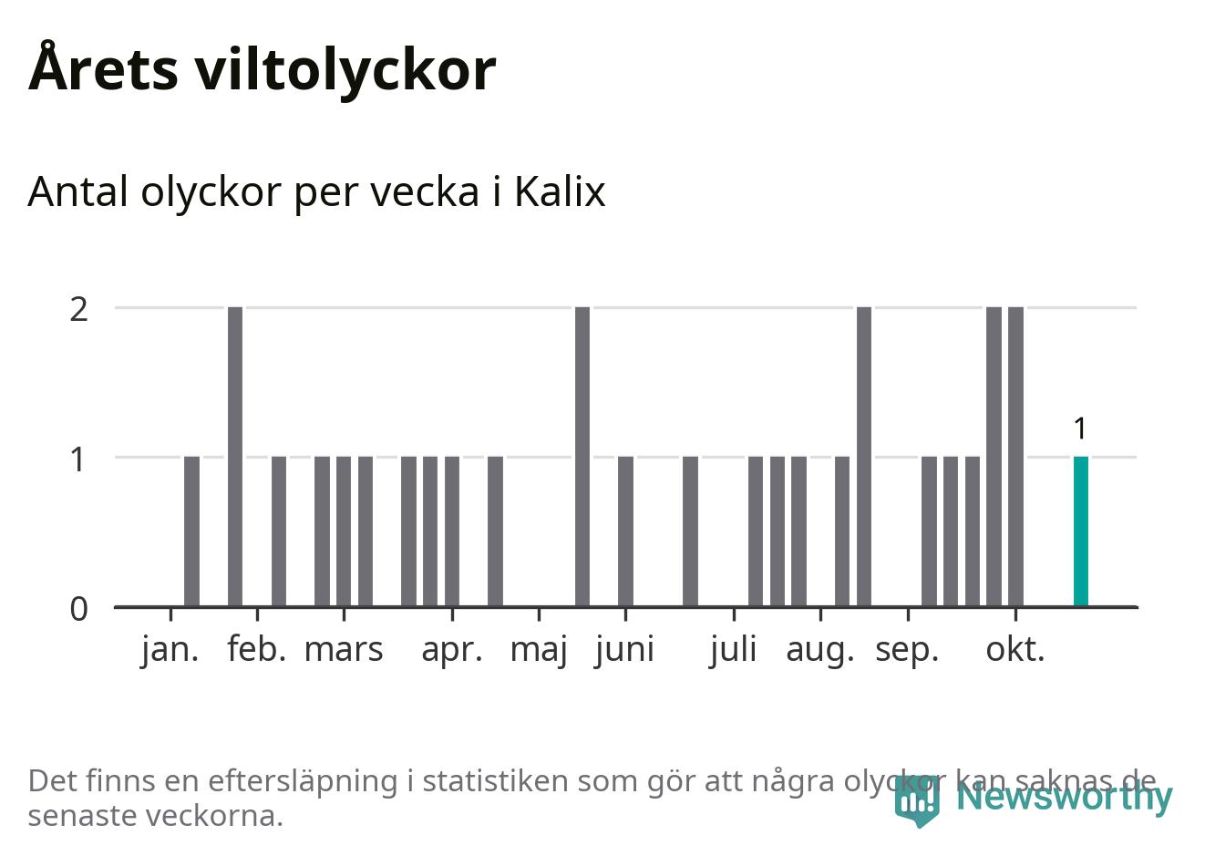 Från förra veckan (vecka 44) har hittills en viltolycka rapporterats in i Kalix kommun.