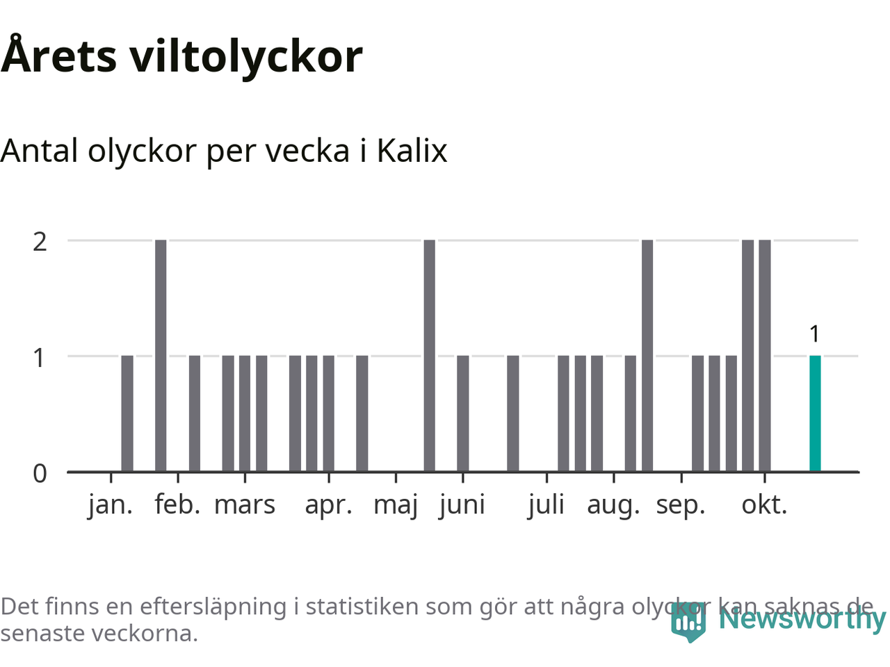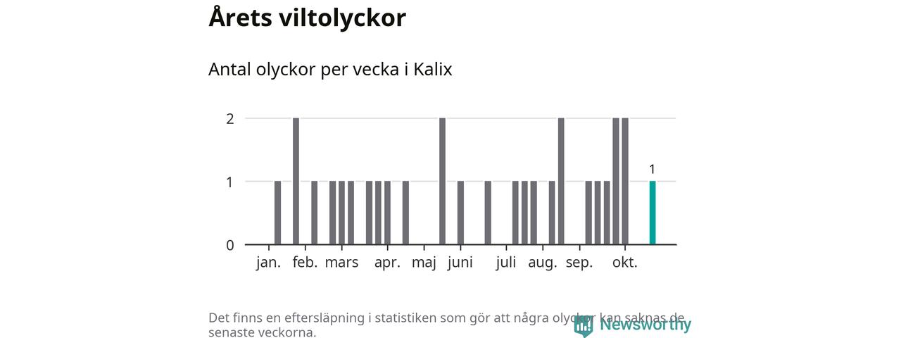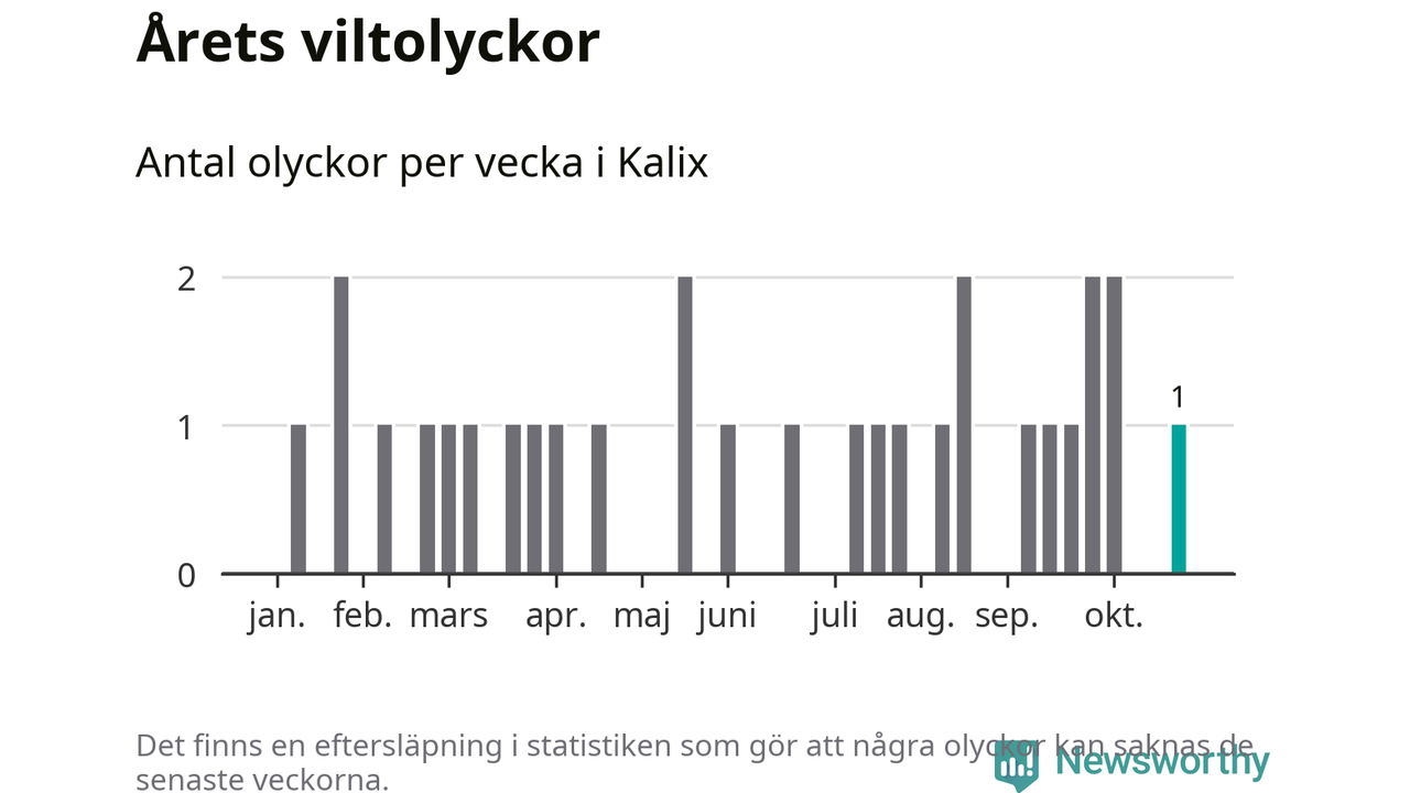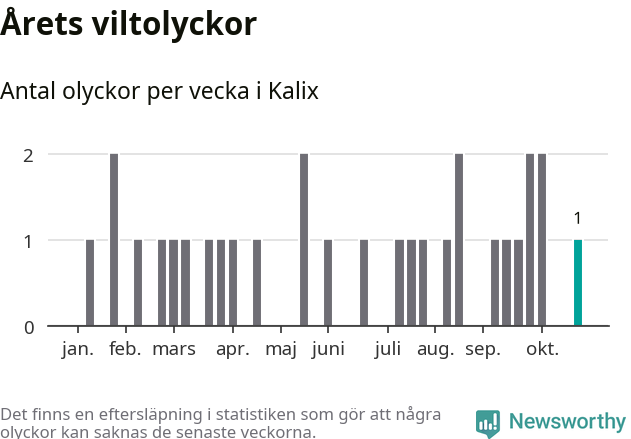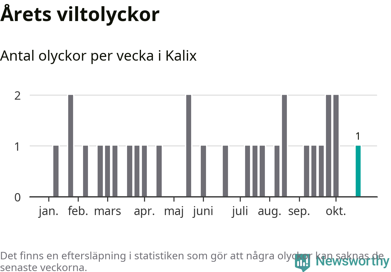 Från förra veckan (vecka 44) har hittills en viltolycka rapporterats in i Kalix kommun.