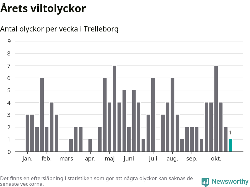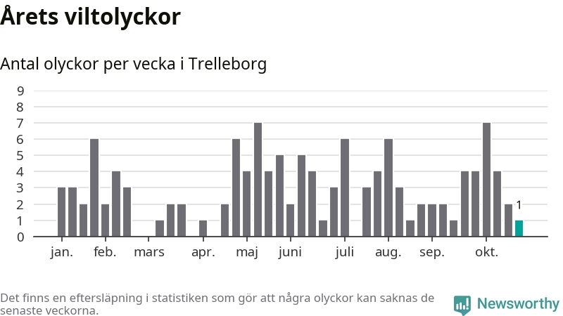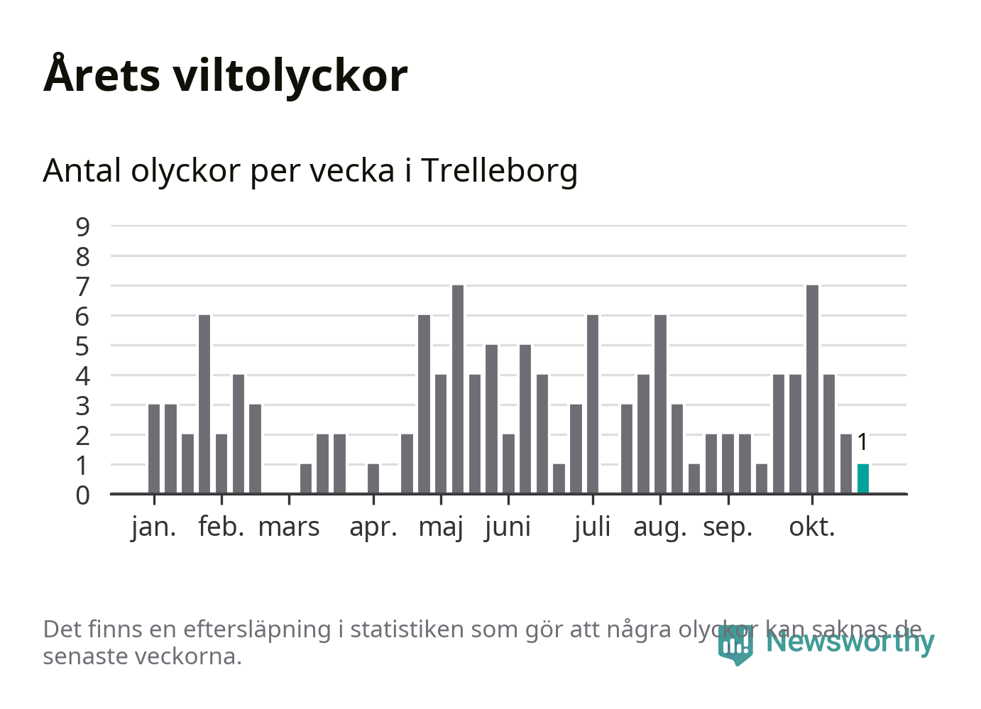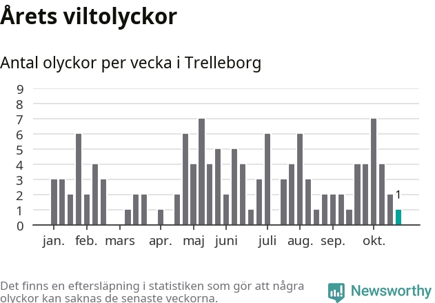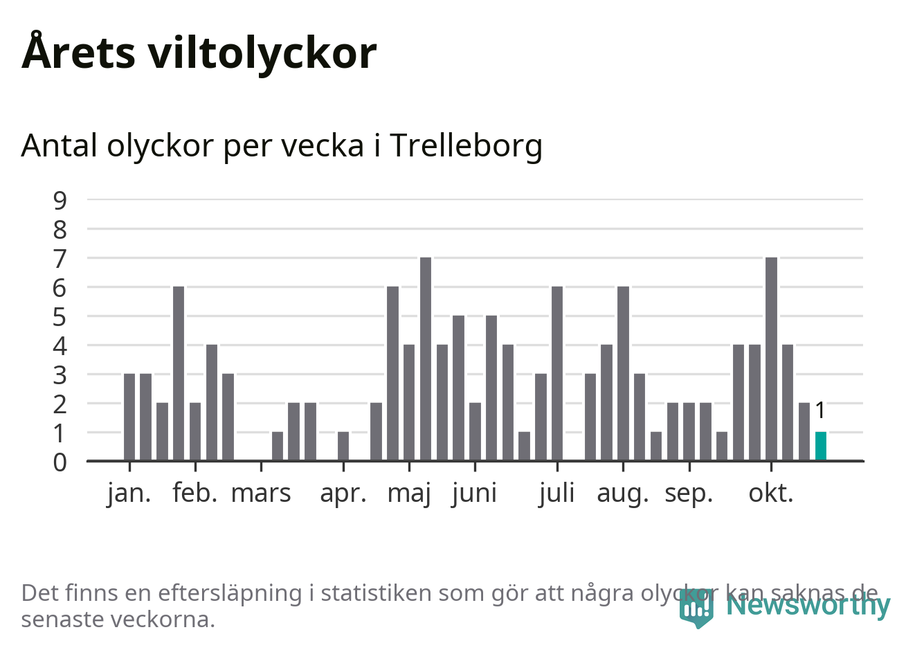 Från förra veckan (vecka 44) har hittills en viltolycka rapporterats in i Trelleborgs kommun.