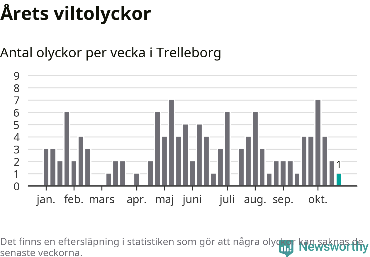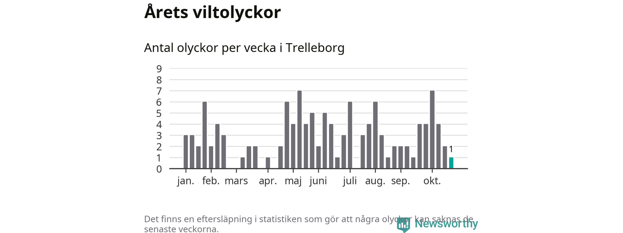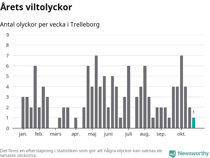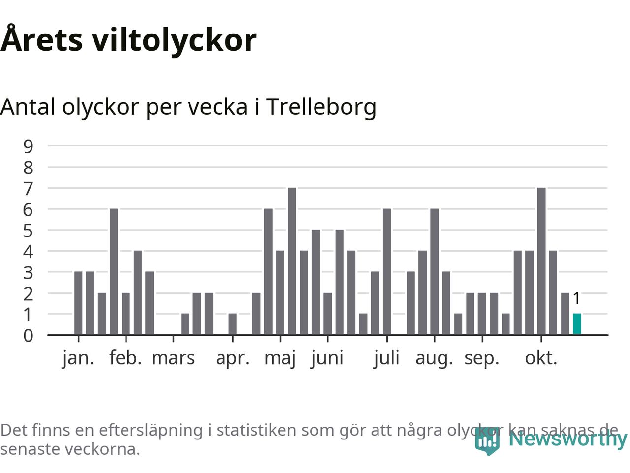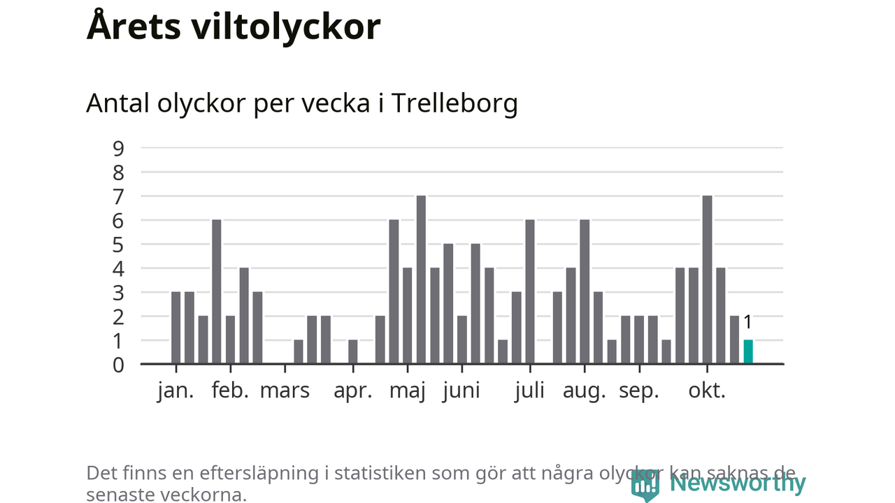 Från förra veckan (vecka 44) har hittills en viltolycka rapporterats in i Trelleborgs kommun.