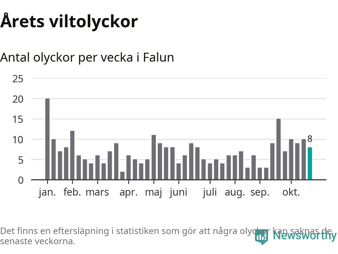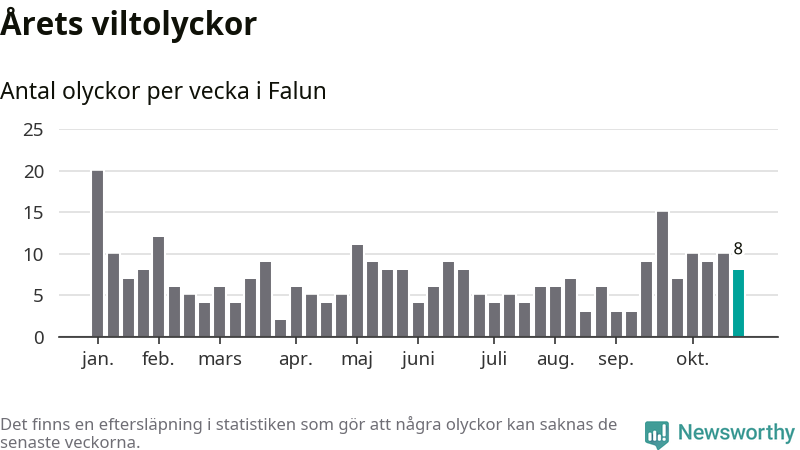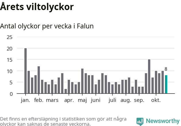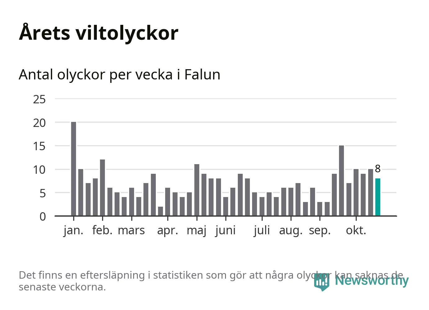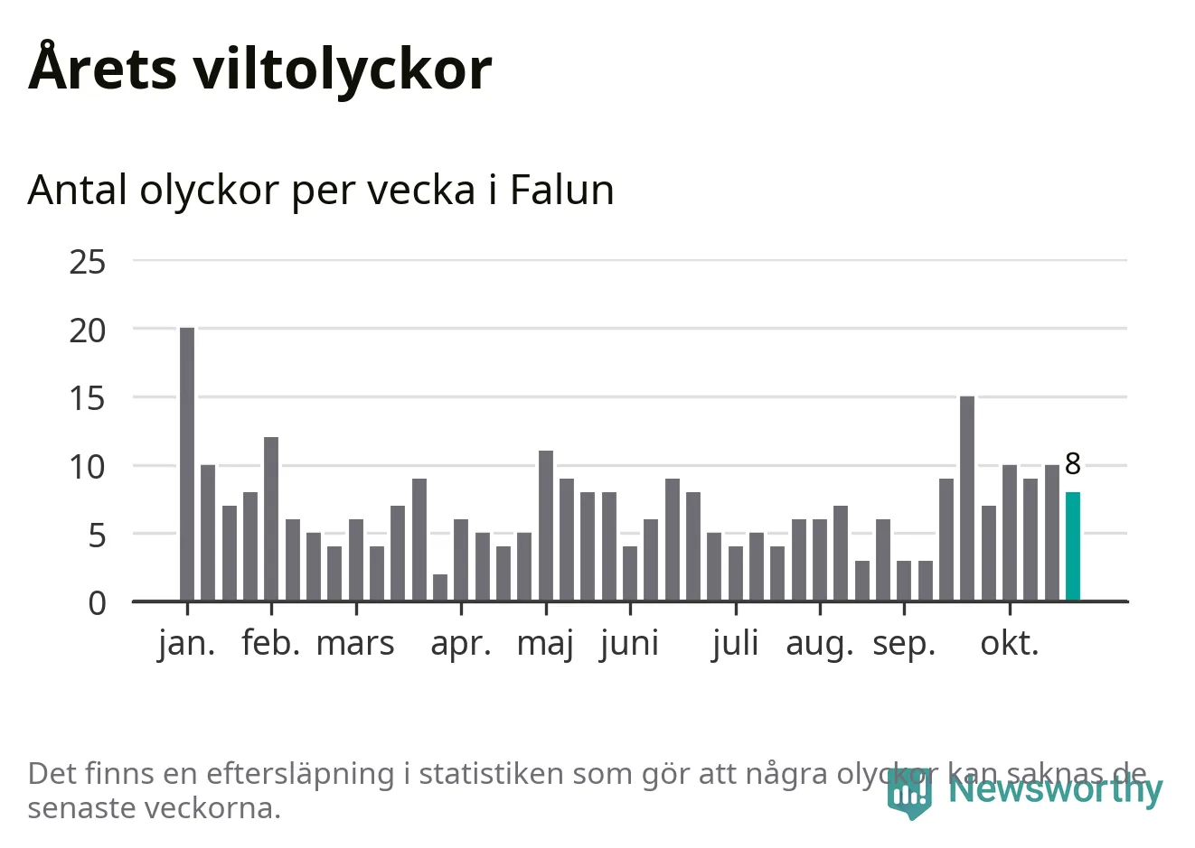 Totalt det här året har det inträffat 312 viltolyckor i kommunen. Det är mindre än genomsnittet för motsvarande period (omkring 366) de senaste tio åren.