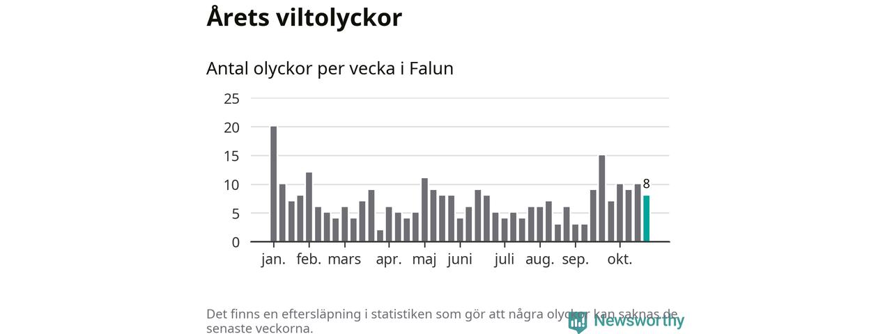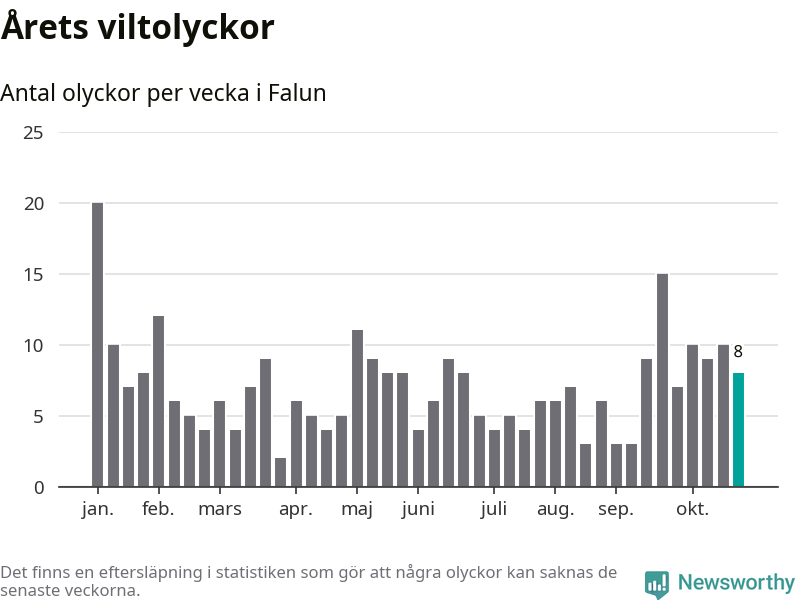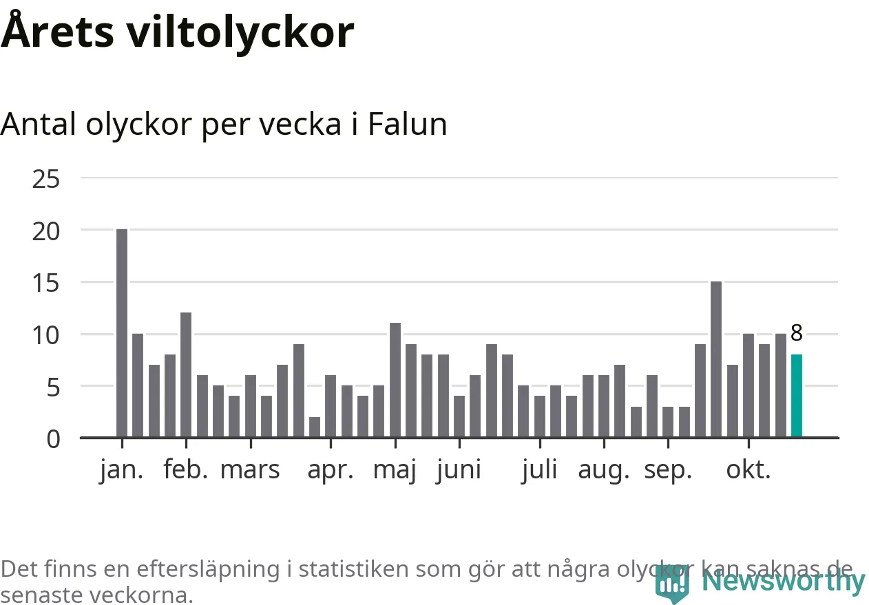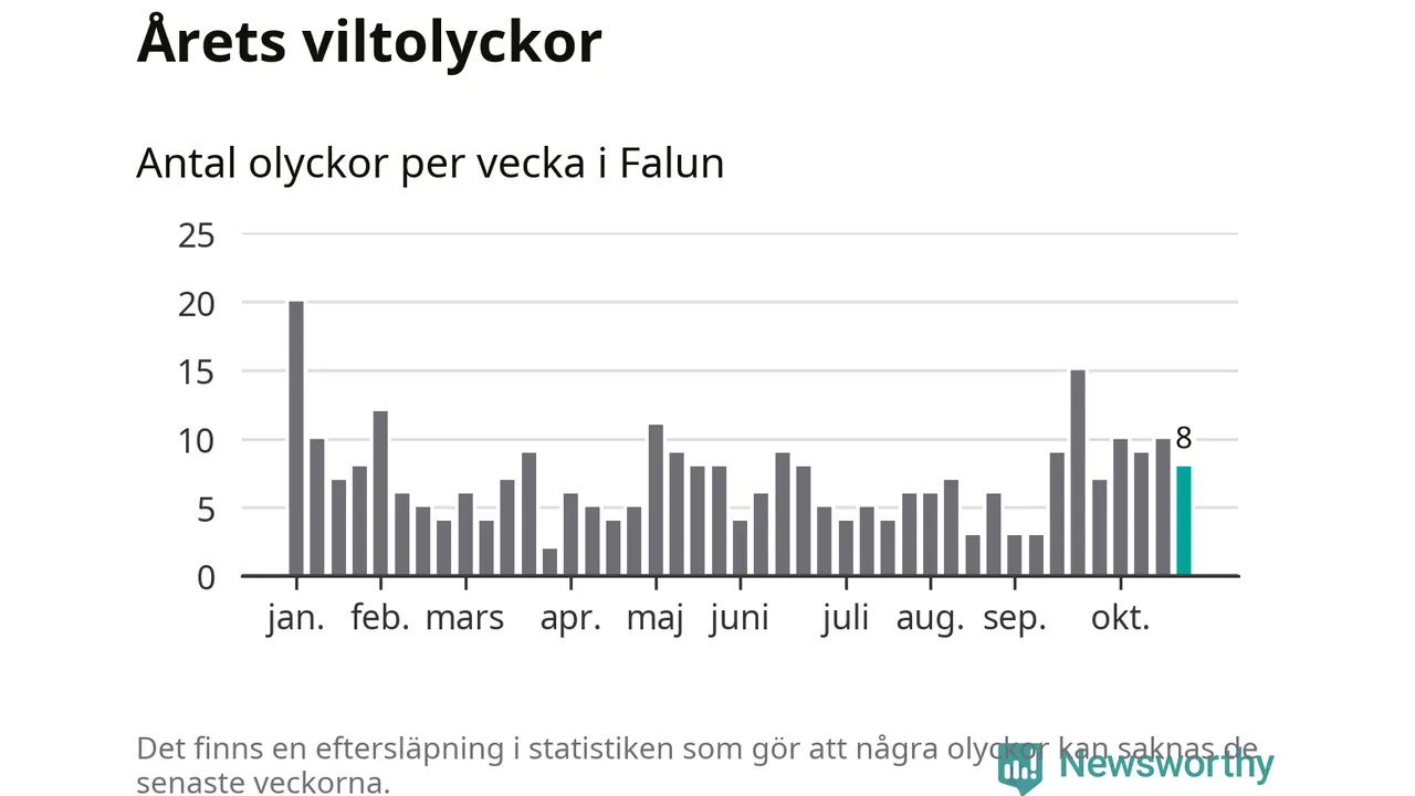 Totalt det här året har det inträffat 312 viltolyckor i kommunen. Det är mindre än genomsnittet för motsvarande period (omkring 366) de senaste tio åren.