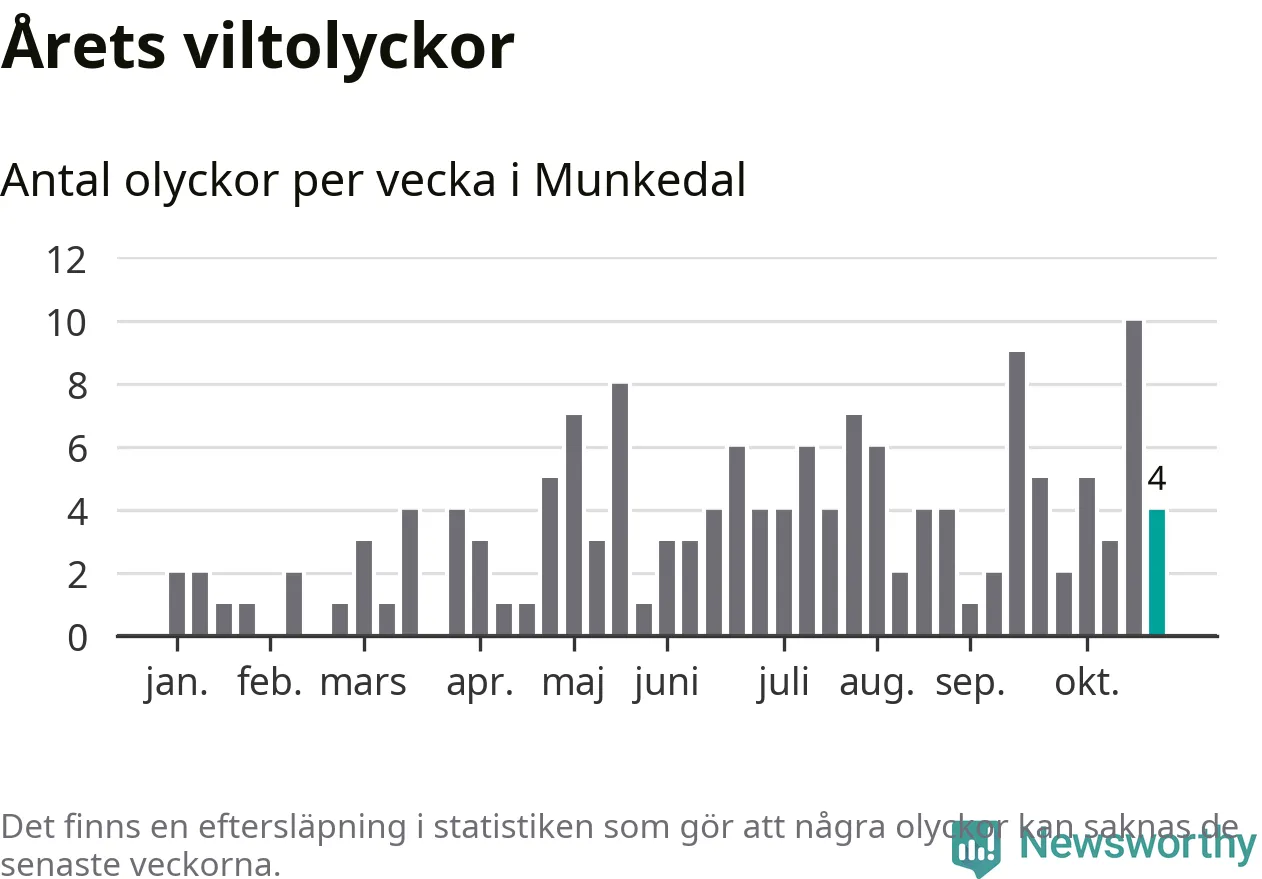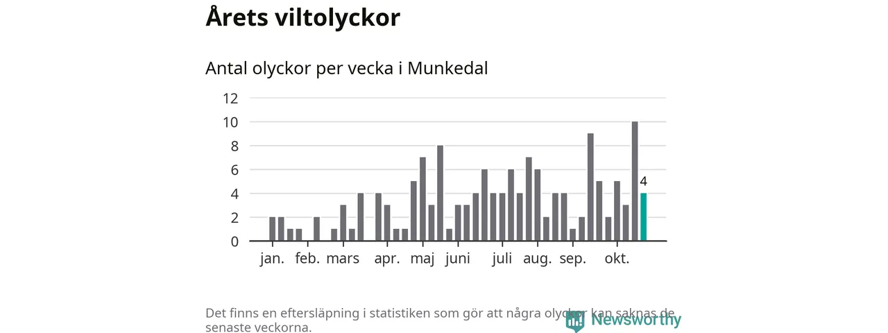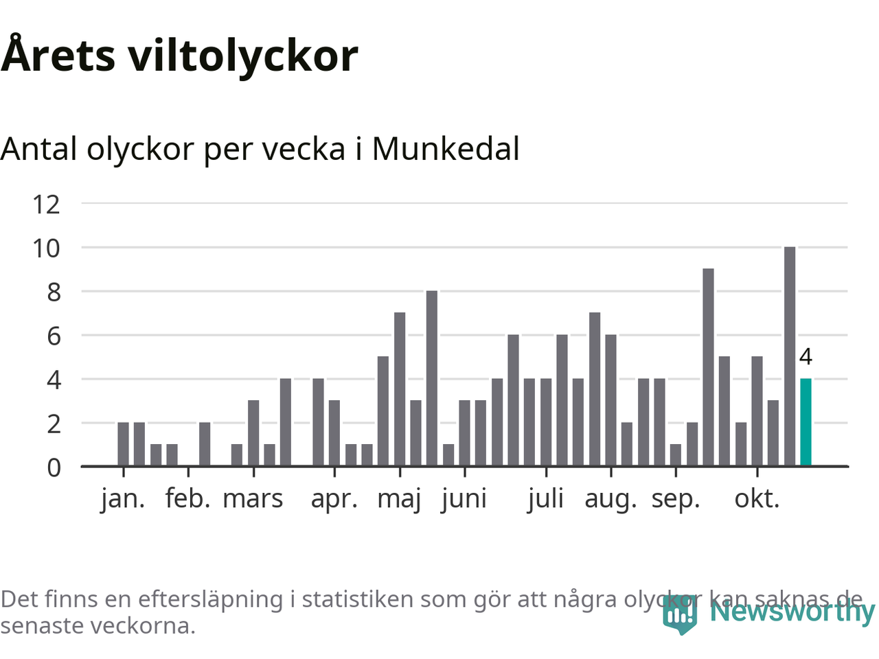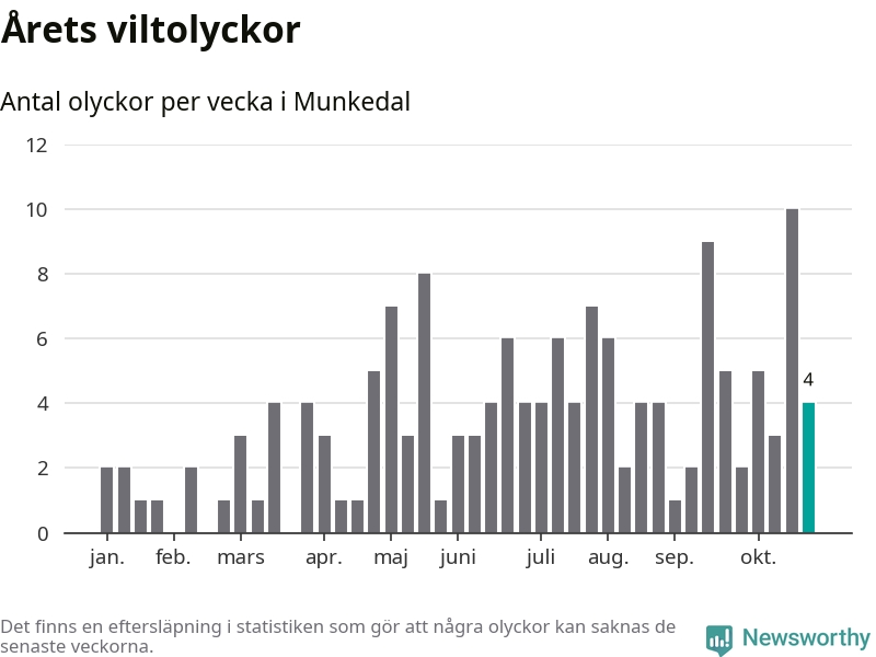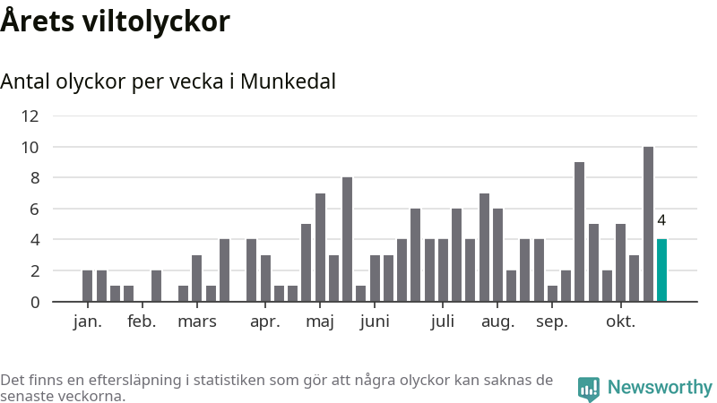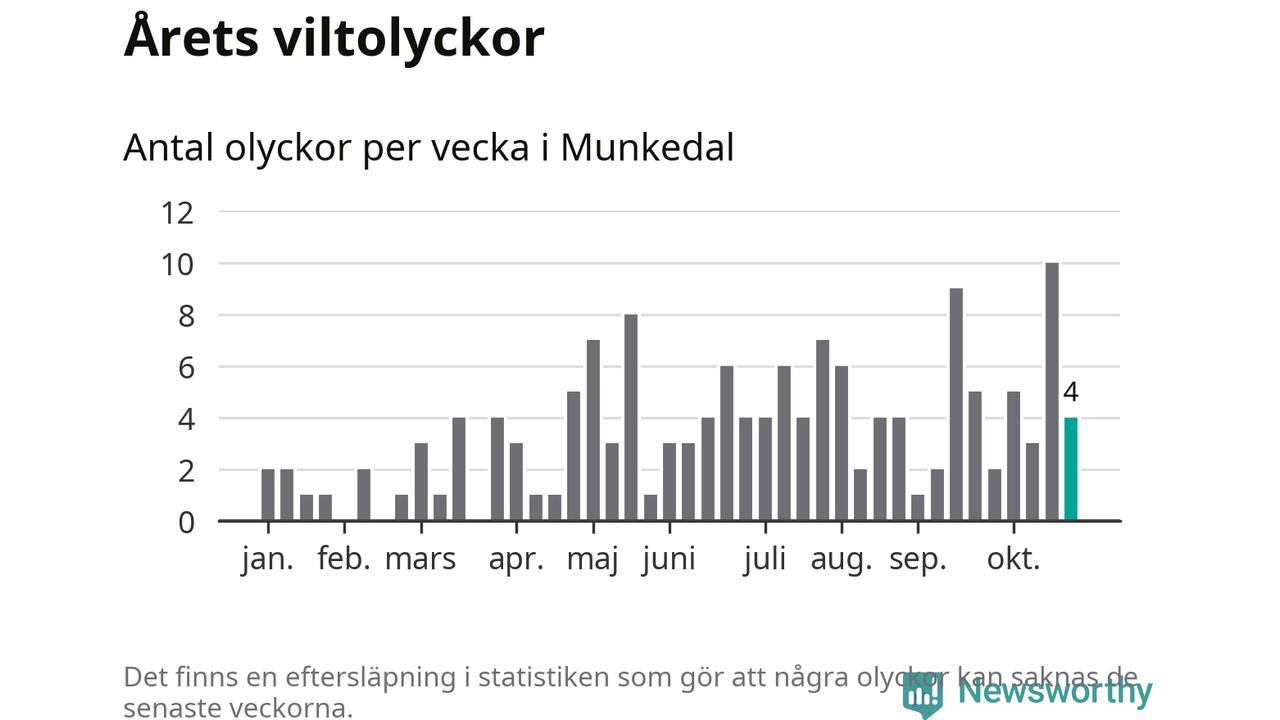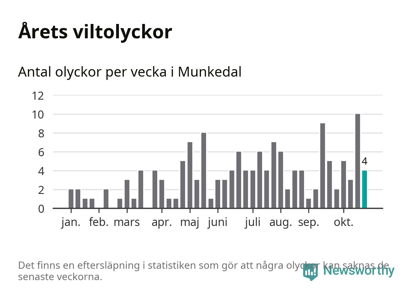 Hittills har fyra viltolyckor rapporterats in i Munkedals kommun från vecka 44. Se listan här.