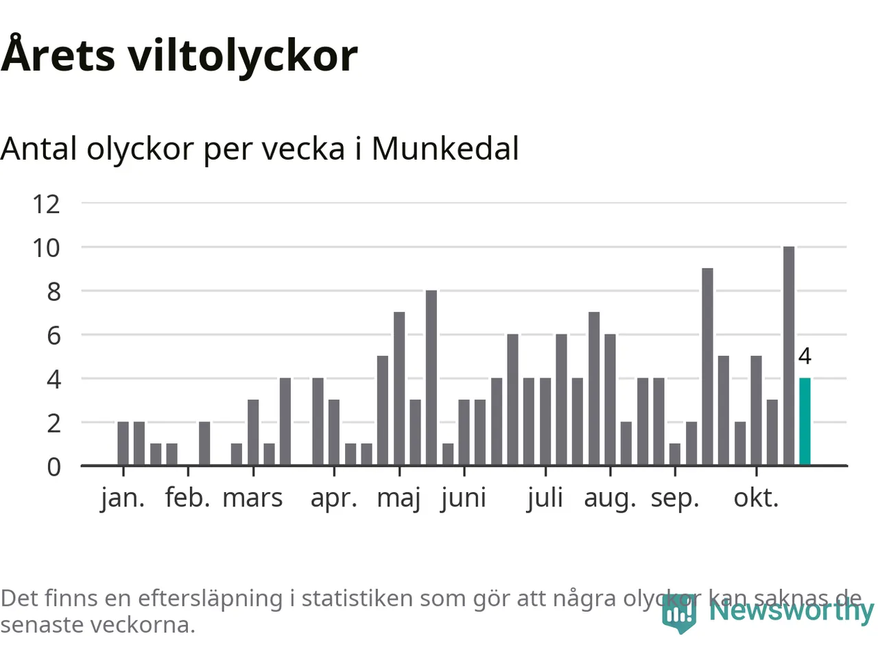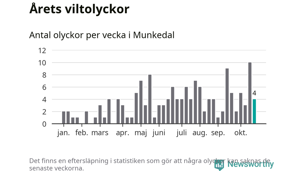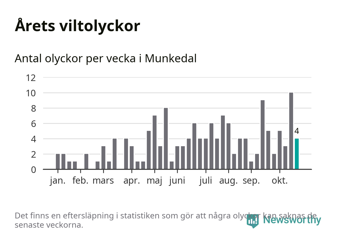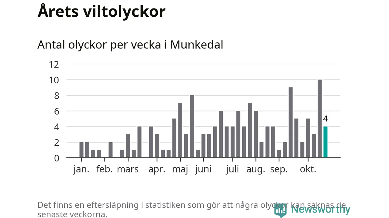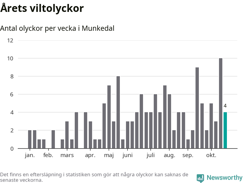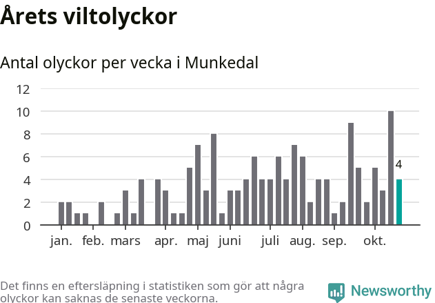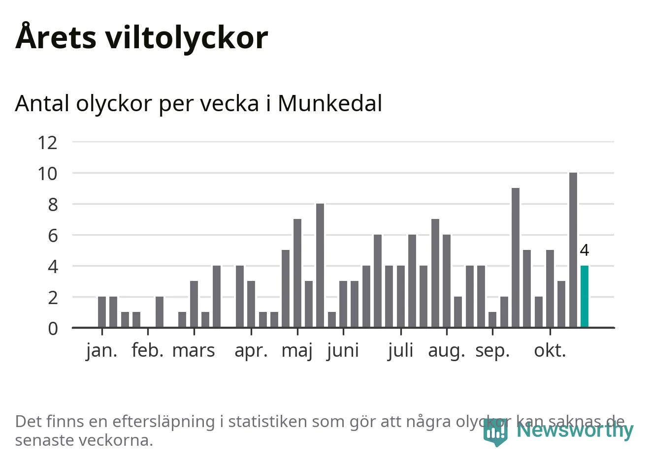 Totalt det här året har det inträffat 148 viltolyckor i kommunen. Det är mer än genomsnittet för motsvarande period (omkring 105) de senaste tio åren.