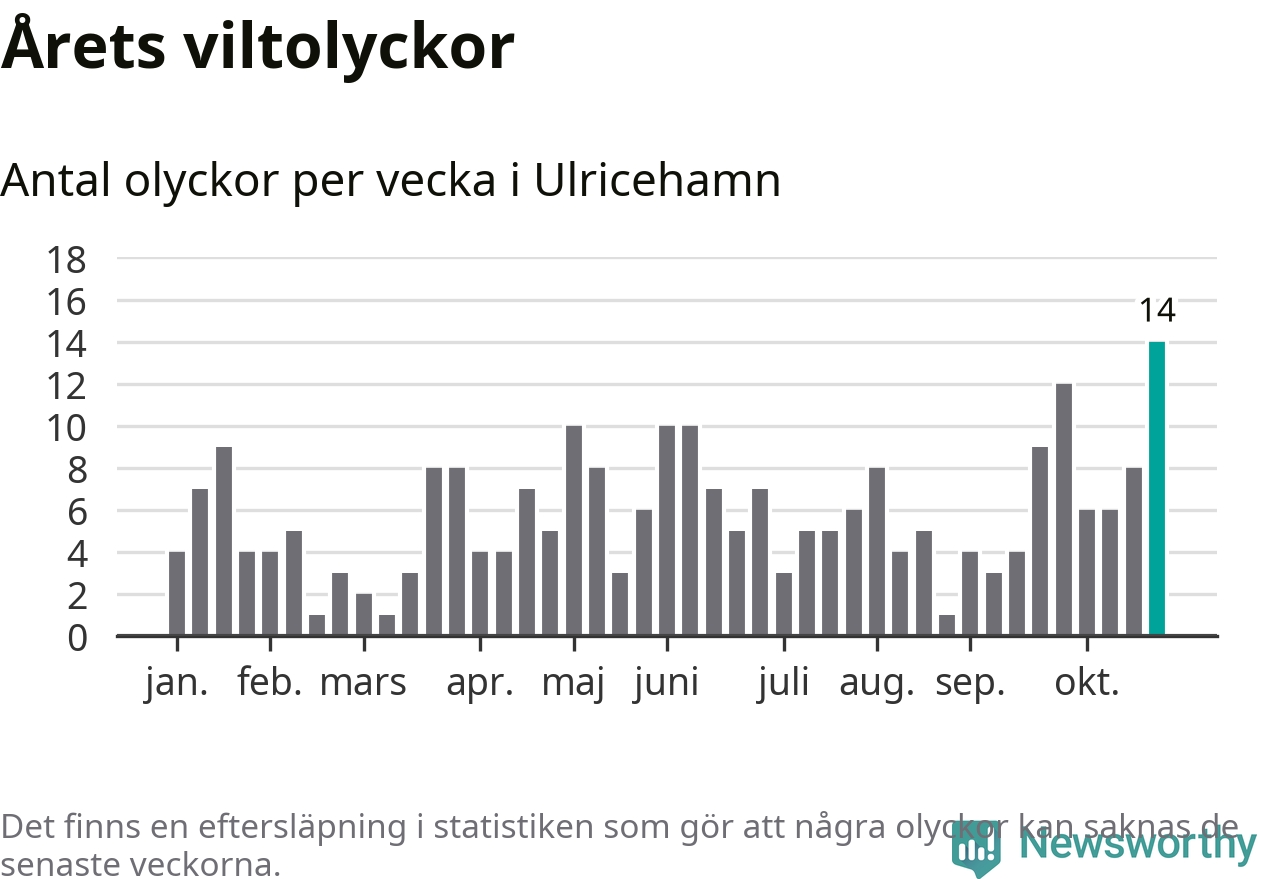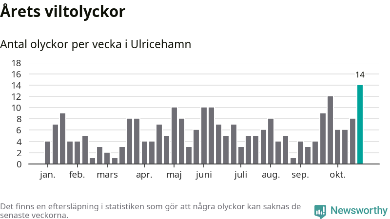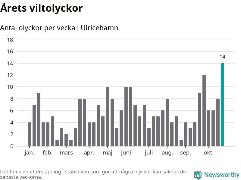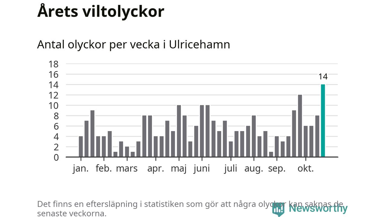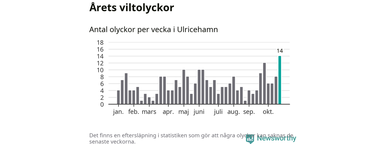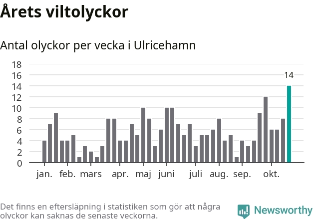 Under vecka 44 rapporterades 14 viltolyckor in i Ulricehamns kommun. Det är det största antalet på en enskild vecka hittills i år.
