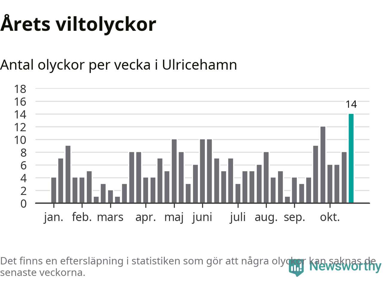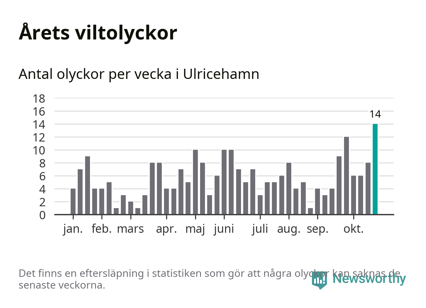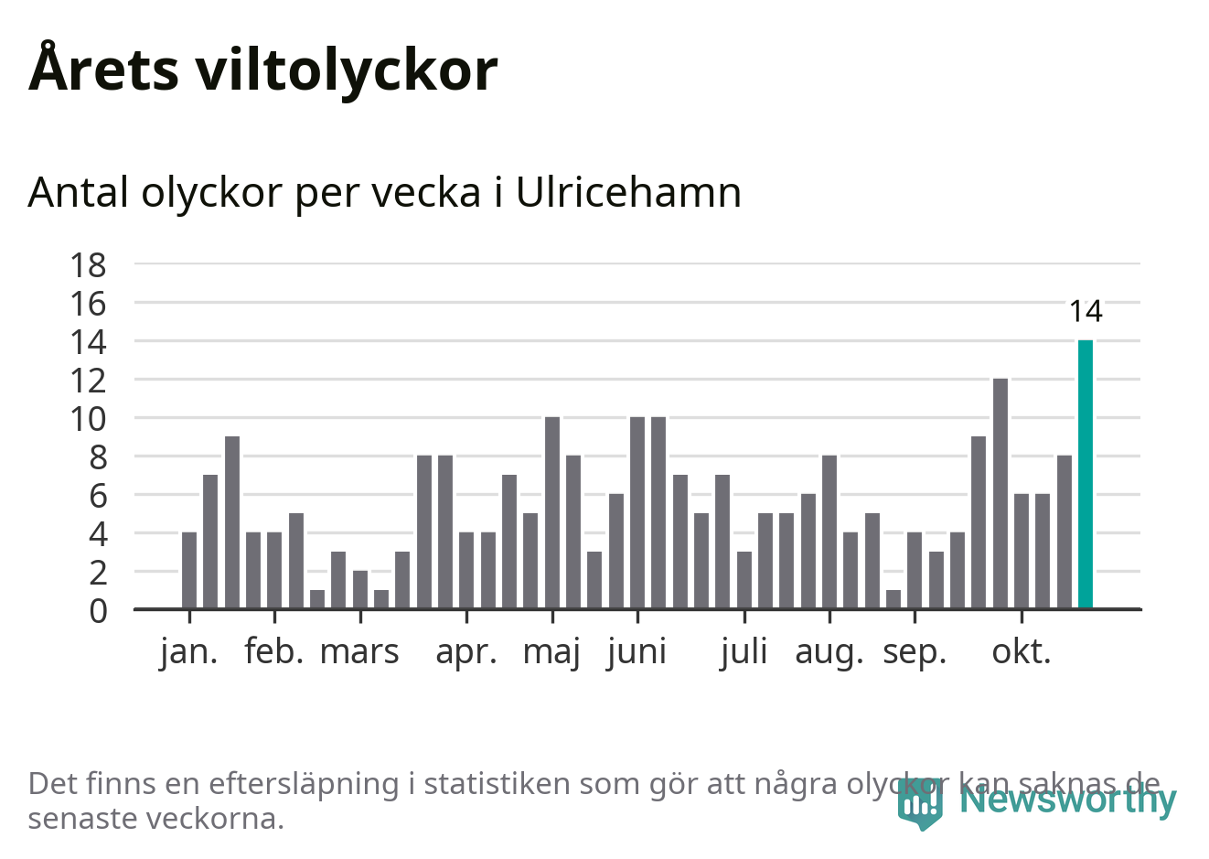 Under vecka 44 rapporterades 14 viltolyckor in i Ulricehamns kommun. Det är det största antalet på en enskild vecka hittills i år.