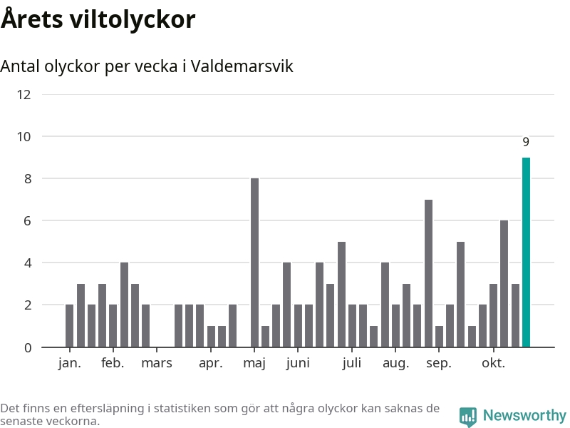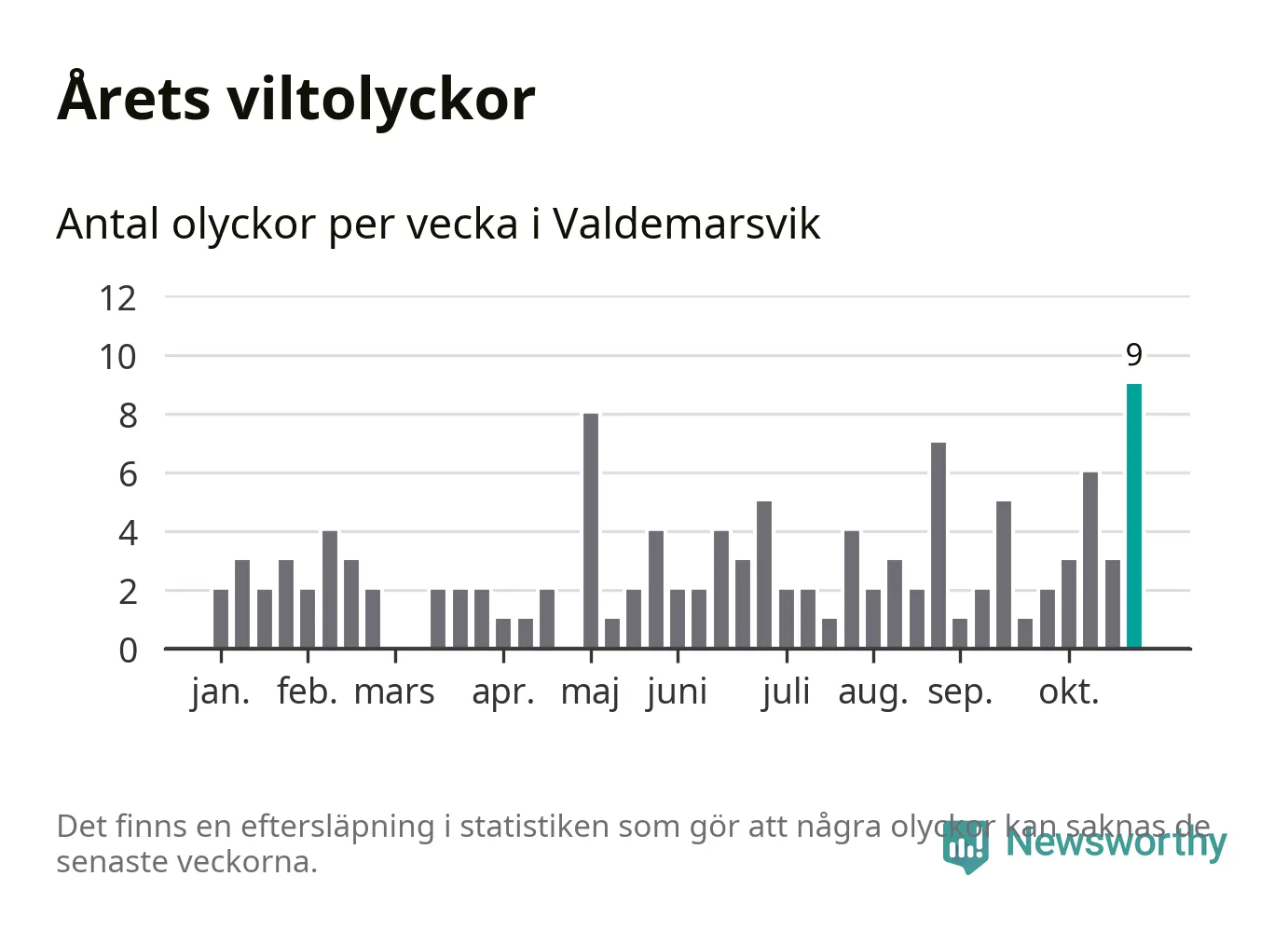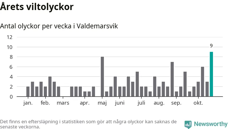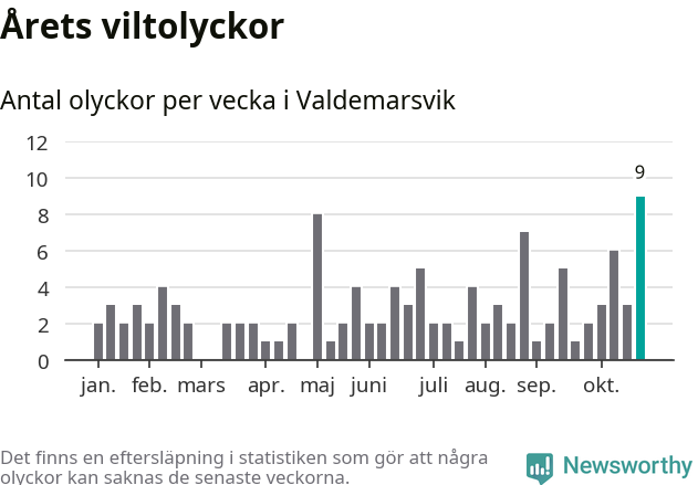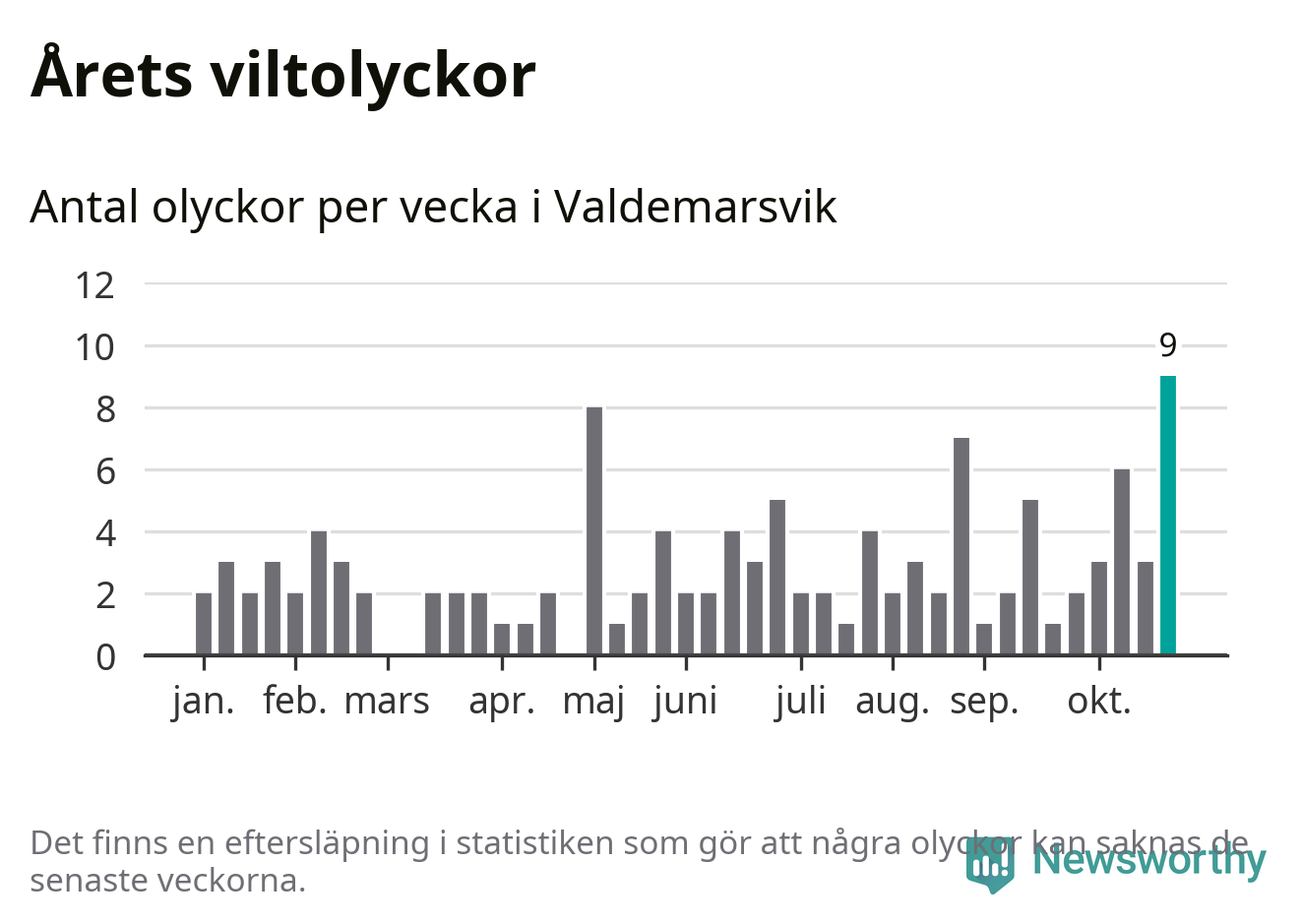 Under vecka 44 rapporterades nio viltolyckor in i Valdemarsviks kommun. Det är det största antalet på en enskild vecka hittills i år.