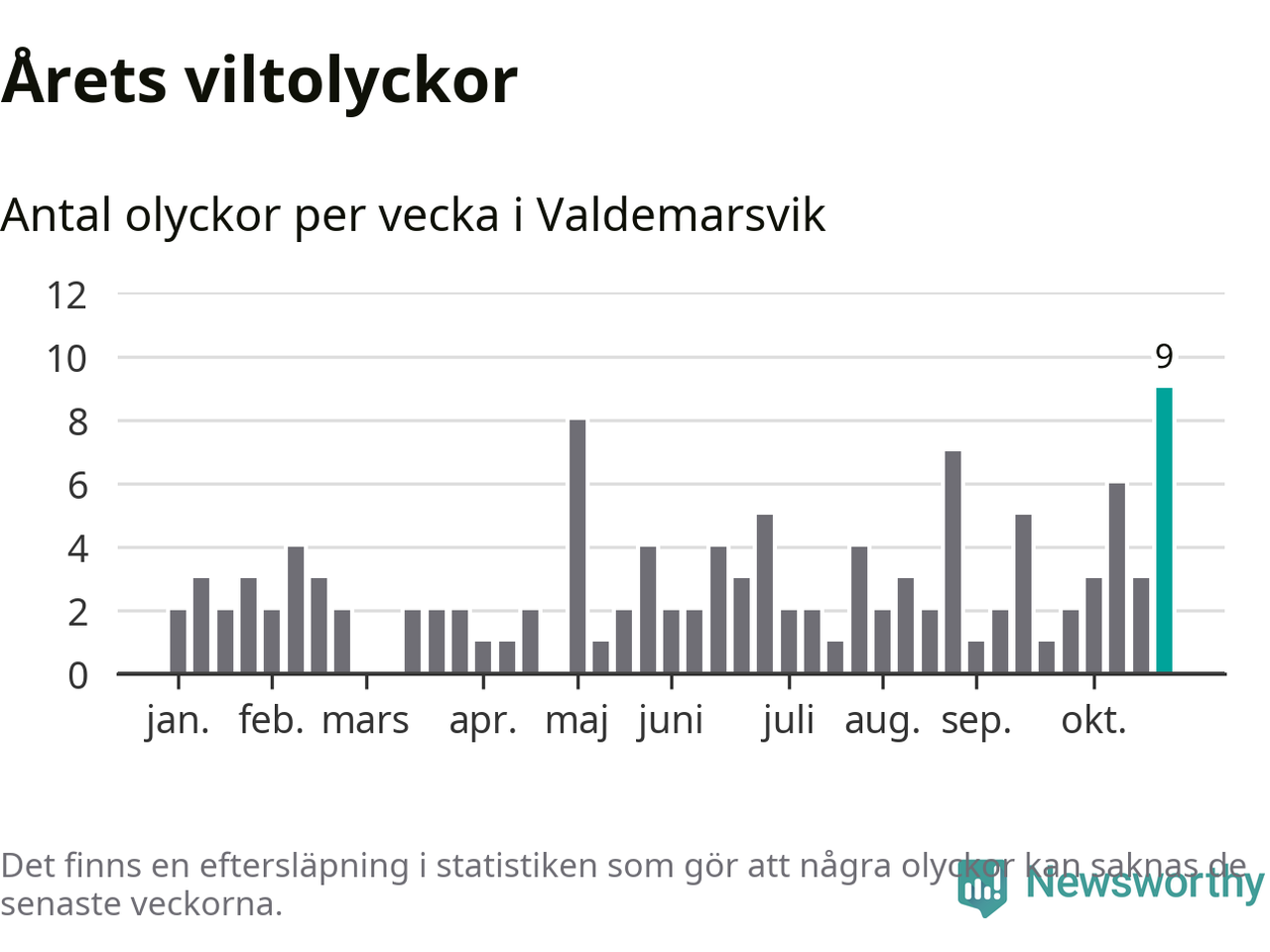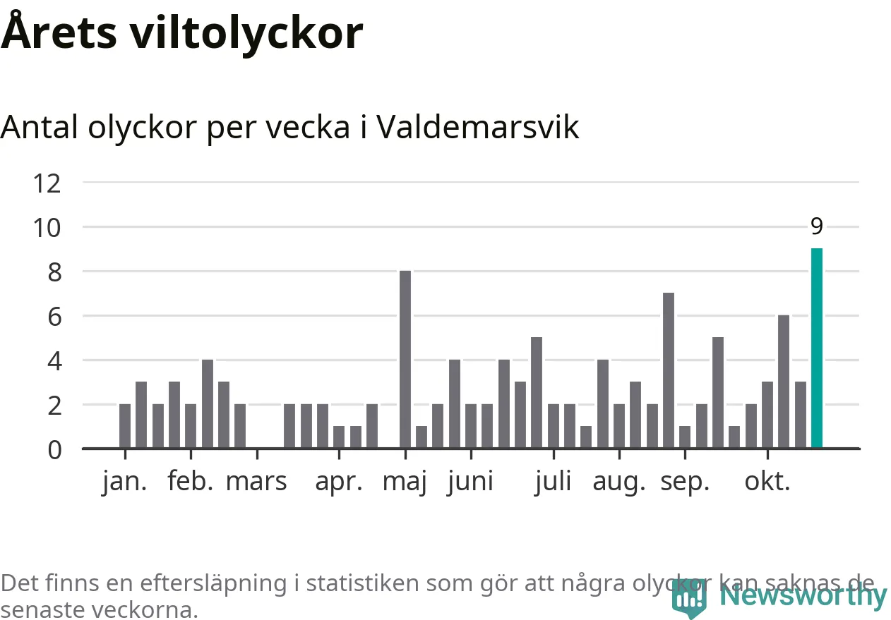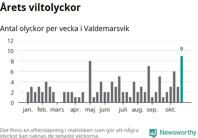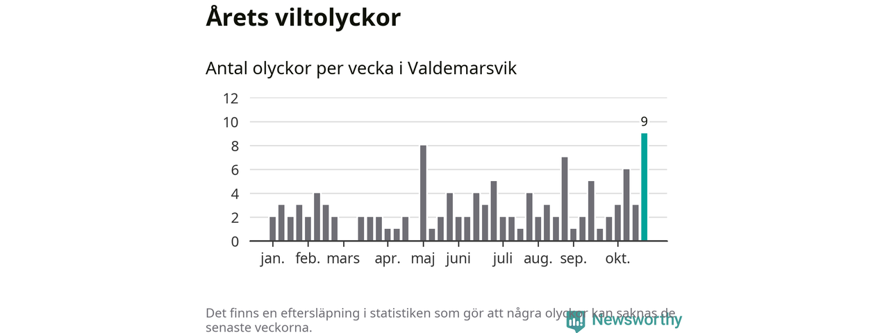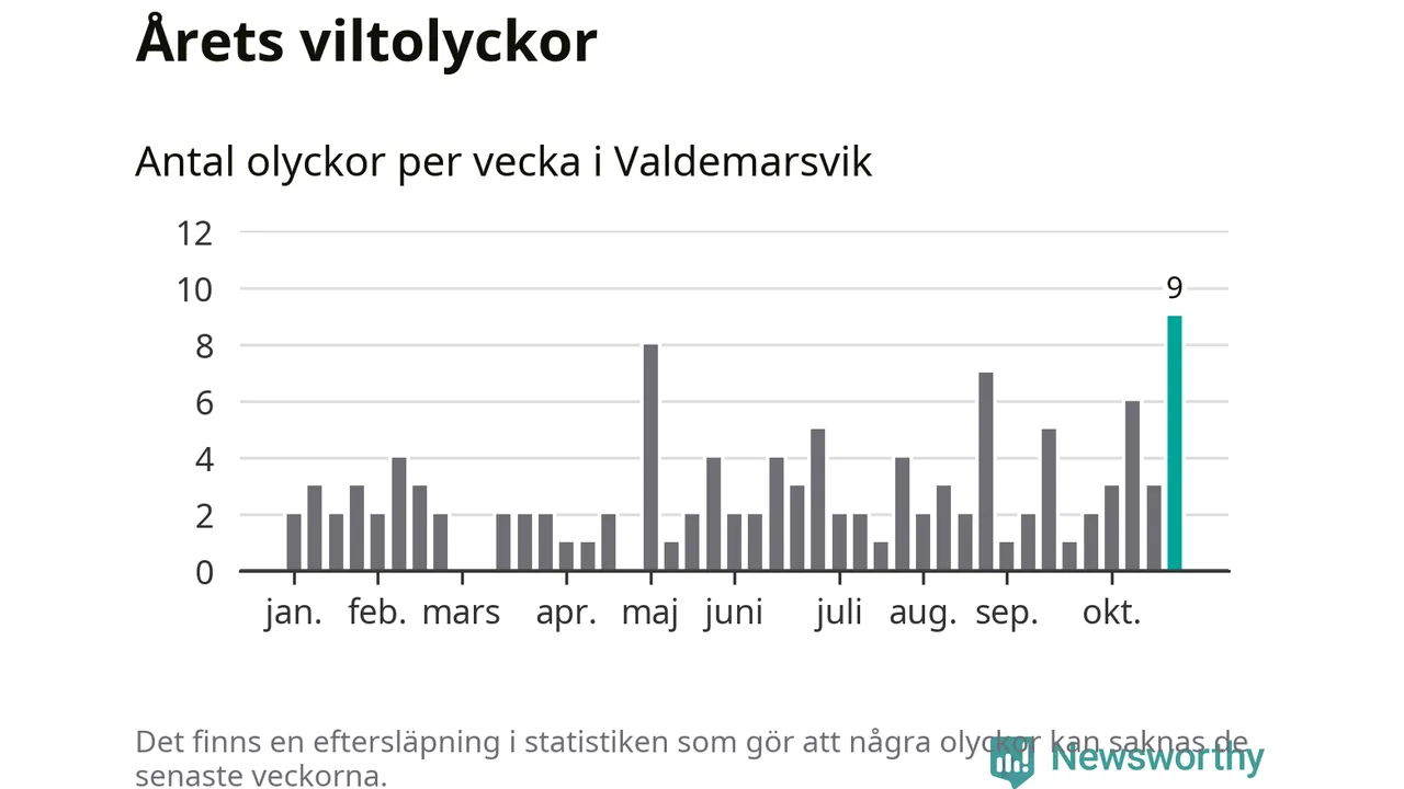 Under vecka 44 rapporterades nio viltolyckor in i Valdemarsviks kommun. Det är det största antalet på en enskild vecka hittills i år.