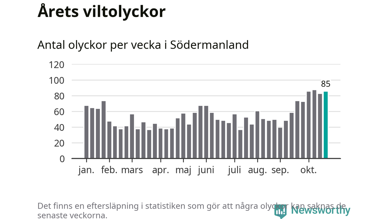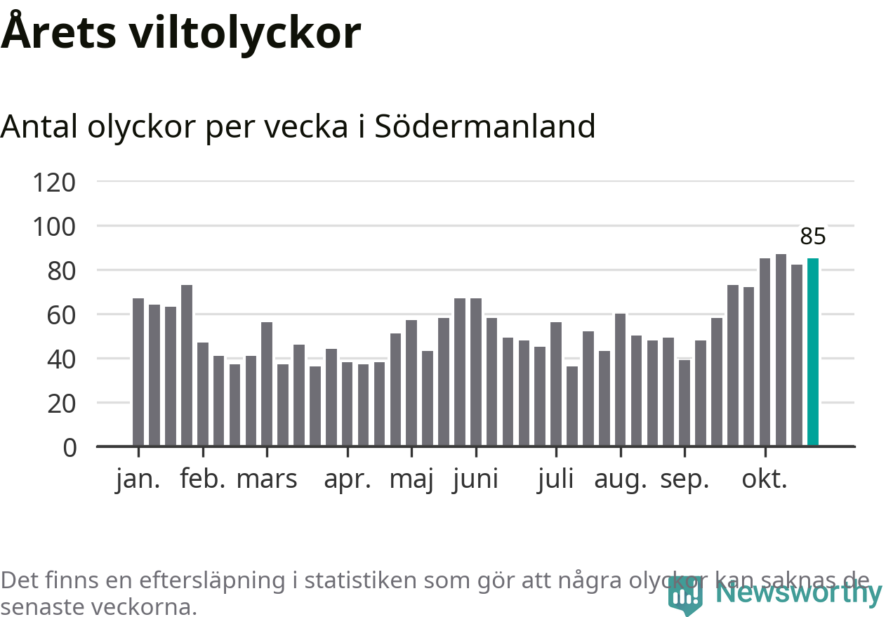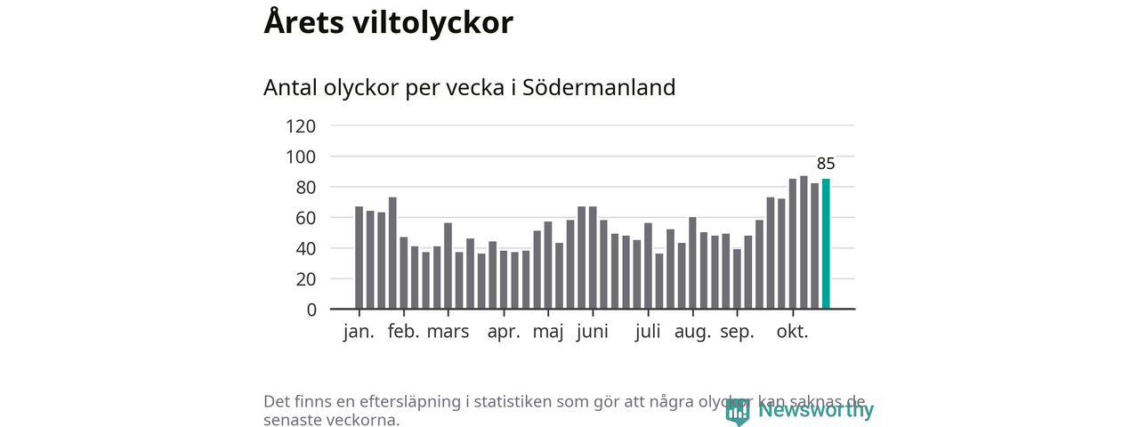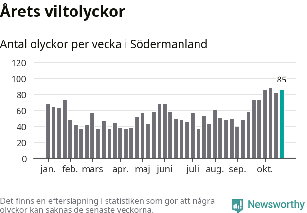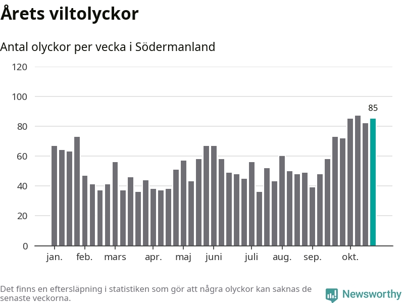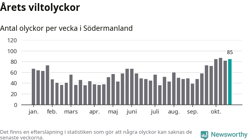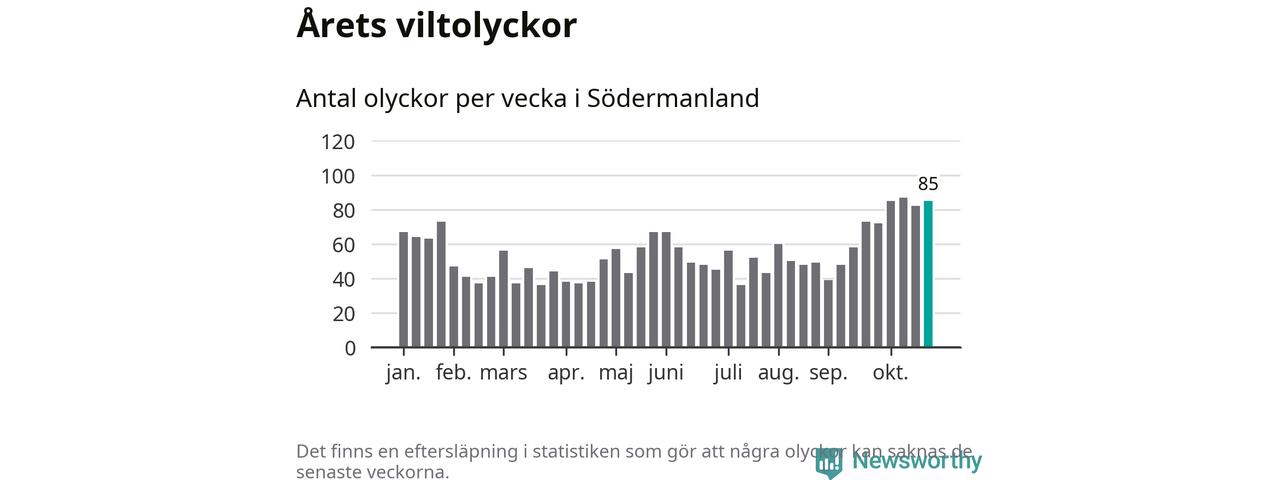 Hittills har 85 viltolyckor rapporterats in i Södermanlands län från vecka 44. Se listan här.