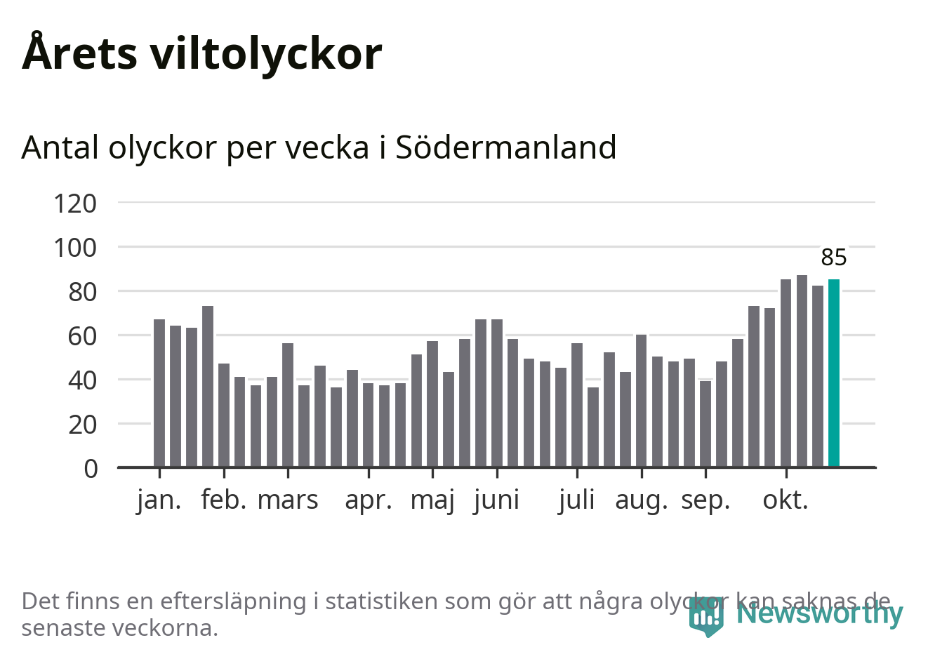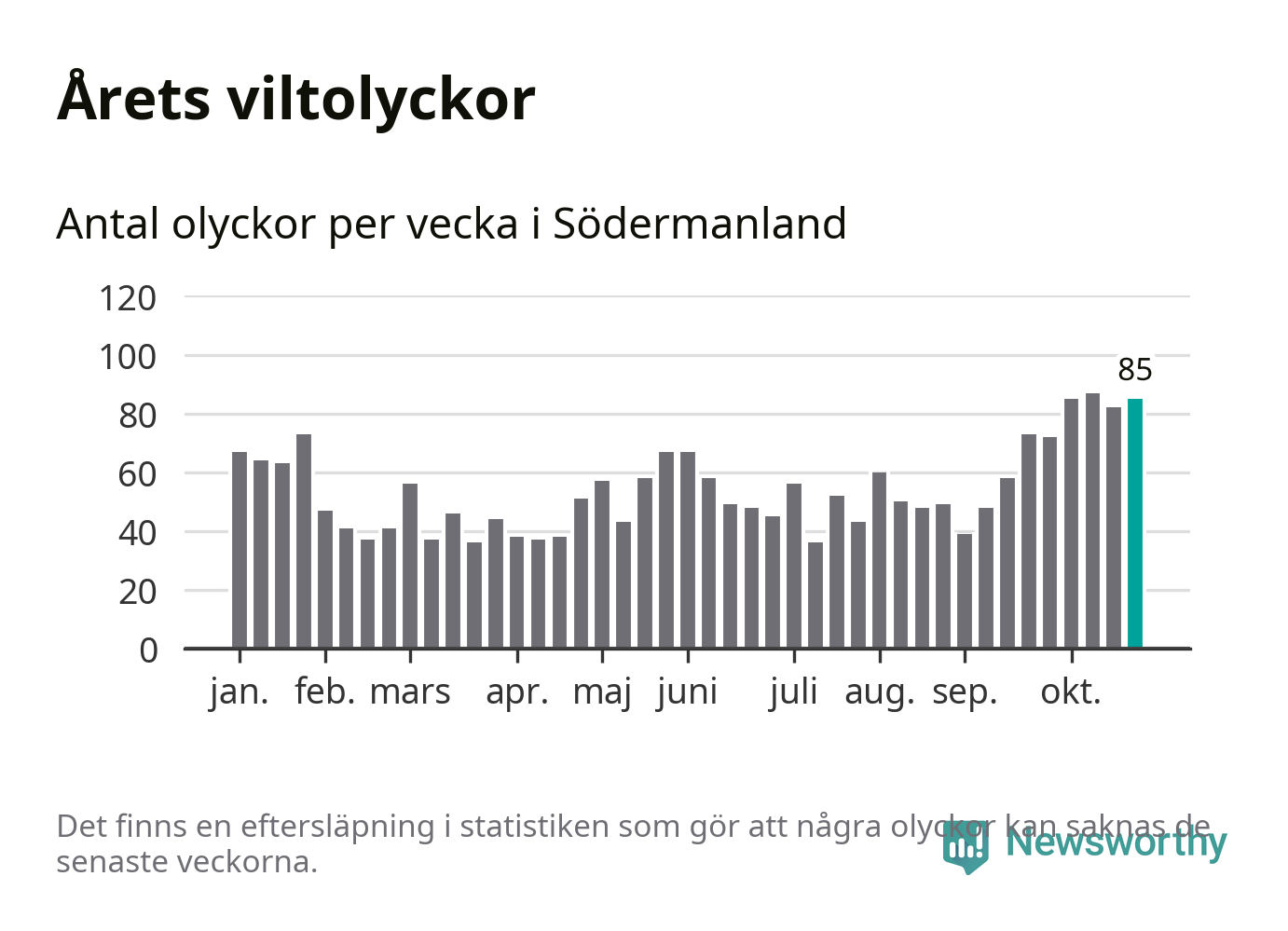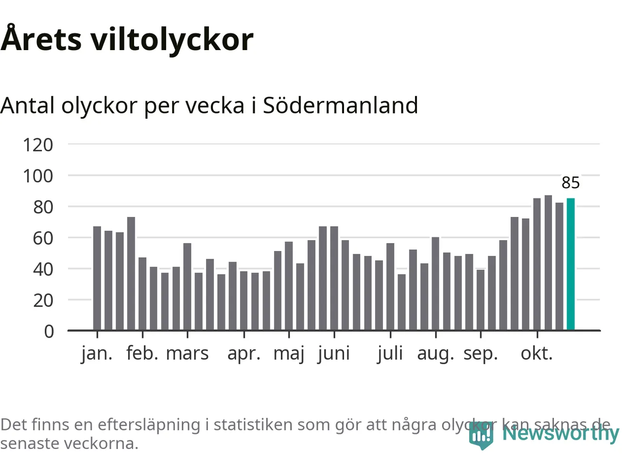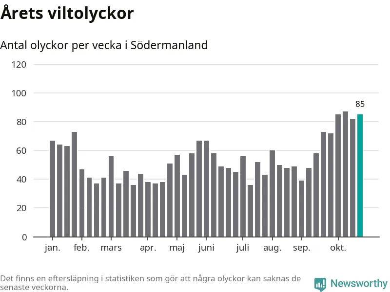 Hittills har 85 viltolyckor rapporterats in i Södermanlands län från vecka 44. Se listan här.