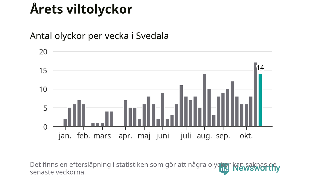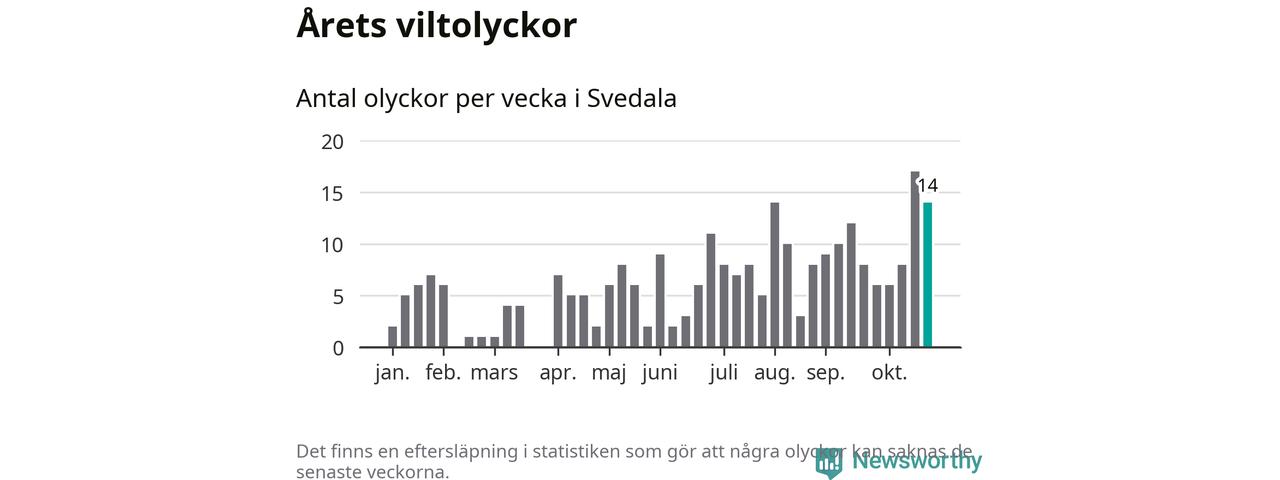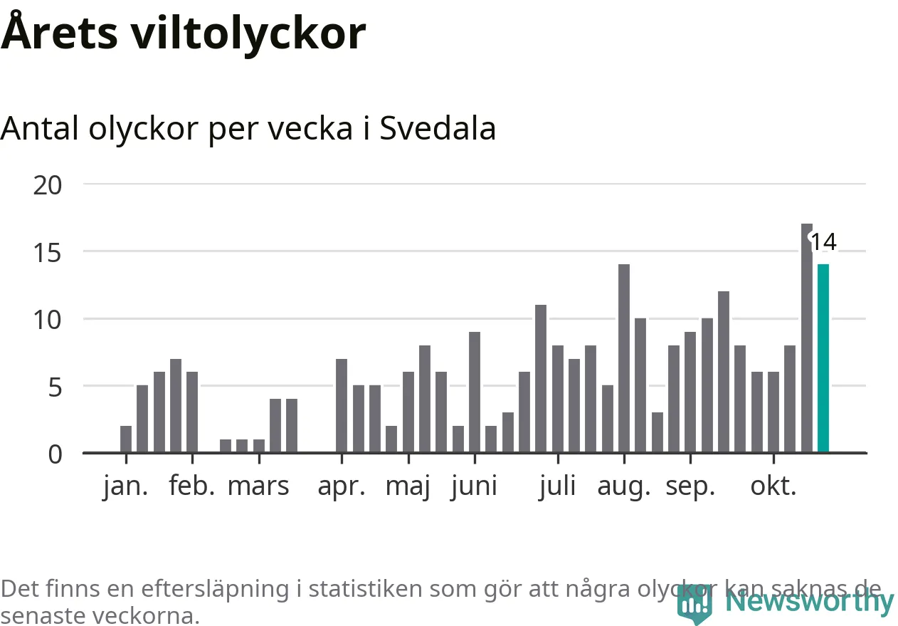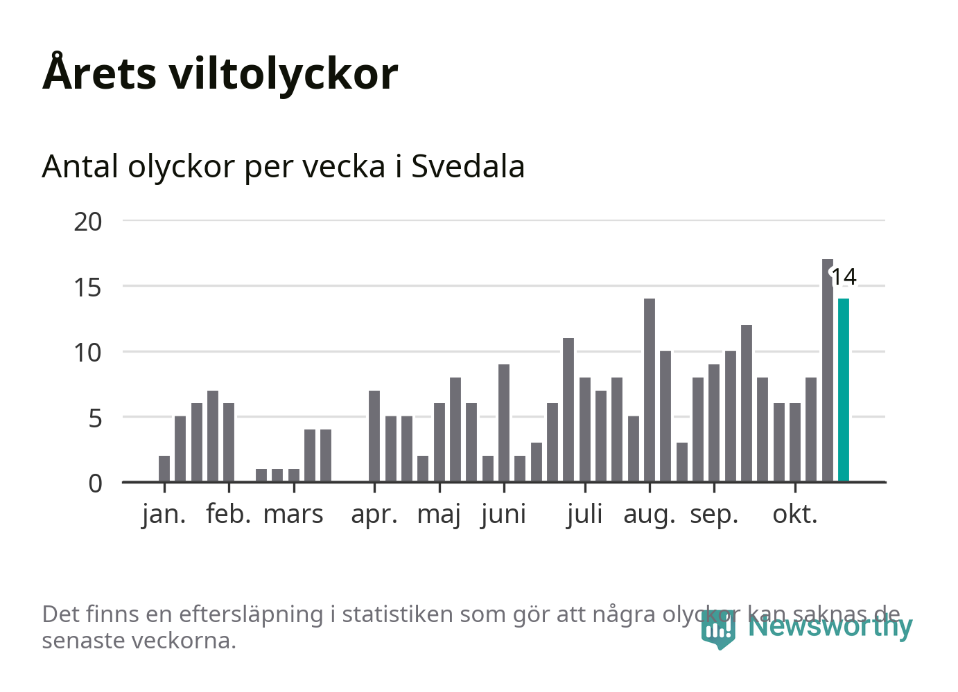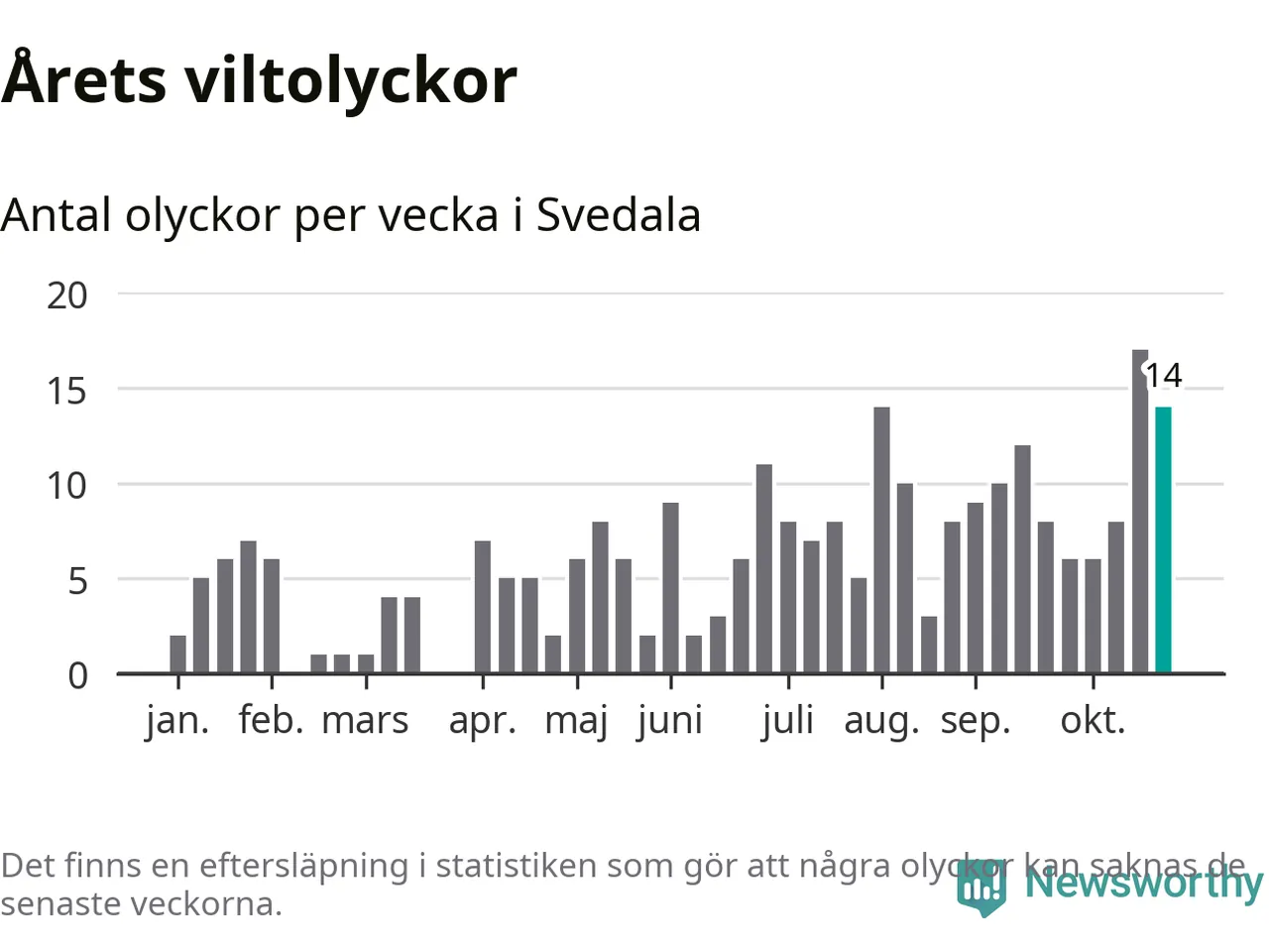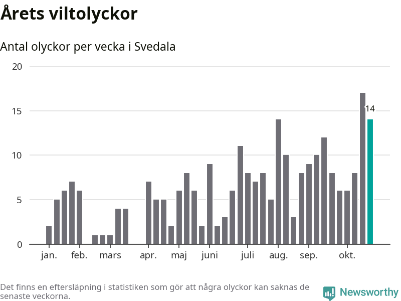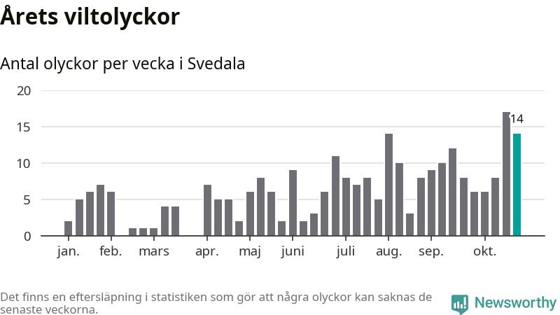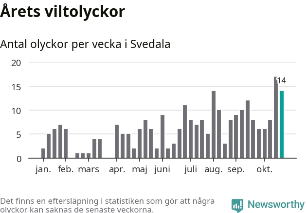 14 olyckor på en enda vecka är också ovanligt många. Bara nio gånger tidigare sedan 2015 har det skett