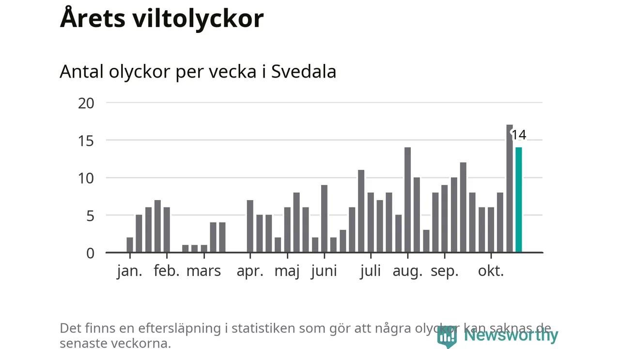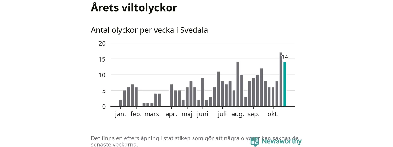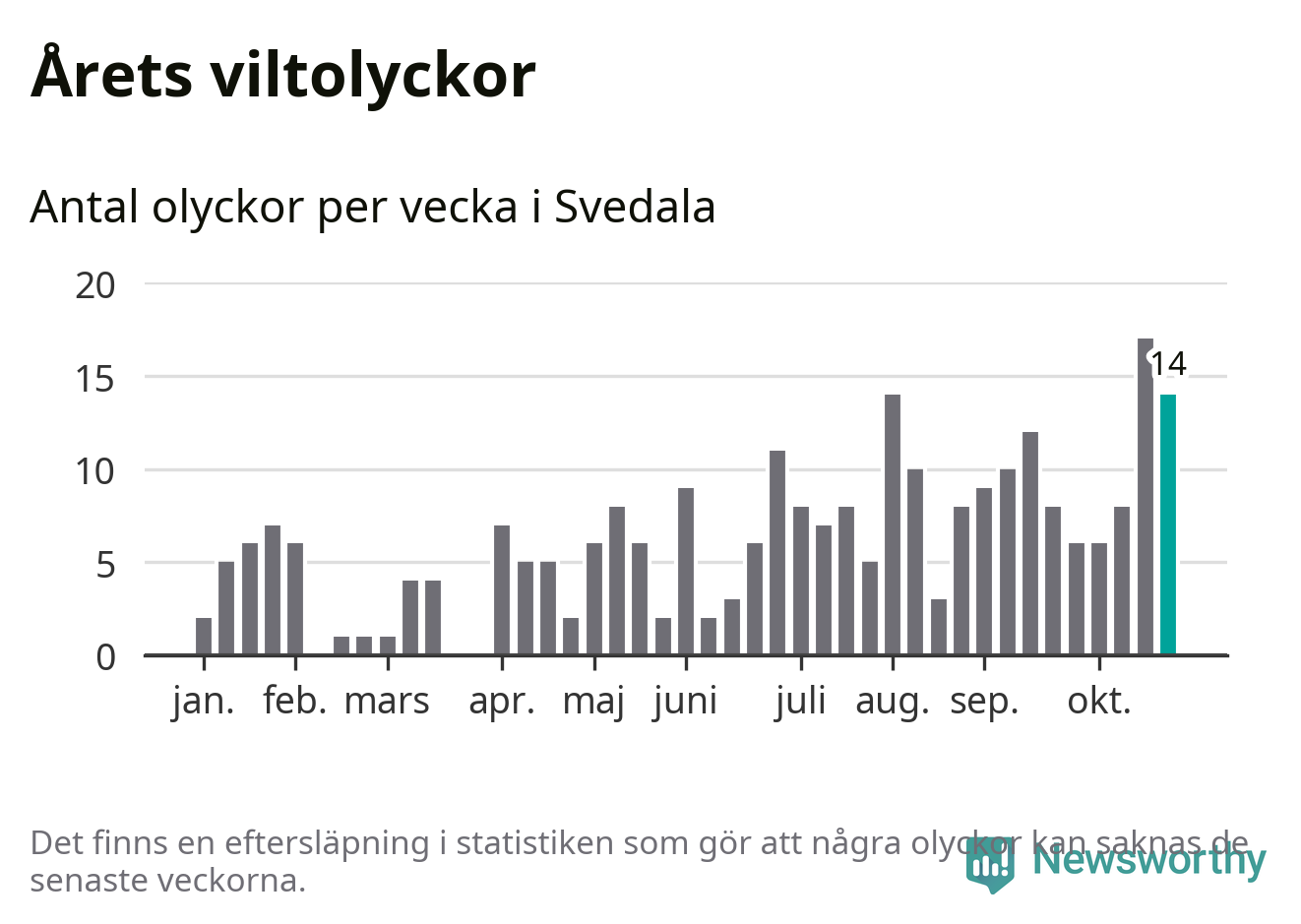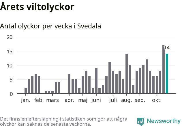 263 viltolyckor i kommunen. Det är mer än genomsnittet för motsvarande period (omkring 233) de senaste tio åren.