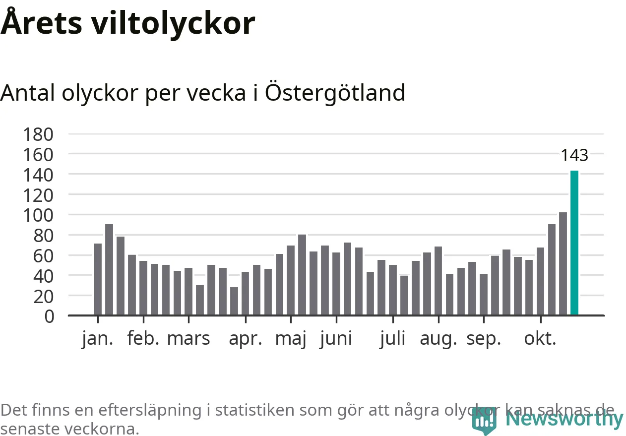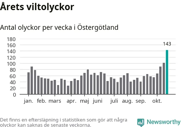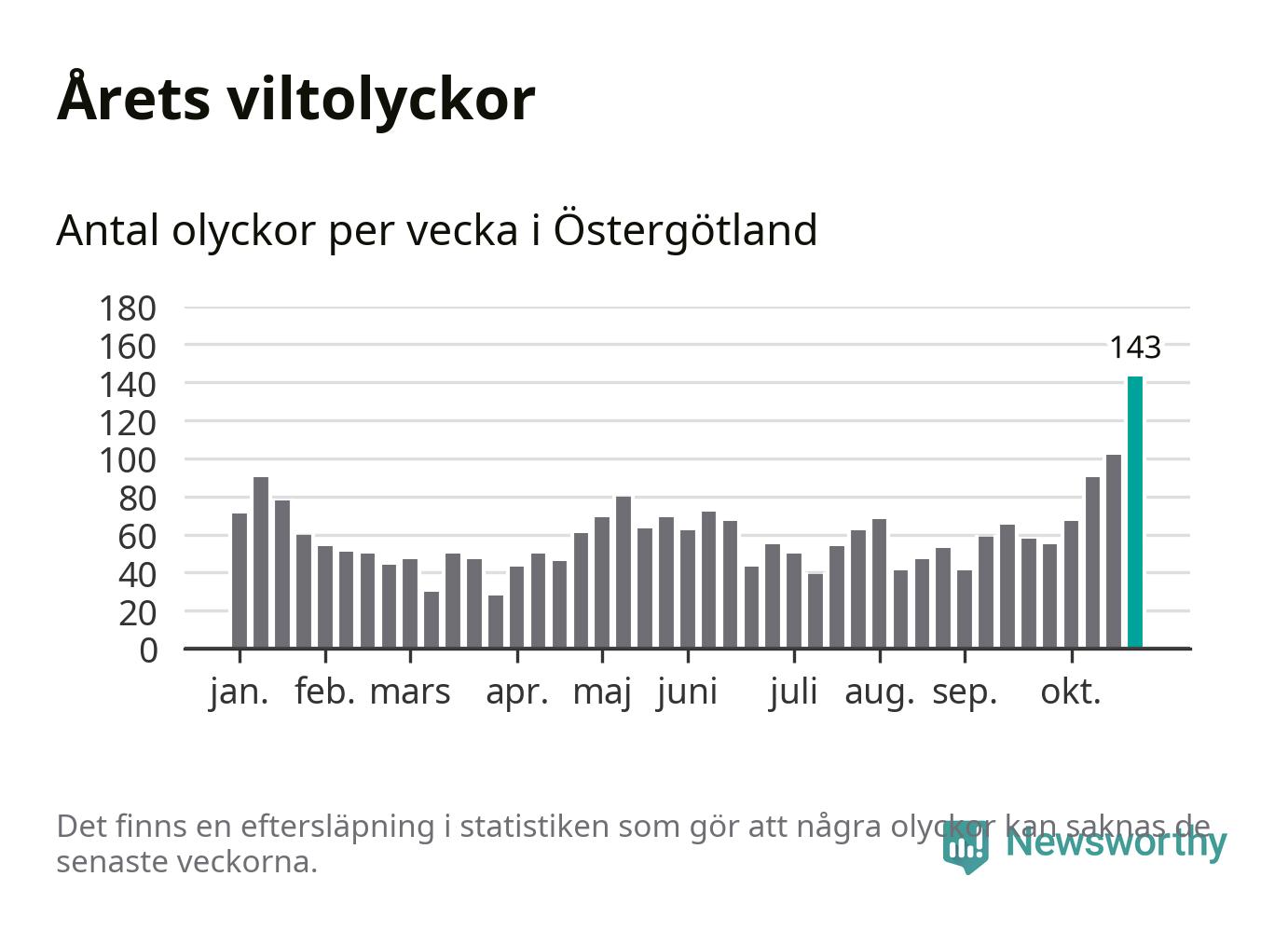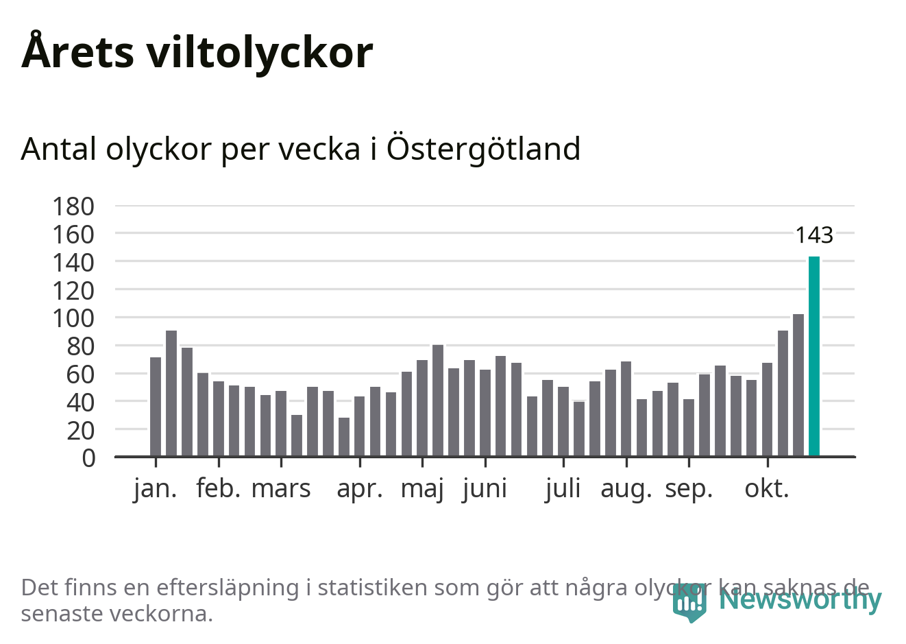 Under vecka 44 rapporterades 143 viltolyckor in i Östergötlands län. Det är det största antalet på en enskild vecka hittills i år.