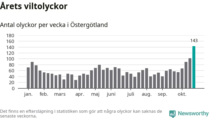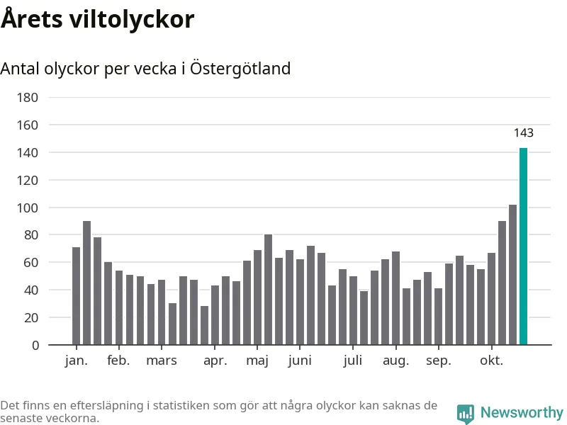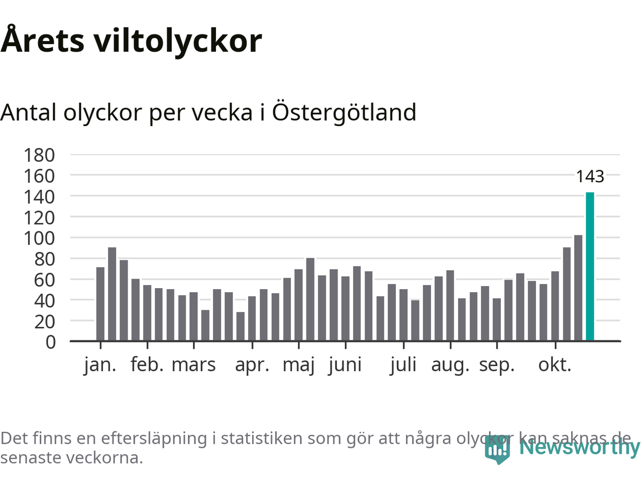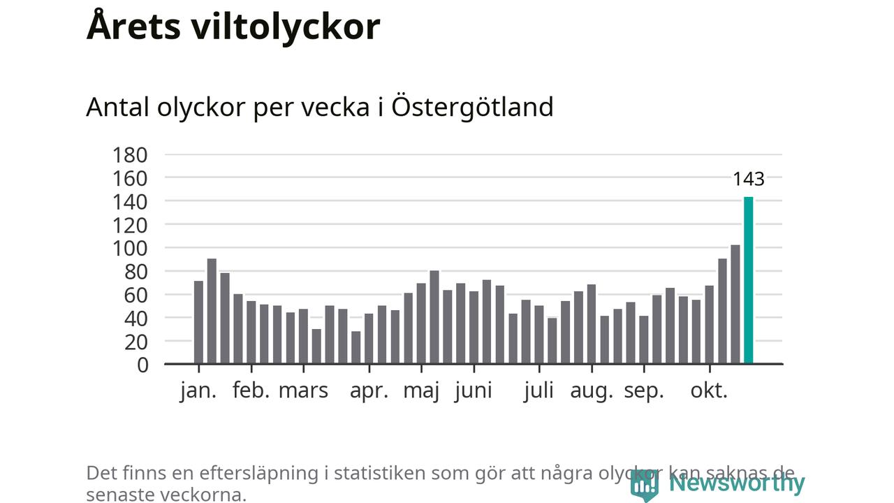 Under vecka 44 rapporterades 143 viltolyckor in i Östergötlands län. Det är det största antalet på en enskild vecka hittills i år.