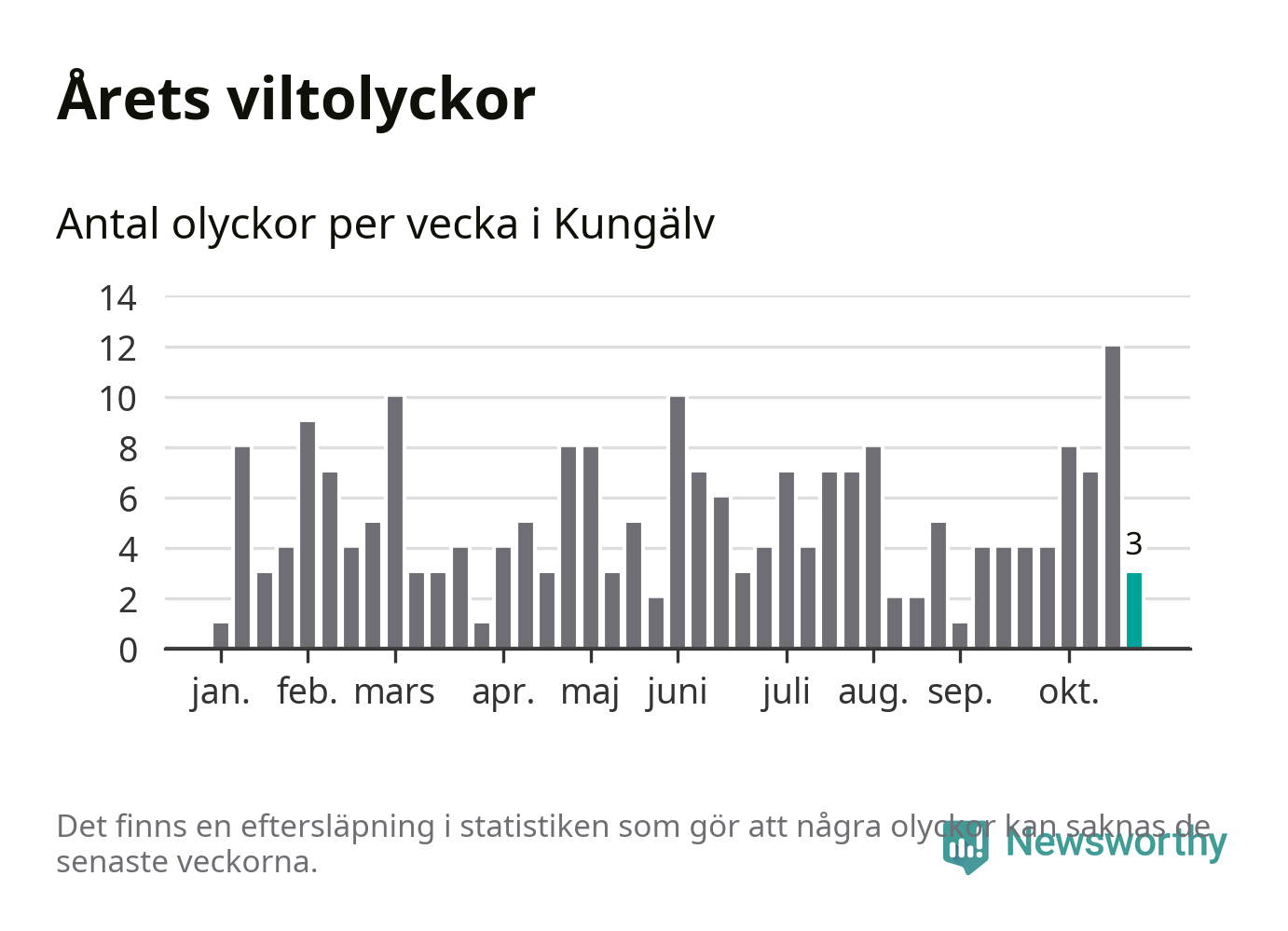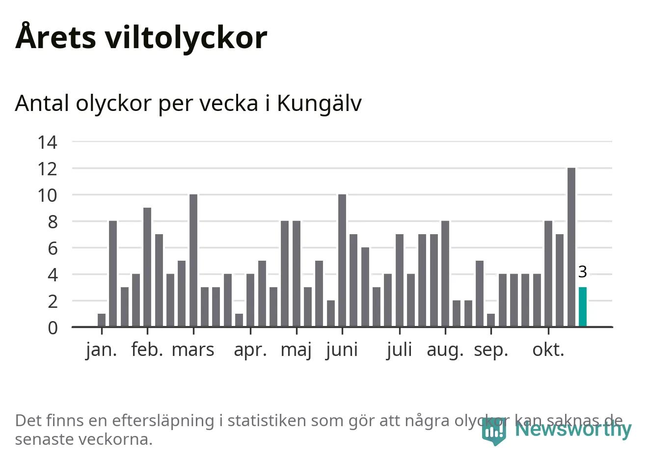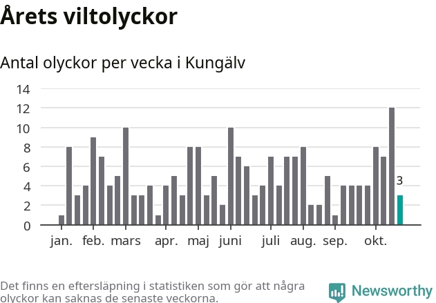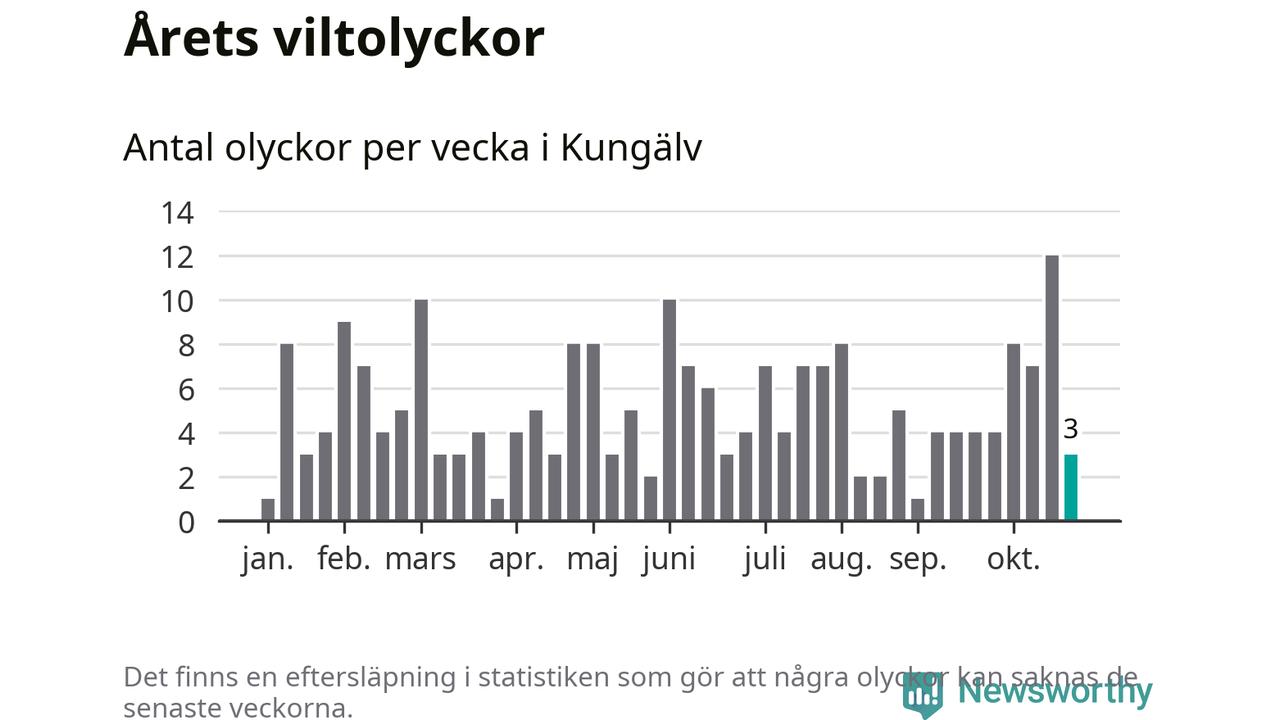 Hittills har tre viltolyckor rapporterats in i Kungälvs kommun från vecka 44. Se listan här.