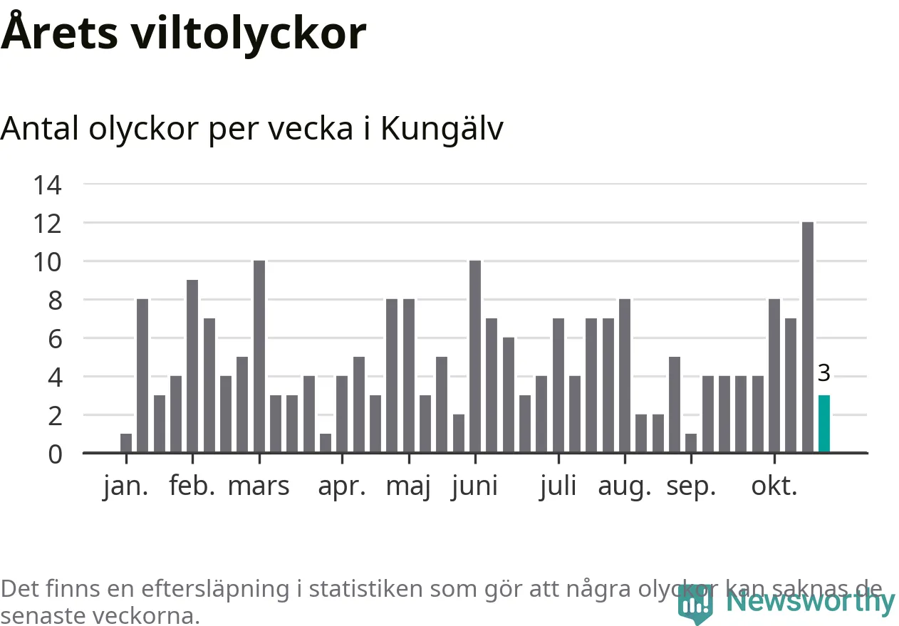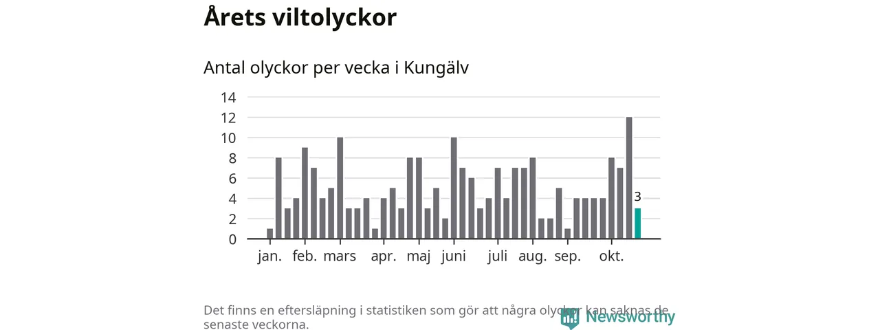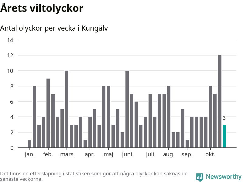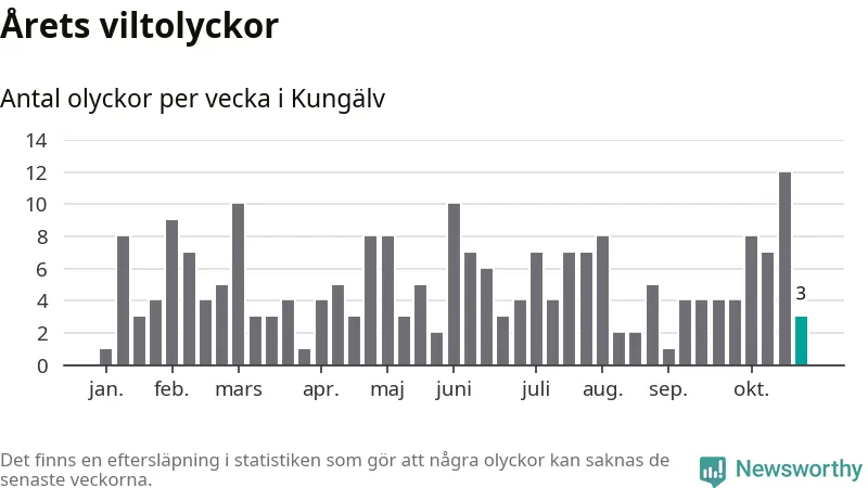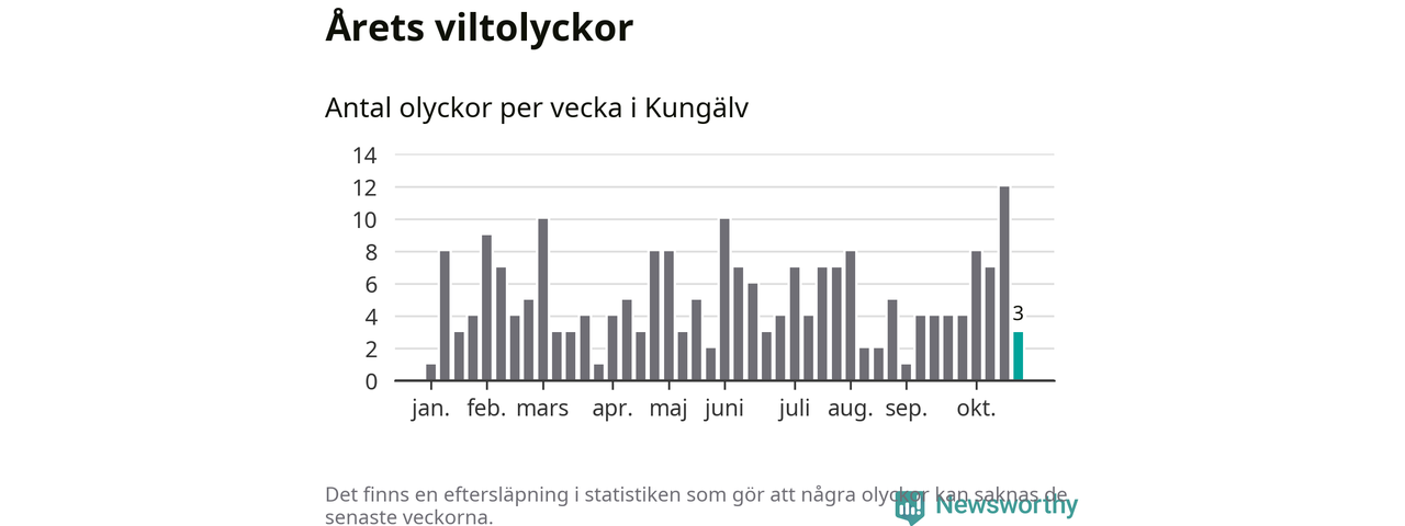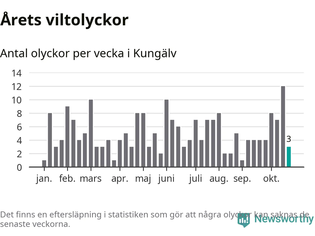 Hittills har tre viltolyckor rapporterats in i Kungälvs kommun från vecka 44. Se listan här.