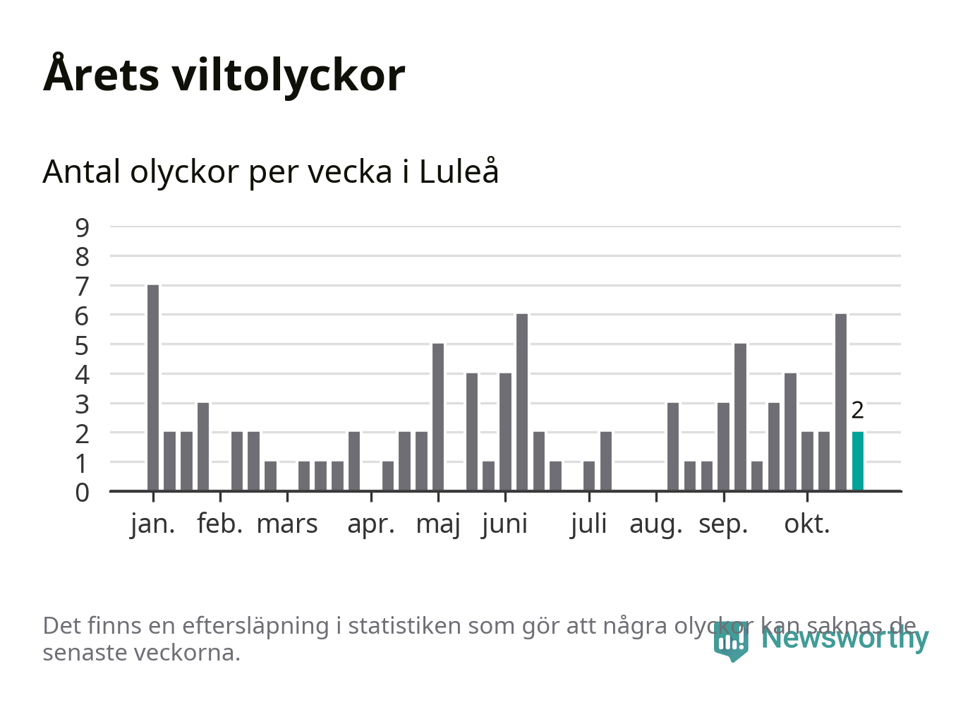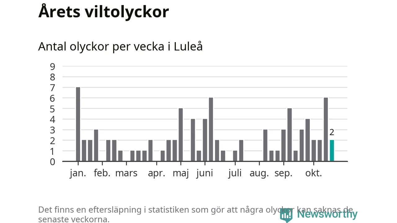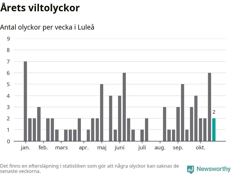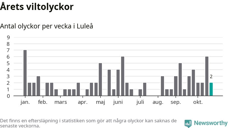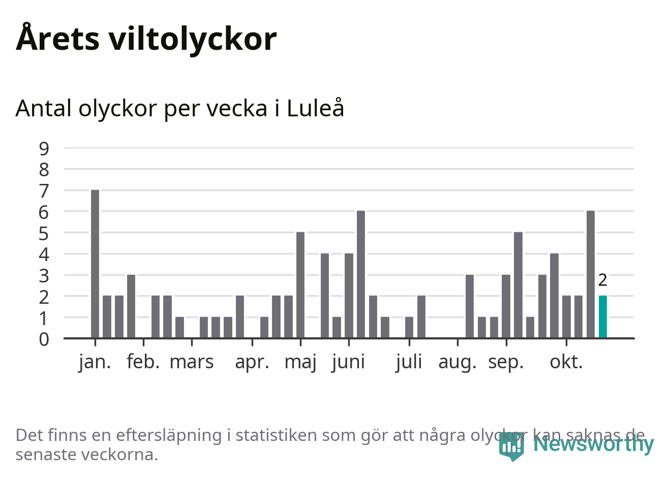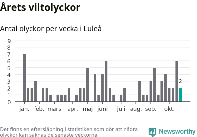 Hittills har två viltolyckor rapporterats in i Luleå kommun från vecka 44. Se listan här.