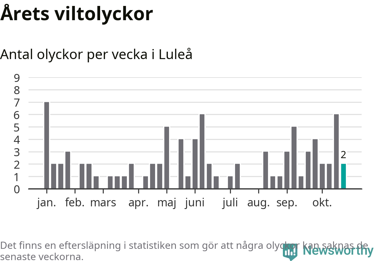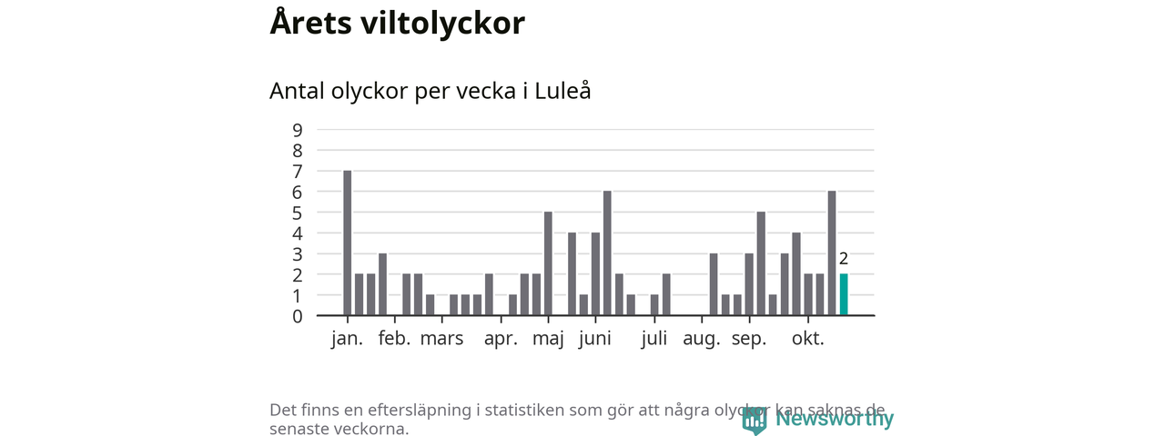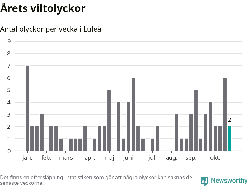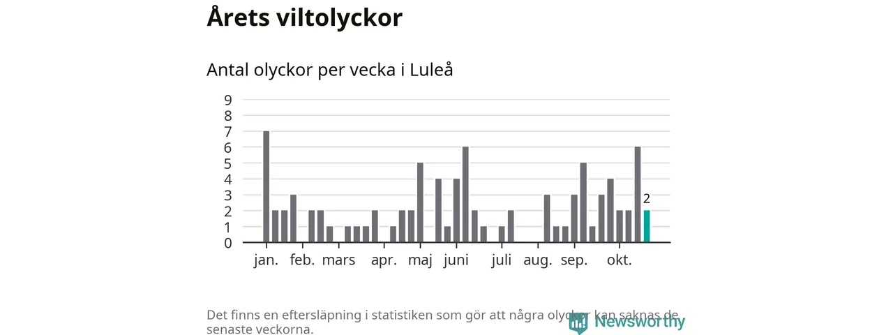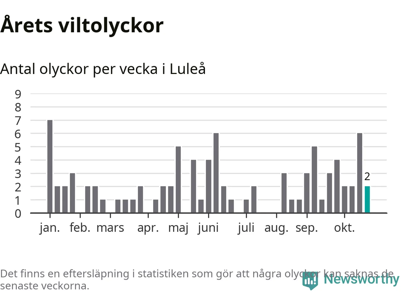 Hittills har två viltolyckor rapporterats in i Luleå kommun från vecka 44. Se listan här.