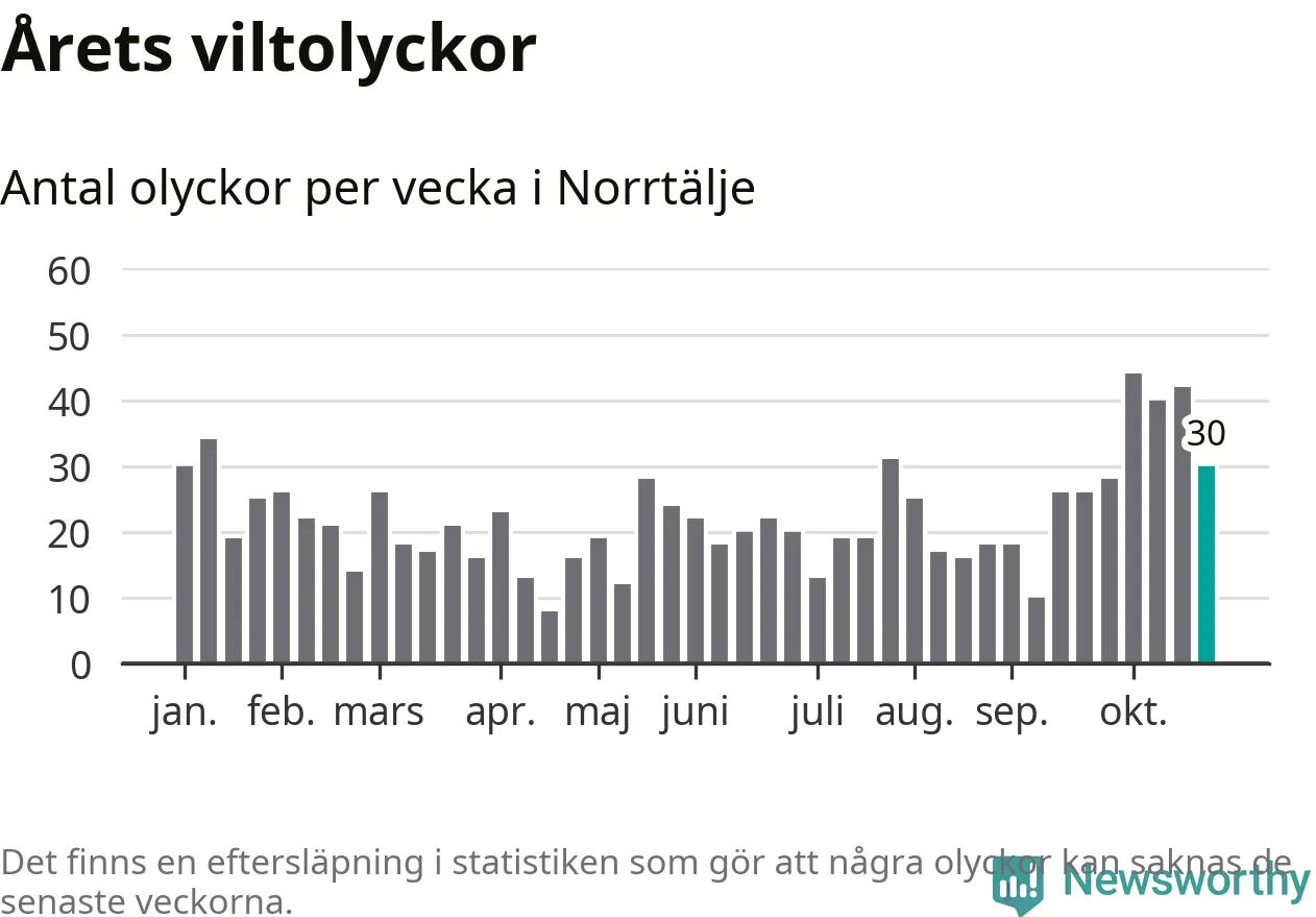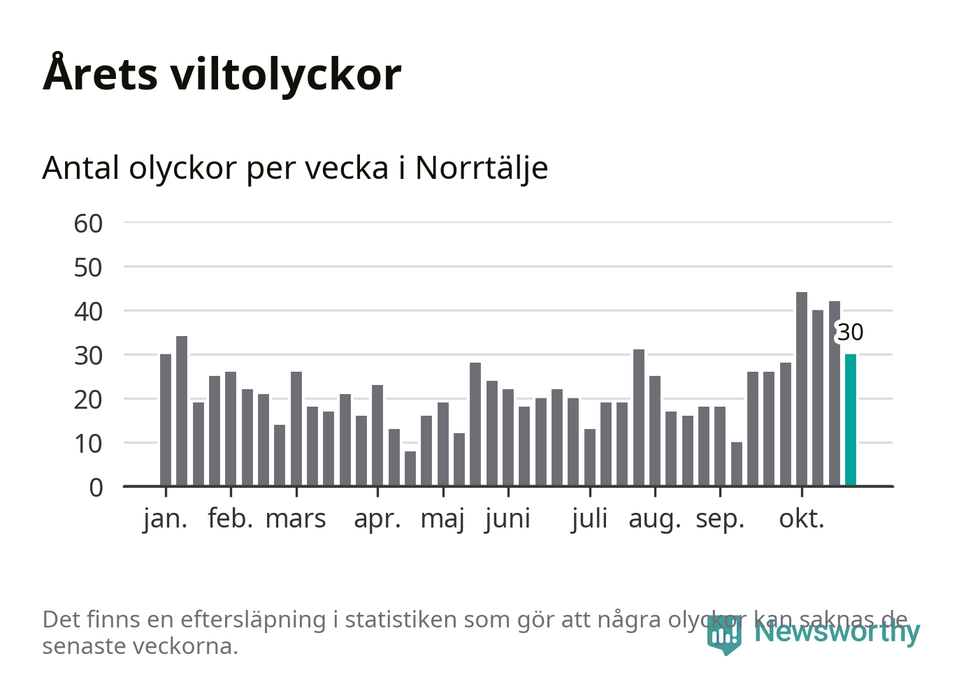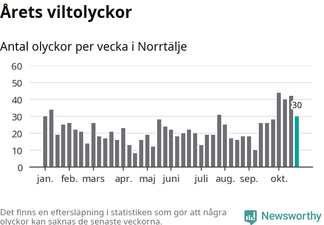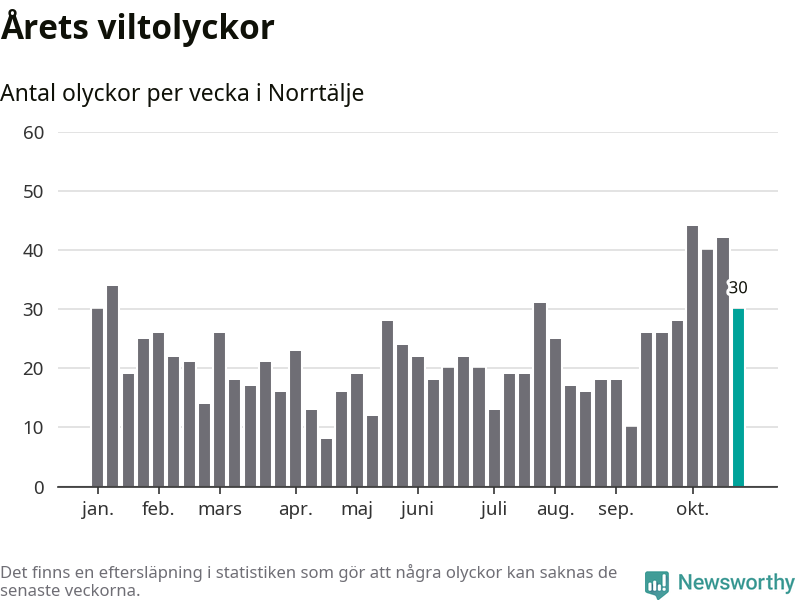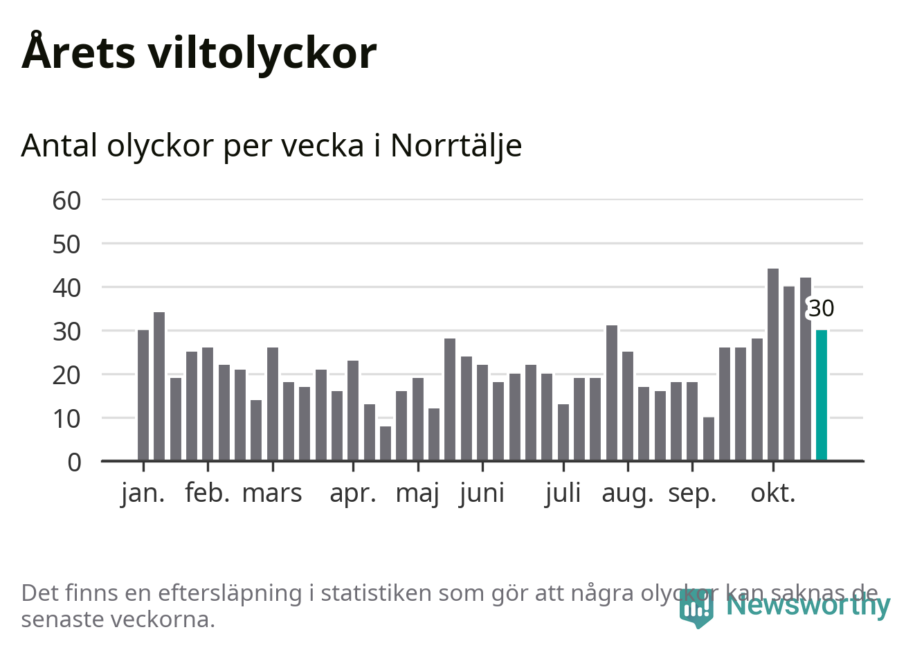 Hittills har 30 viltolyckor rapporterats in i Norrtälje kommun från vecka 44. Se listan här.