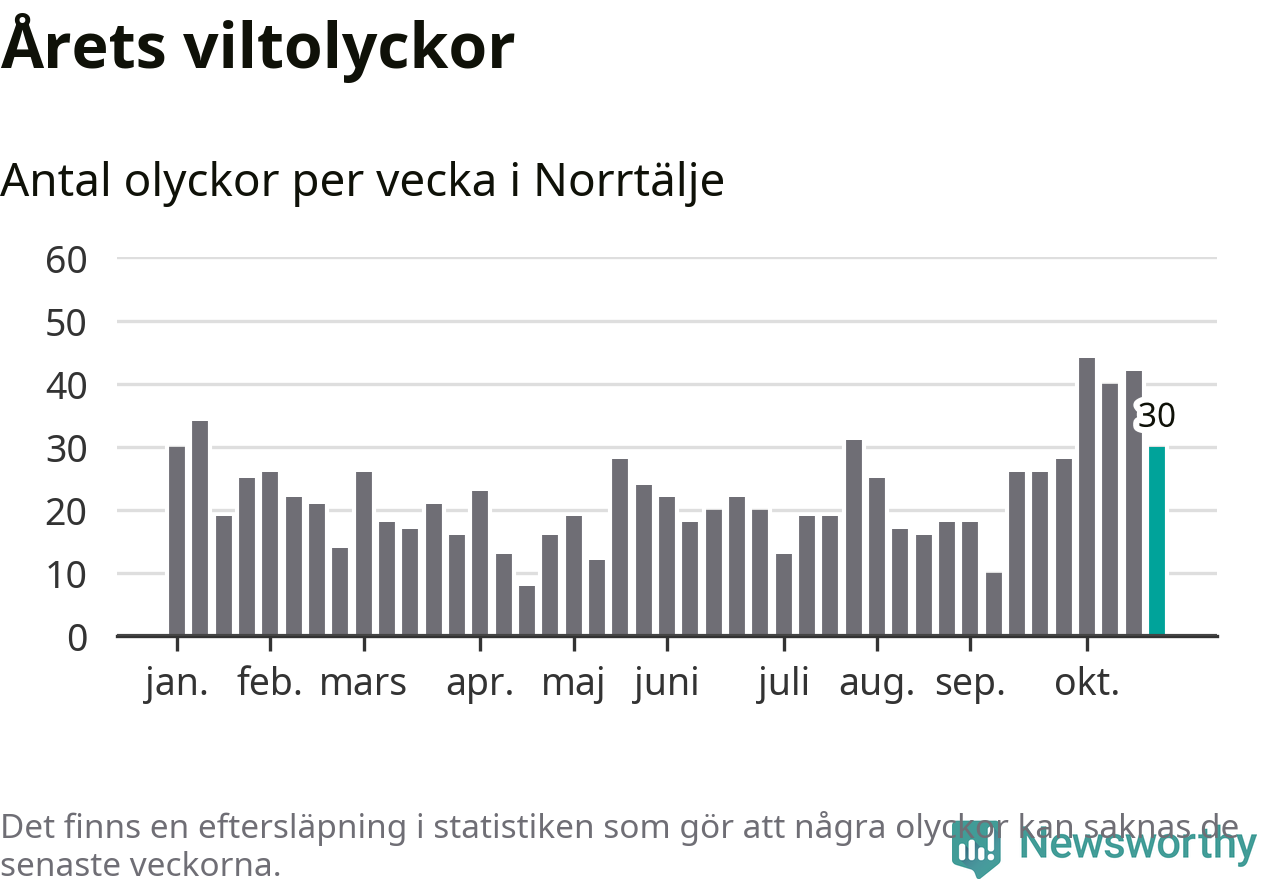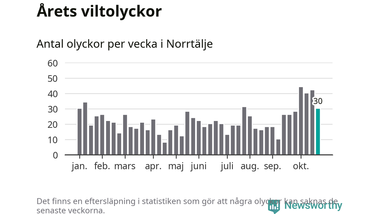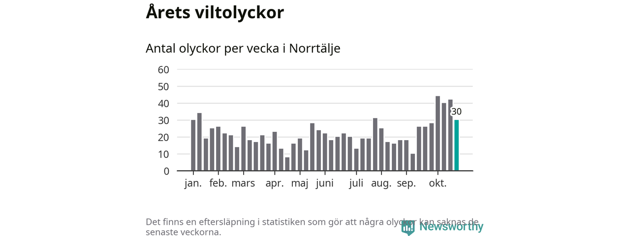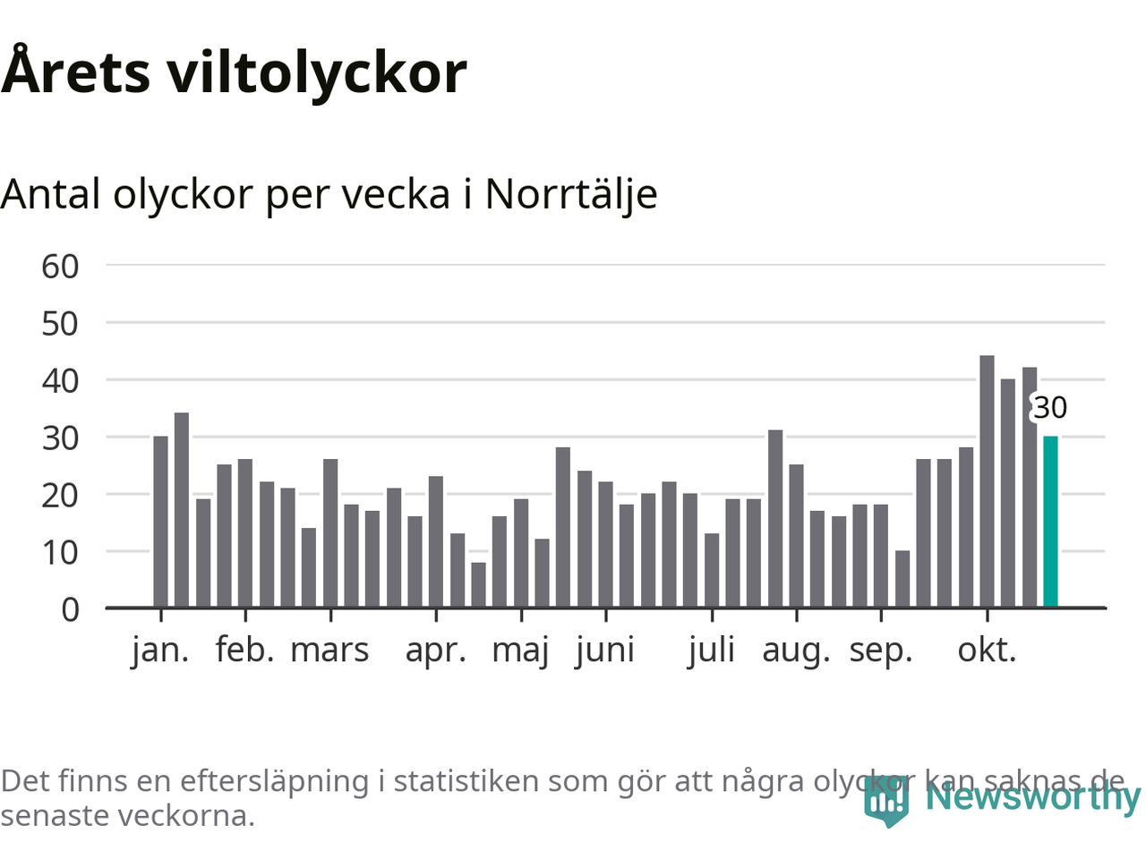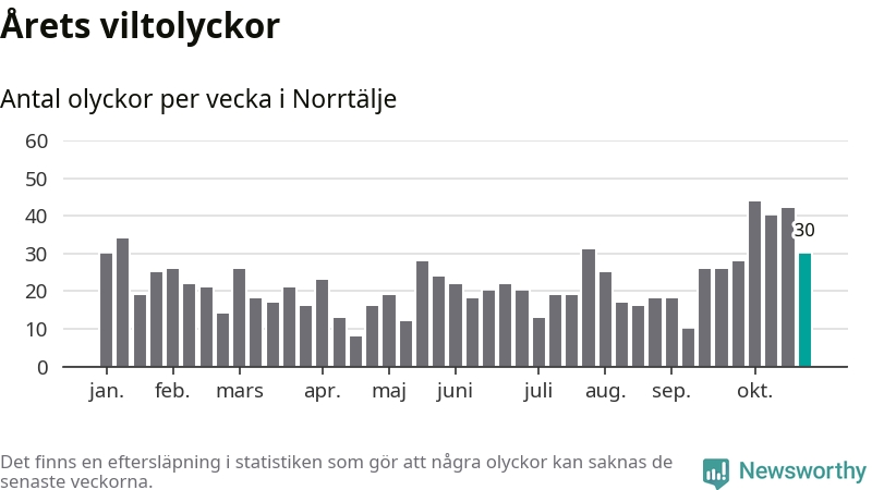 Hittills har 30 viltolyckor rapporterats in i Norrtälje kommun från vecka 44. Se listan här.