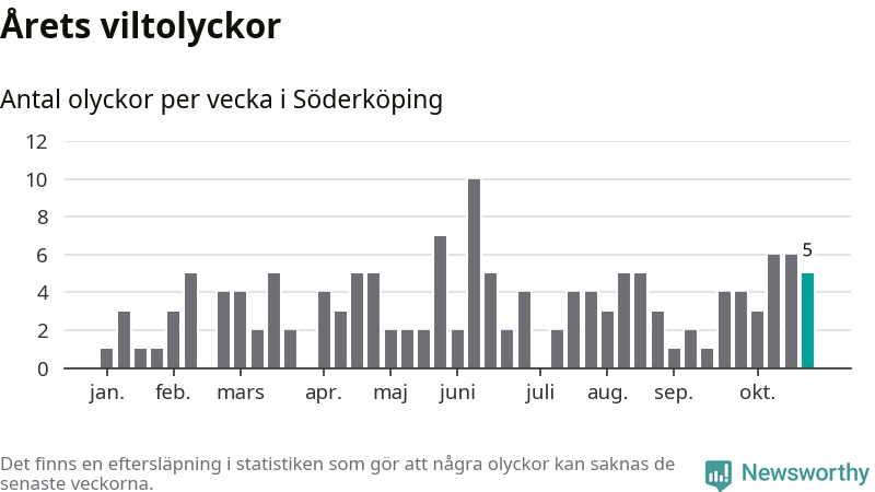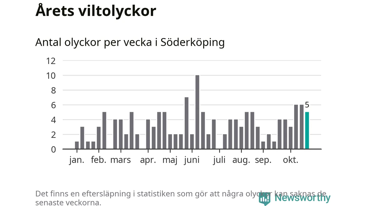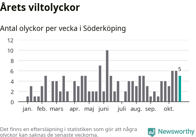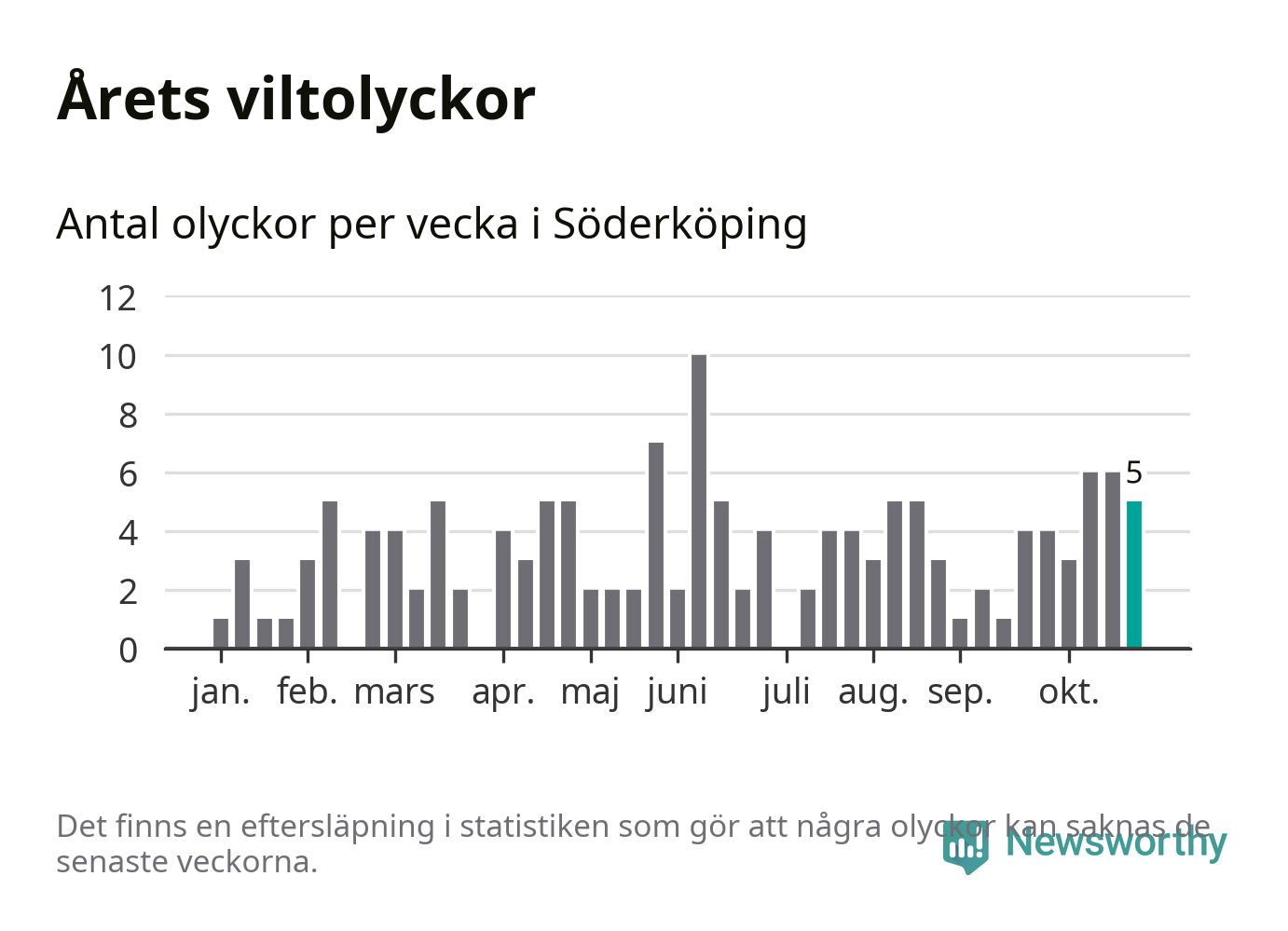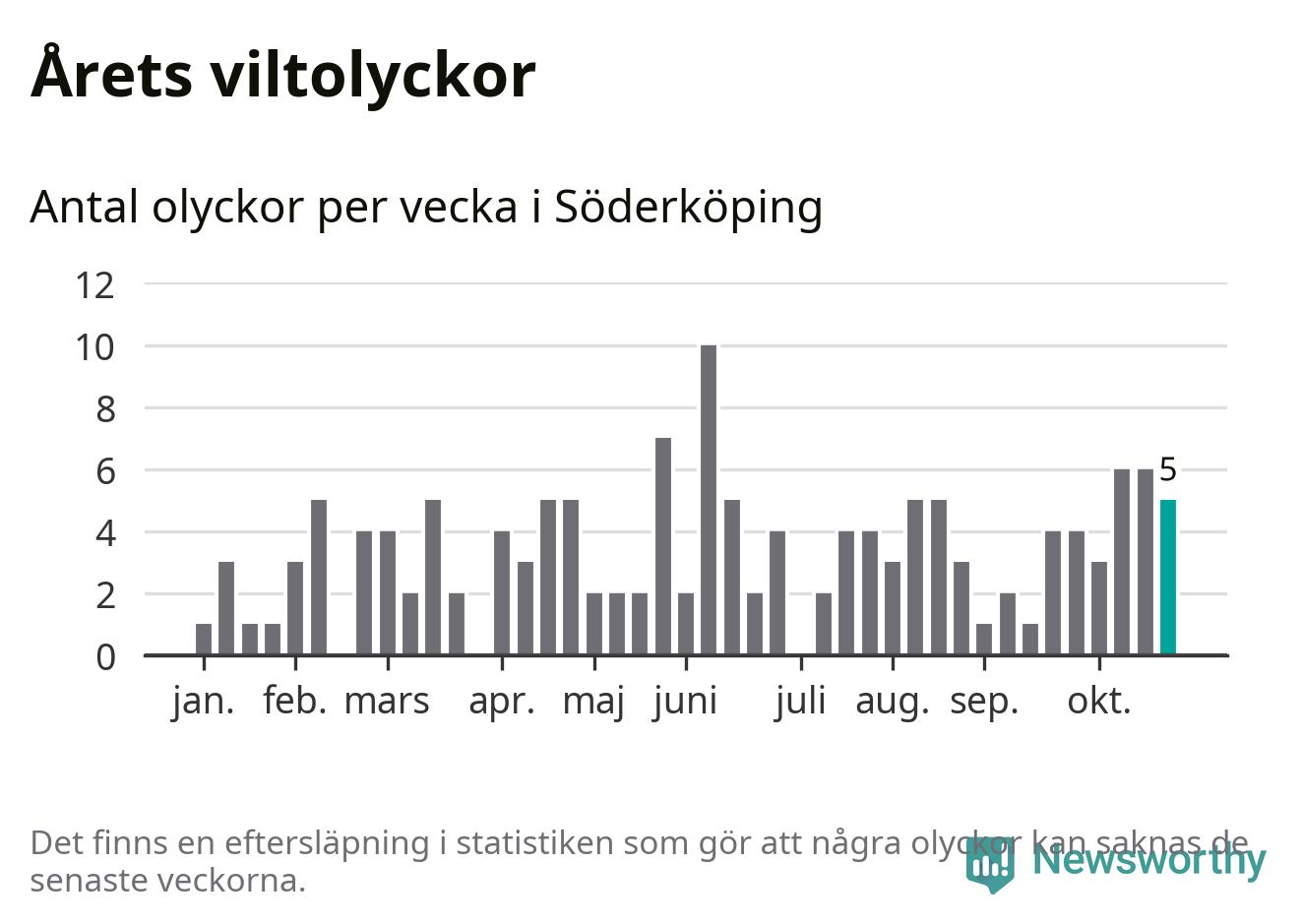 Hittills har fem viltolyckor rapporterats in i Söderköpings kommun från vecka 44. Se listan här.