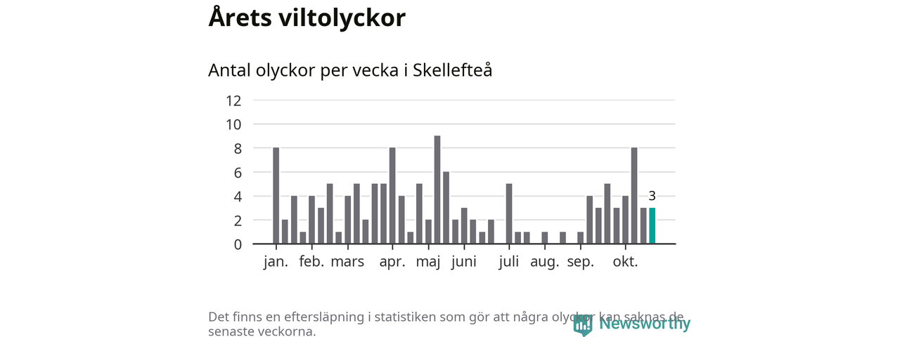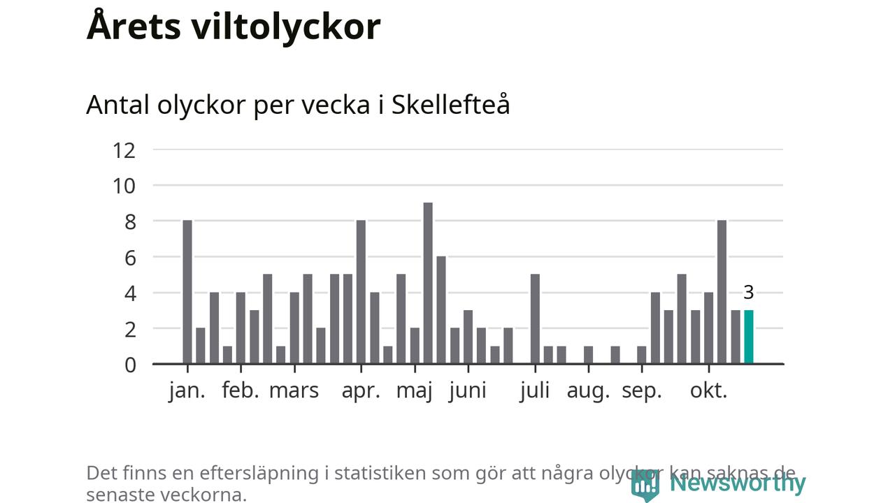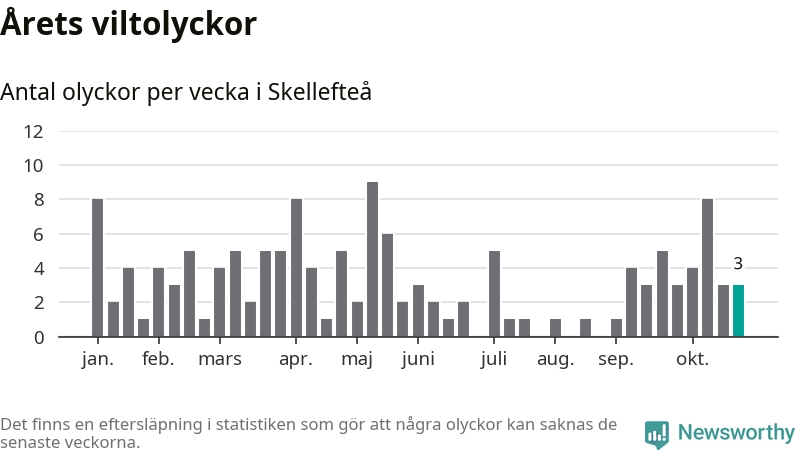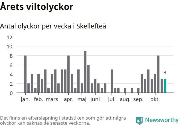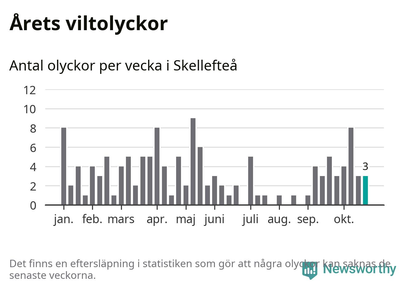 Hittills har tre viltolyckor rapporterats in i Skellefteå kommun från vecka 44. Se listan här.