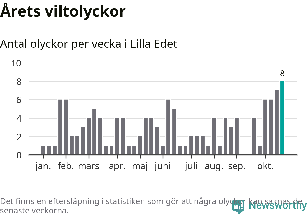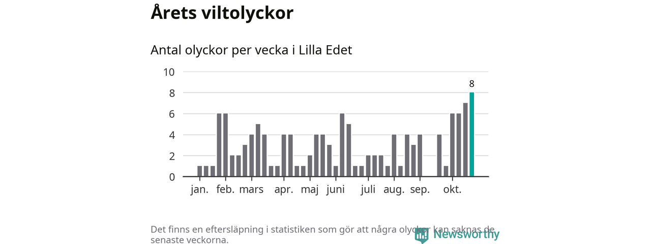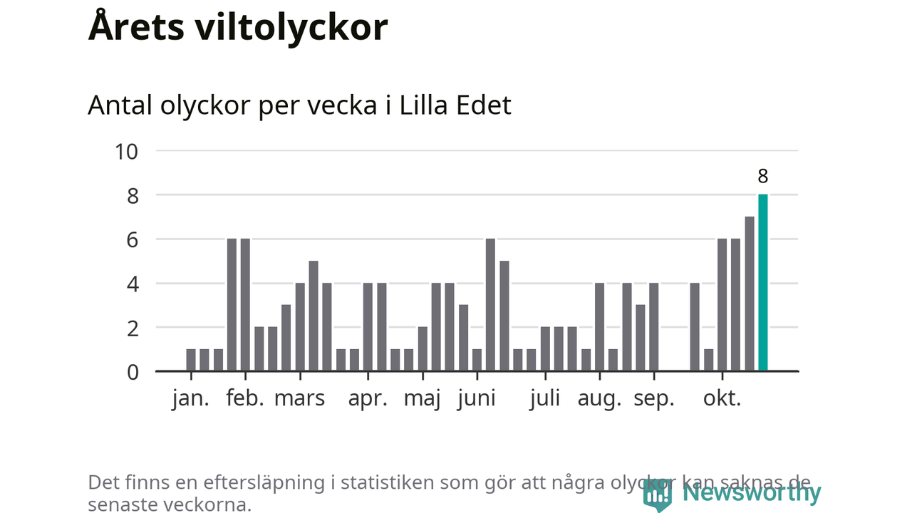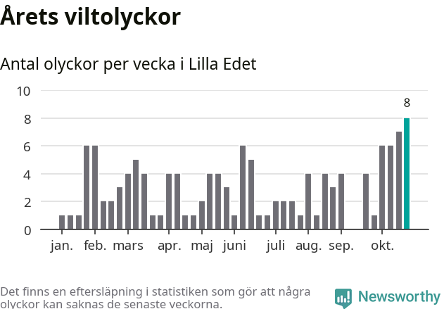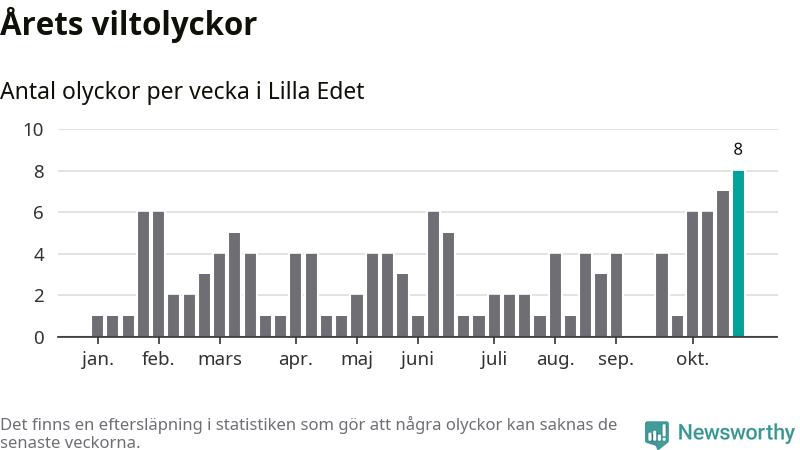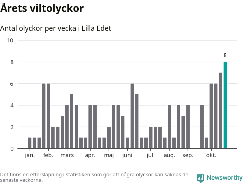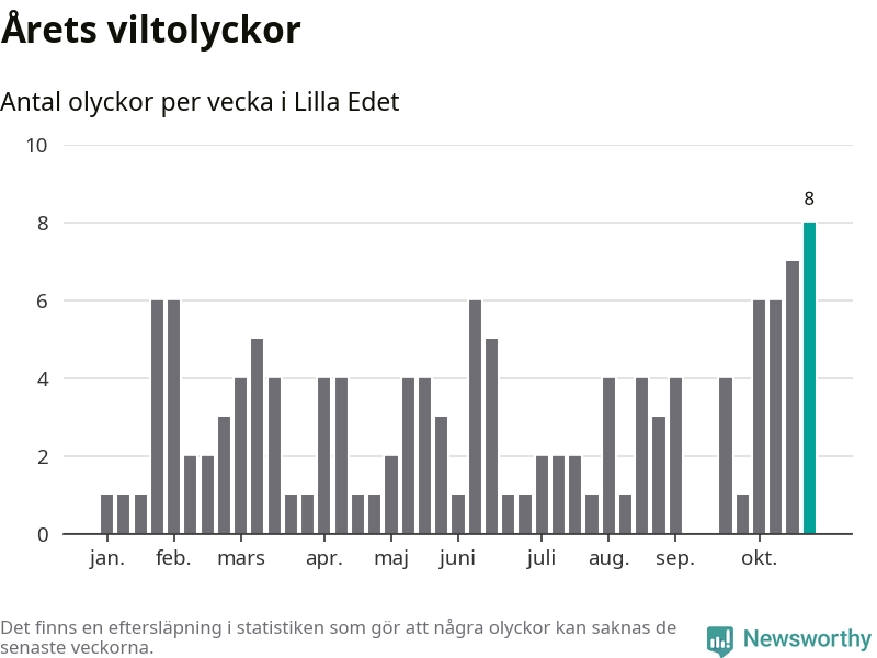 Under vecka 44 rapporterades åtta viltolyckor in i Lilla Edets kommun. Det är det största antalet på en enskild vecka hittills i år.