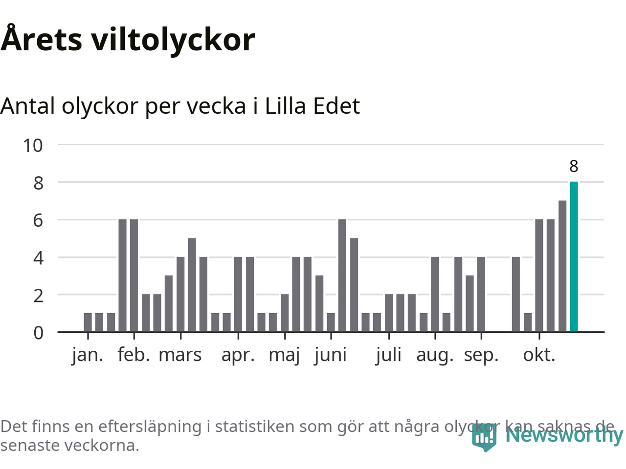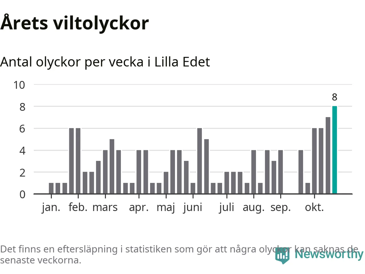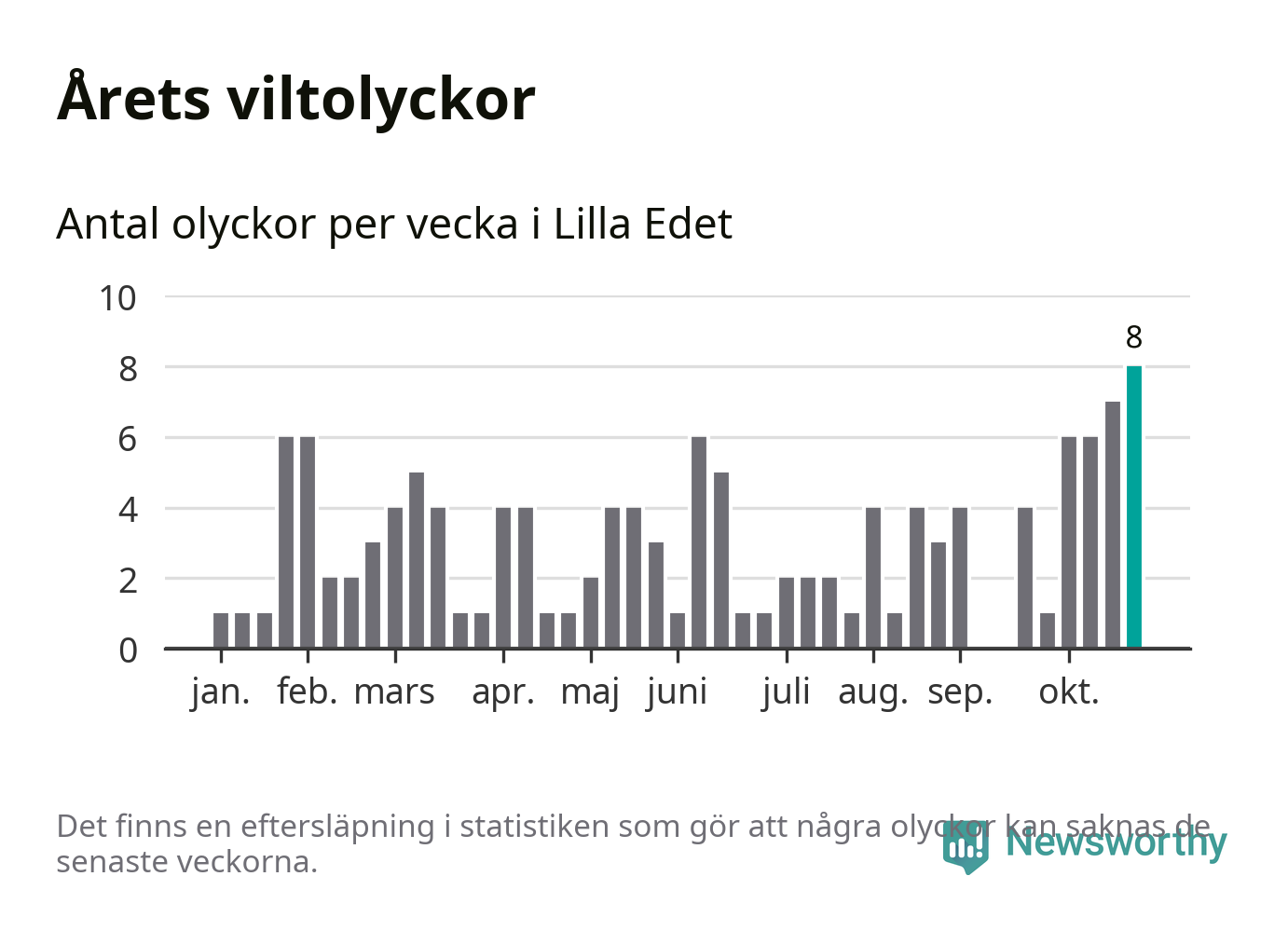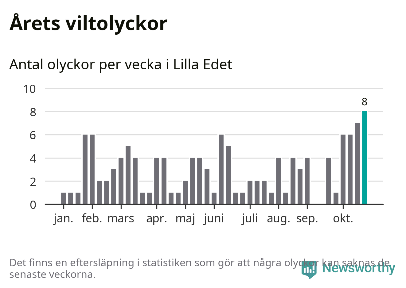 Under vecka 44 rapporterades åtta viltolyckor in i Lilla Edets kommun. Det är det största antalet på en enskild vecka hittills i år.