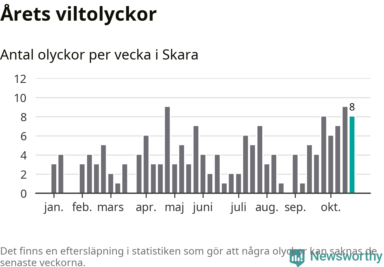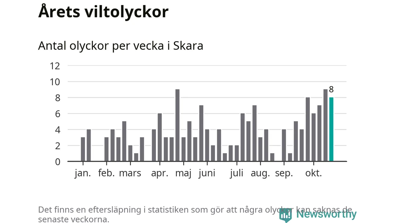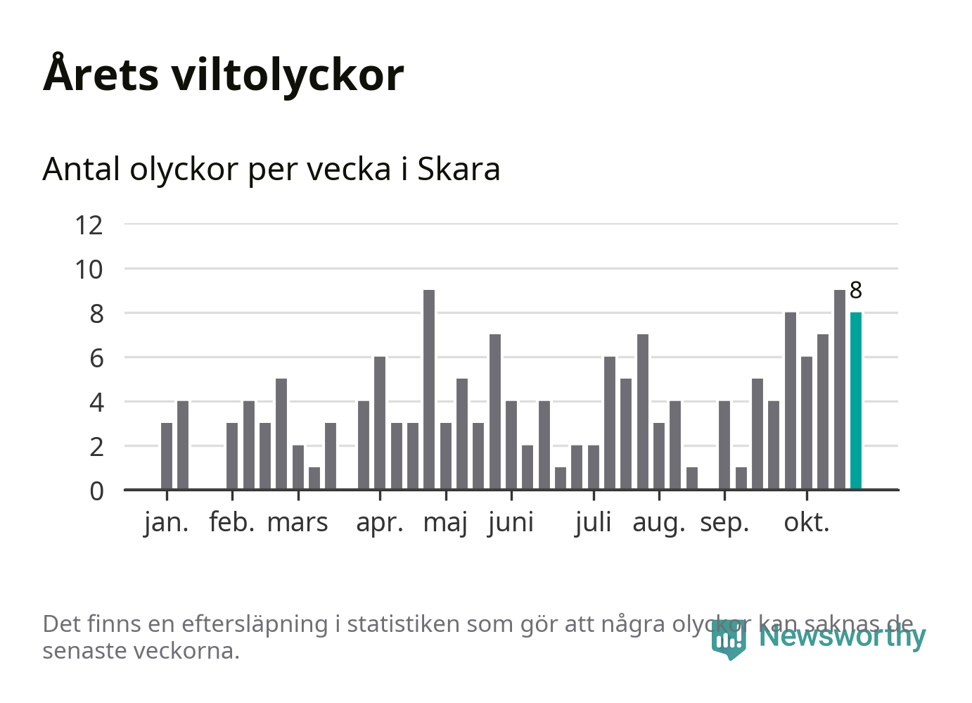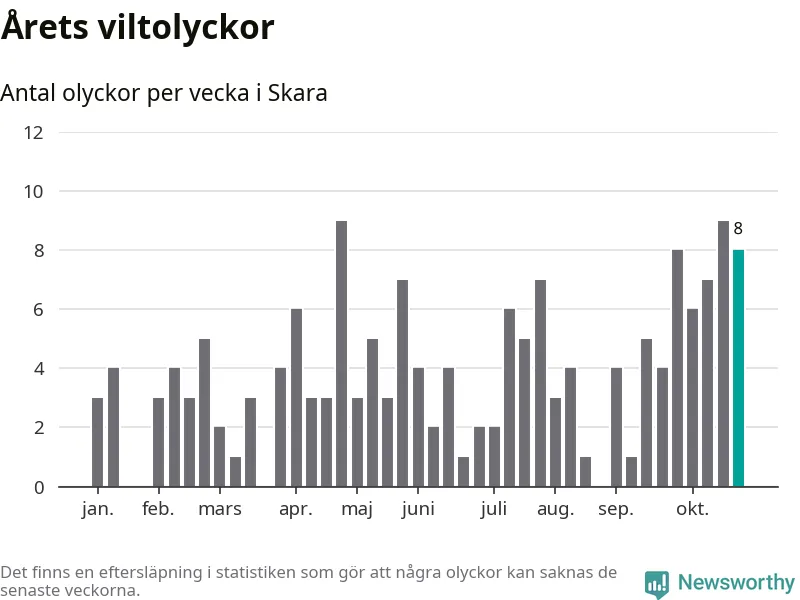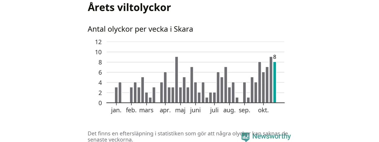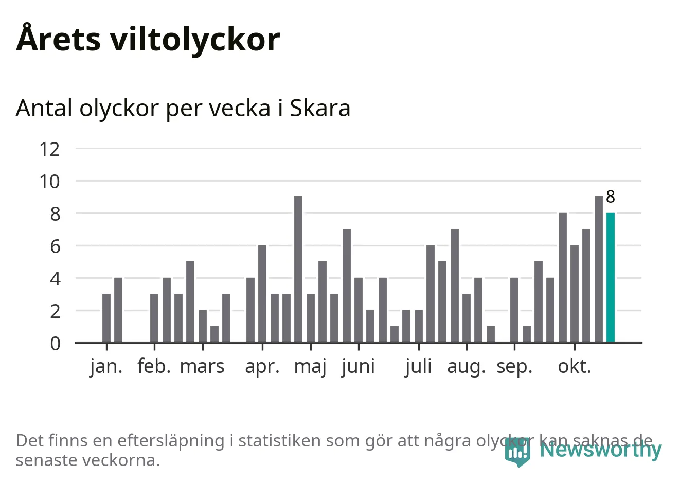 Åtta olyckor på en enda vecka är också ovanligt många. Bara elva gånger tidigare sedan 2015 har det skett så många viltolyckor på en vecka i Skara kommun.