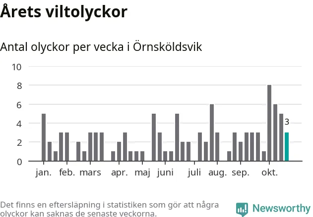 Totalt det här året har det inträffat 108 viltolyckor i kommunen. Det är mindre än genomsnittet för motsvarande period (omkring 146) de senaste tio åren.