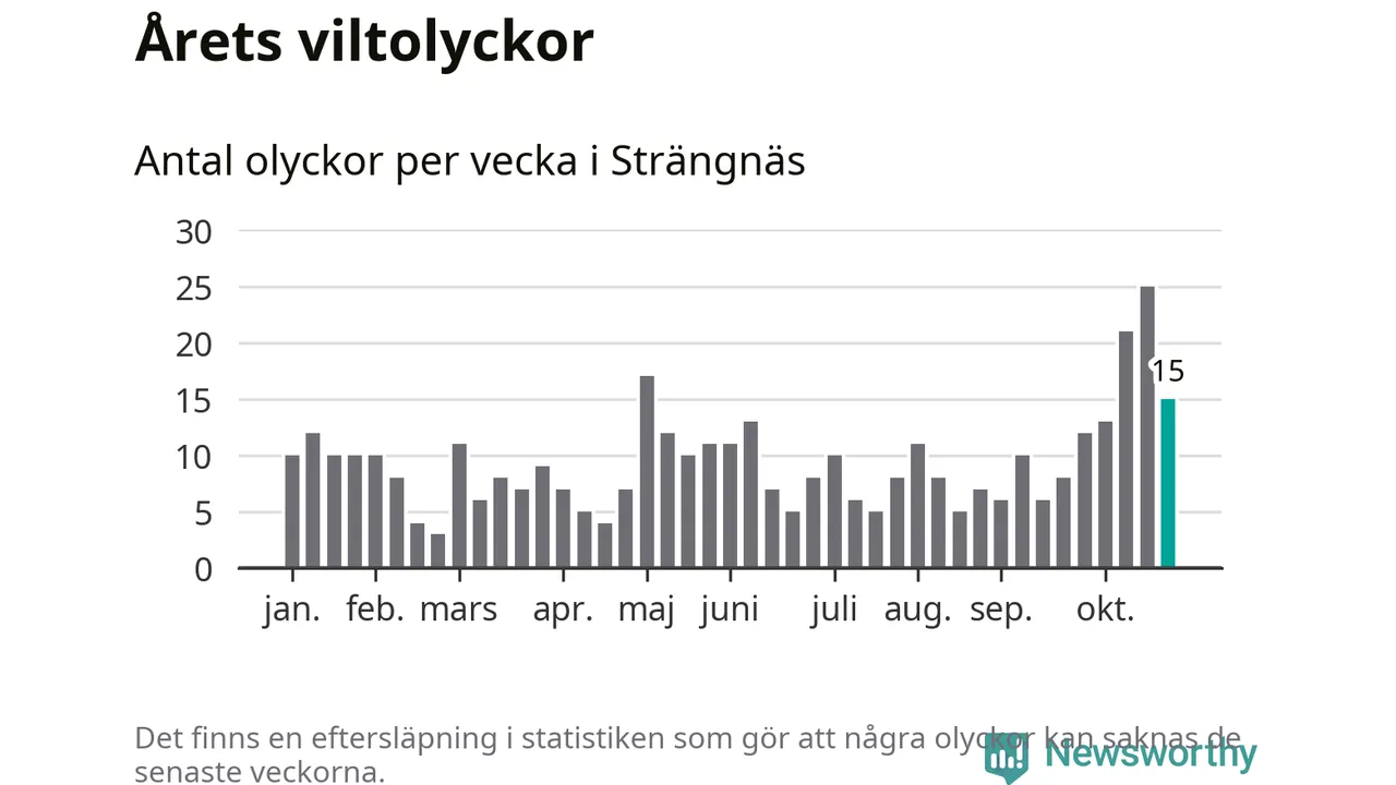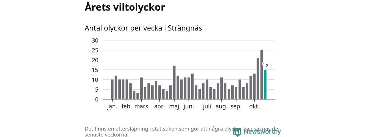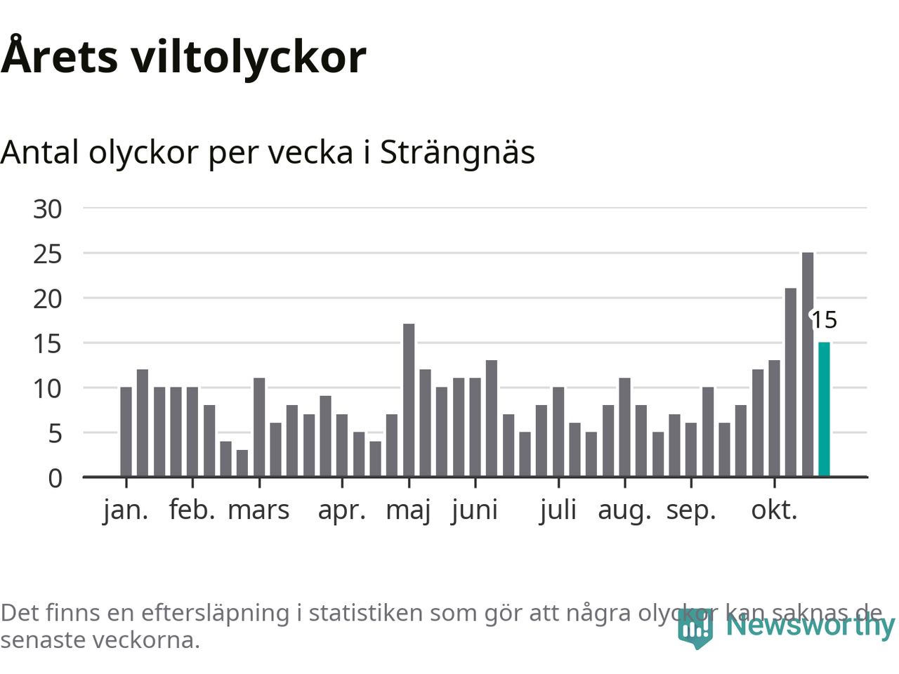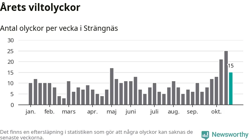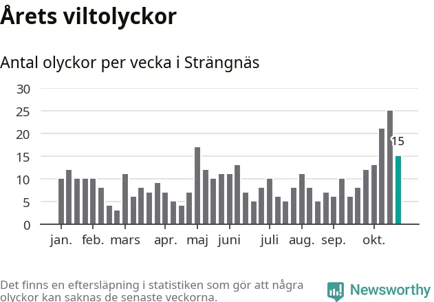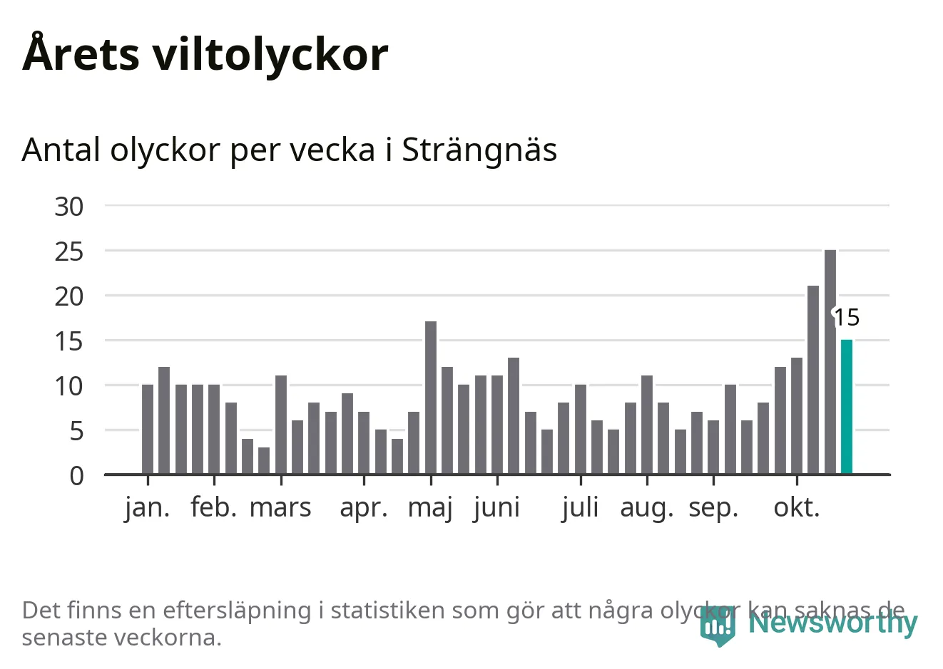 Hittills har 15 viltolyckor rapporterats in i Strängnäs kommun från vecka 44. Se listan här.