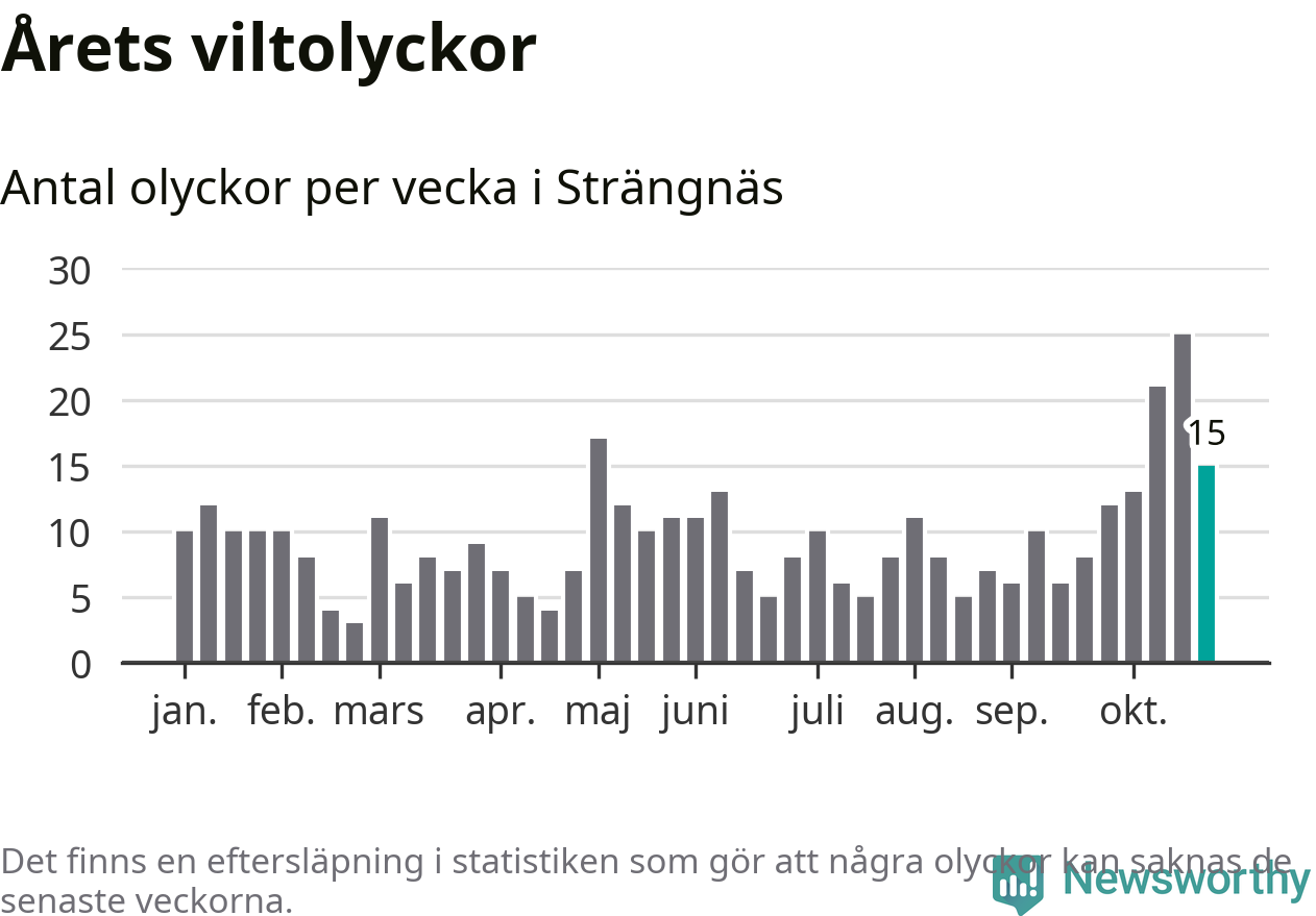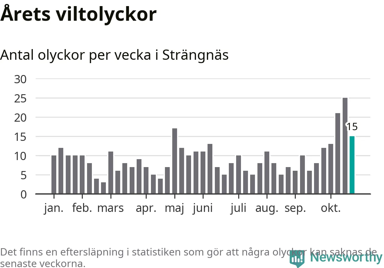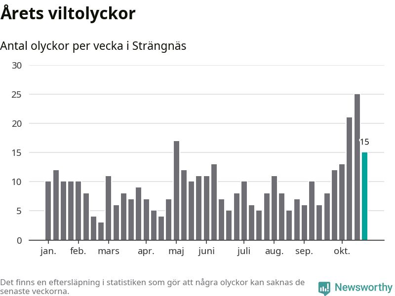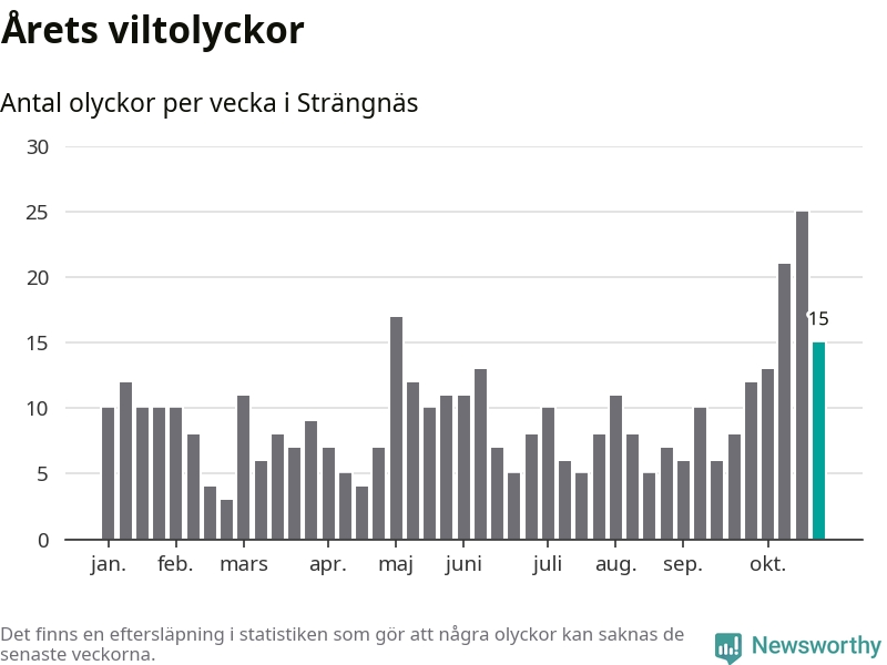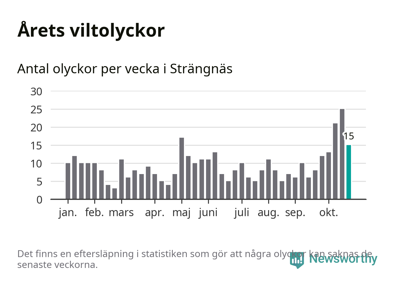 Hittills har 15 viltolyckor rapporterats in i Strängnäs kommun från vecka 44. Se listan här.