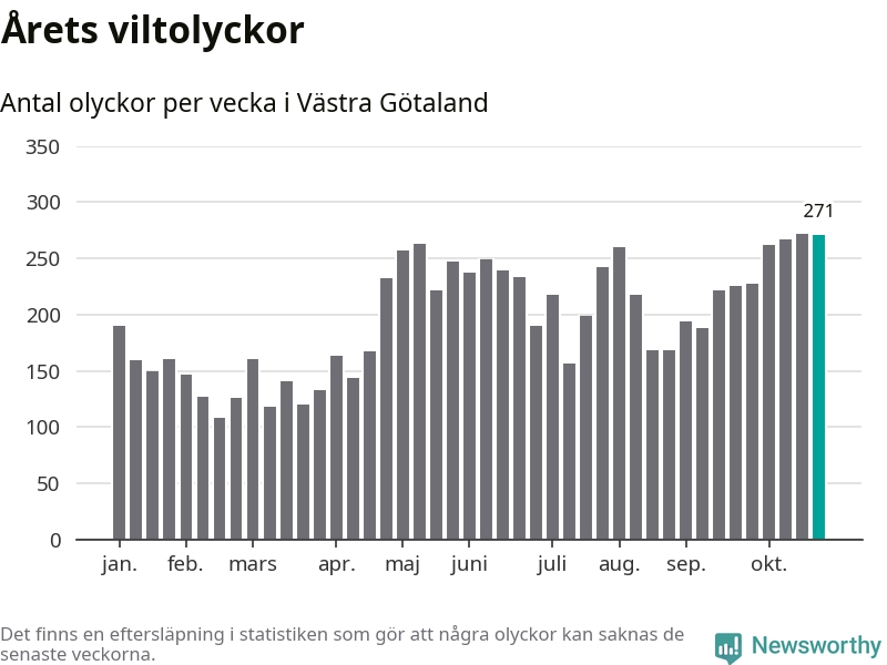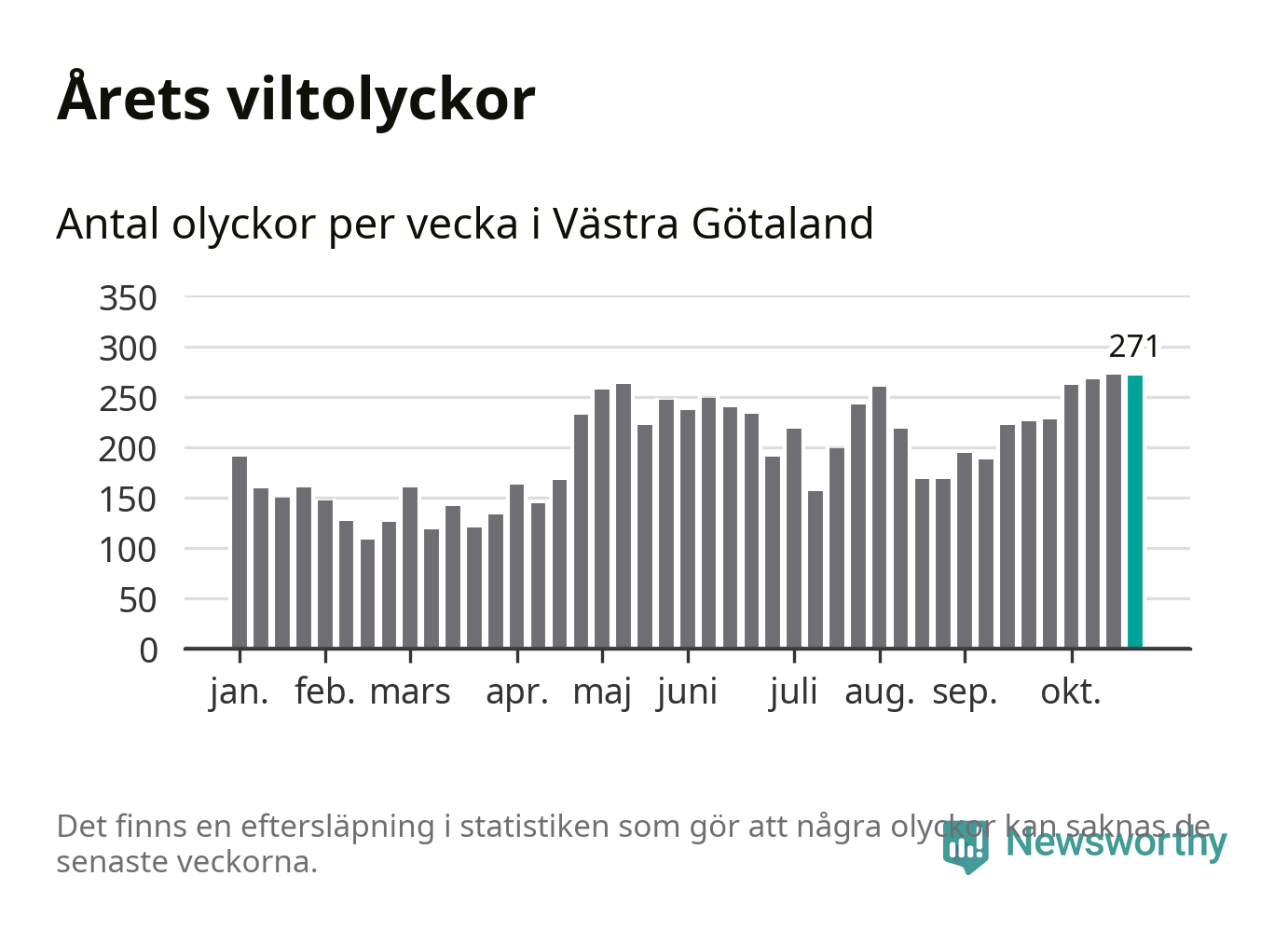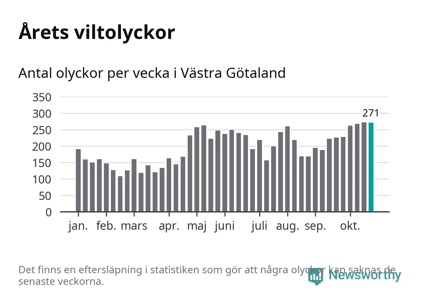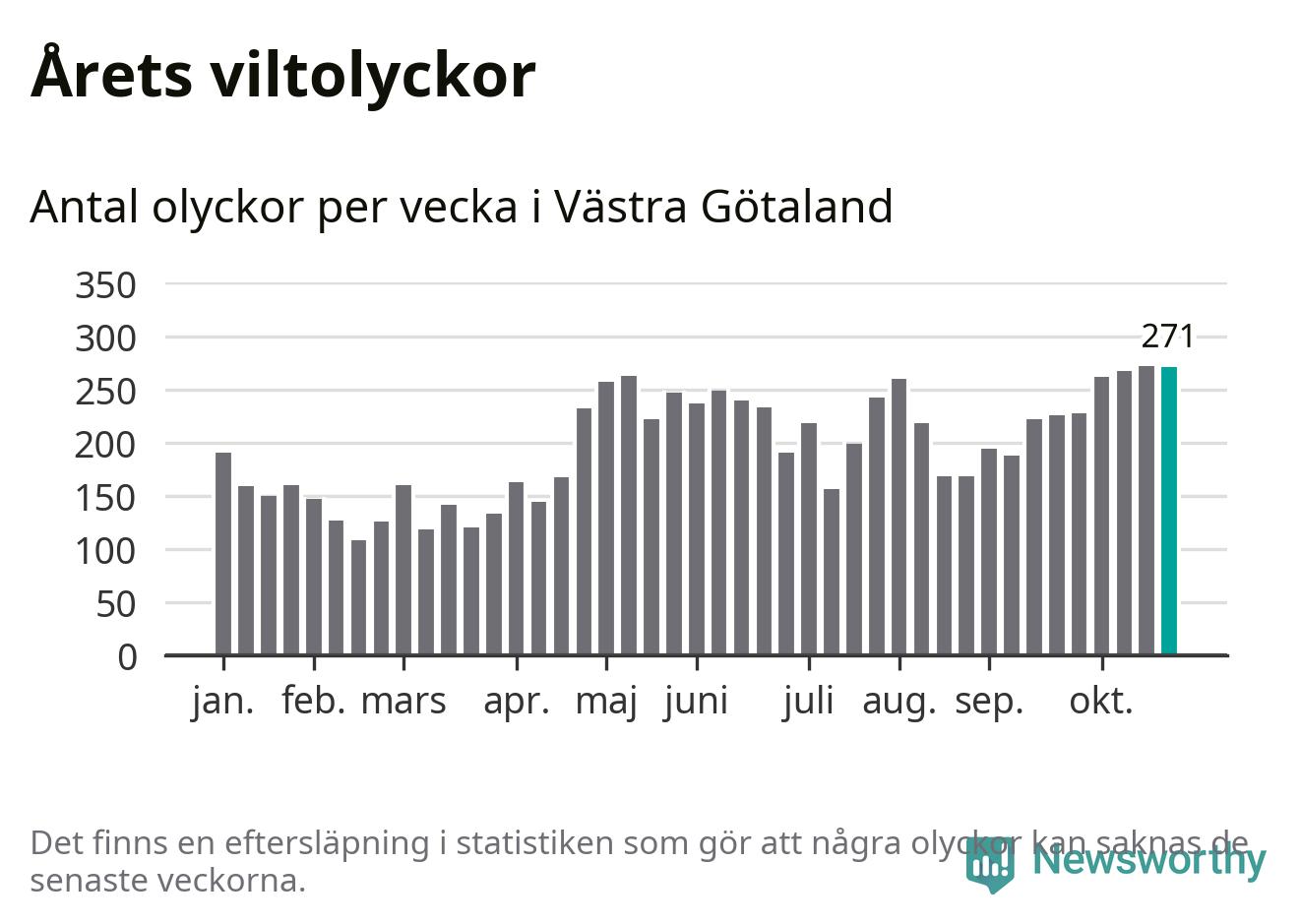 Hittills har 271 viltolyckor rapporterats in i Västra Götalands län från vecka 44. Se listan här.