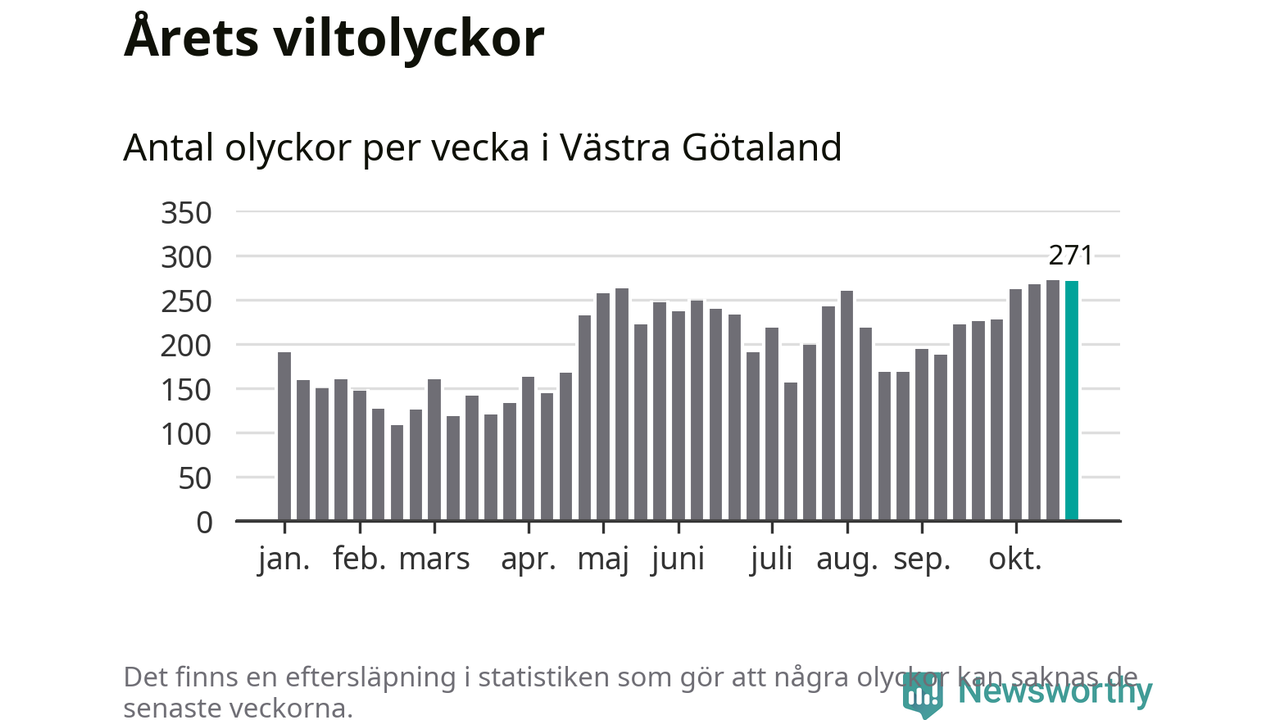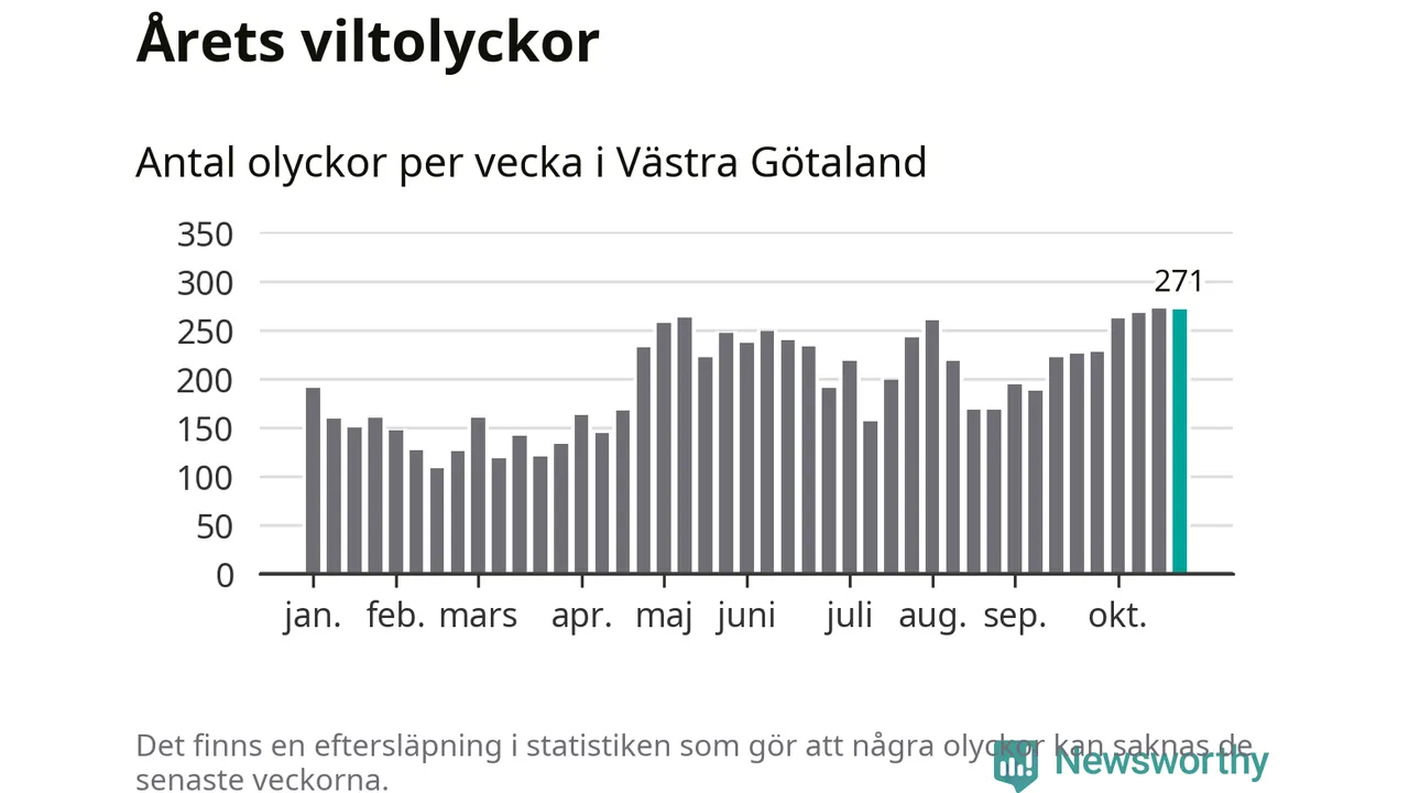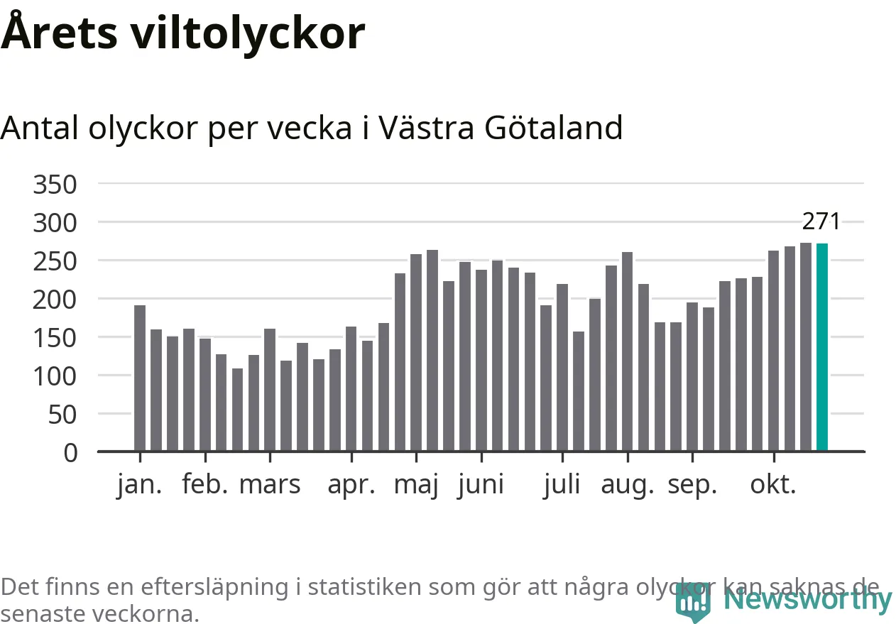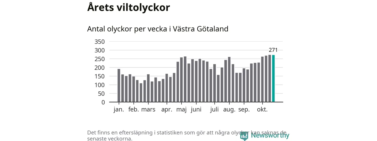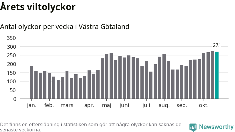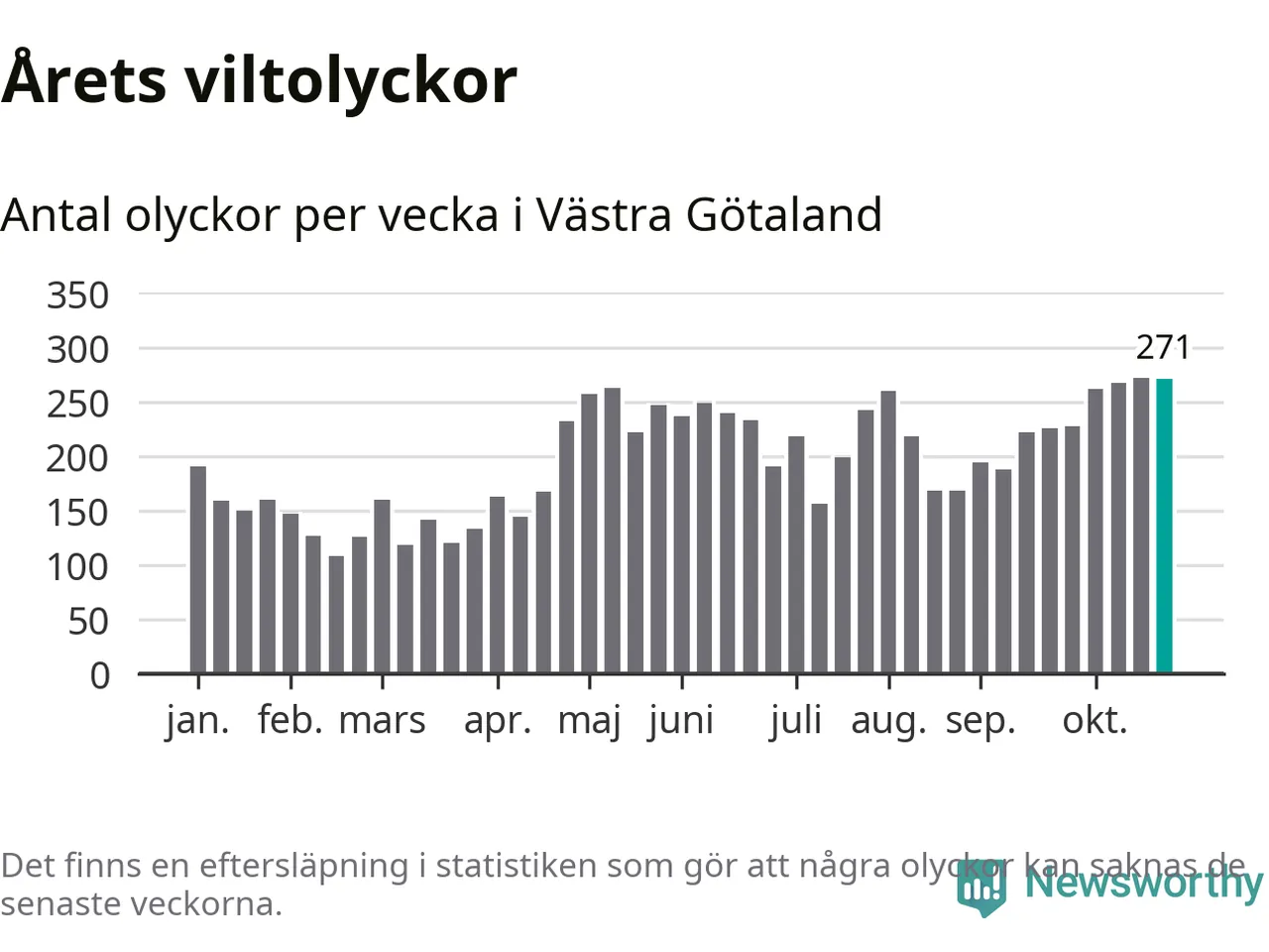 Hittills har 271 viltolyckor rapporterats in i Västra Götalands län från vecka 44. Se listan här.