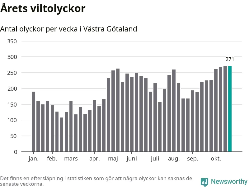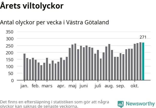 Totalt det här året har det inträffat 8 558 viltolyckor i länet. Det är mer än genomsnittet för motsvarande period (omkring 7 576) de senaste tio åren.