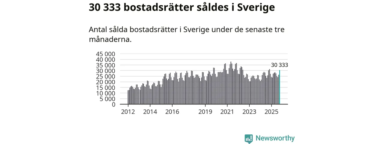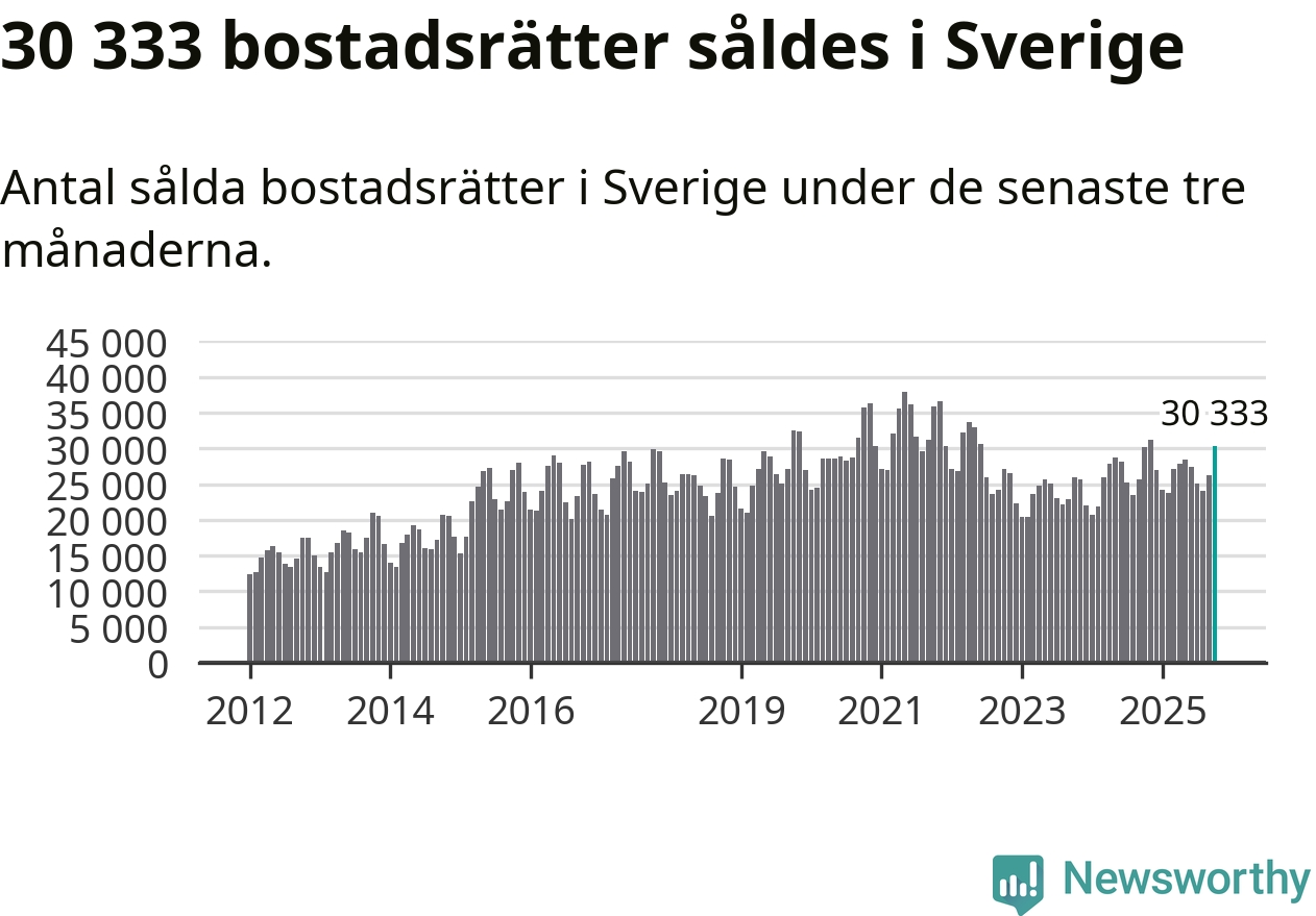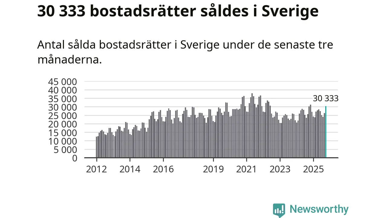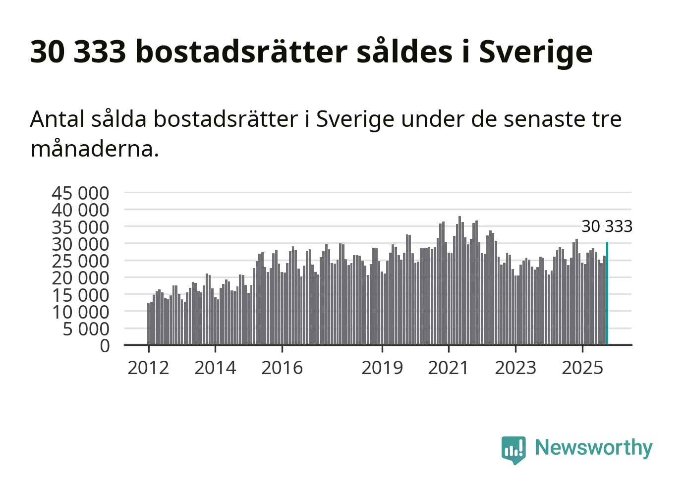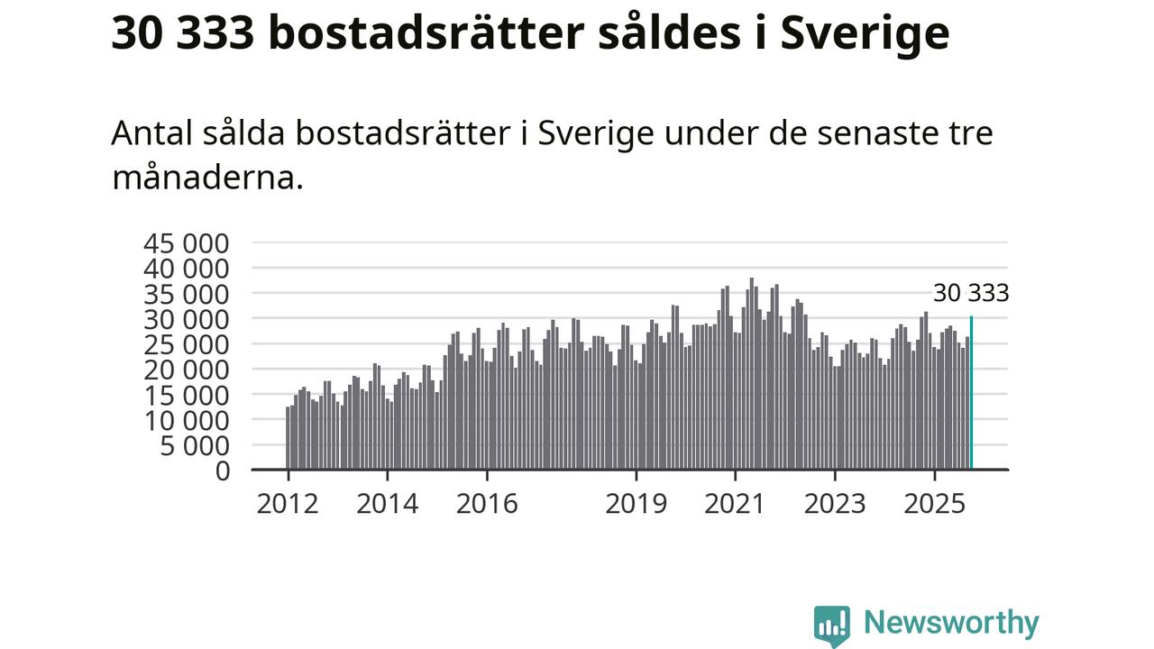 Sammanlagt såldes 30 333 bostadsrätter i Sverige mellan augusti och oktober till ett genomsnittligt pris på 3,0 miljoner kronor. I fjol gjordes 30 193 affärer vid den här tiden på året.