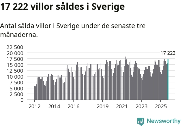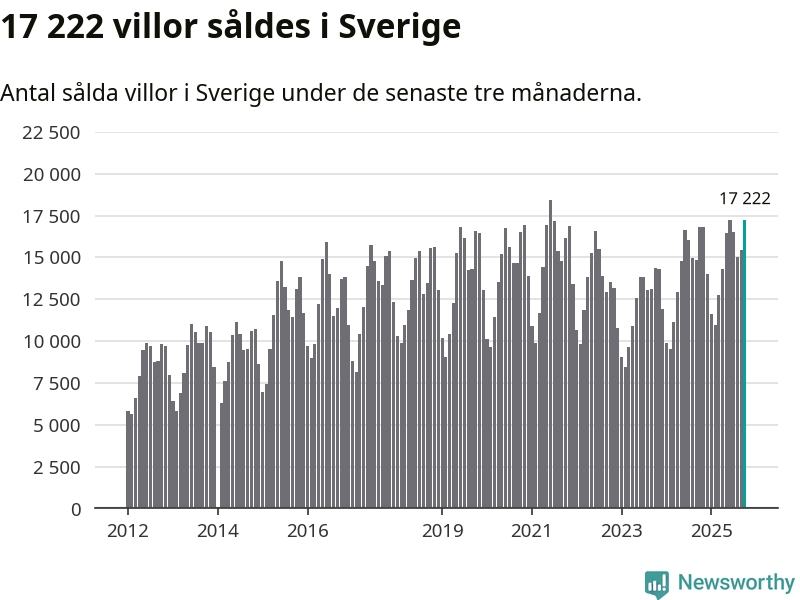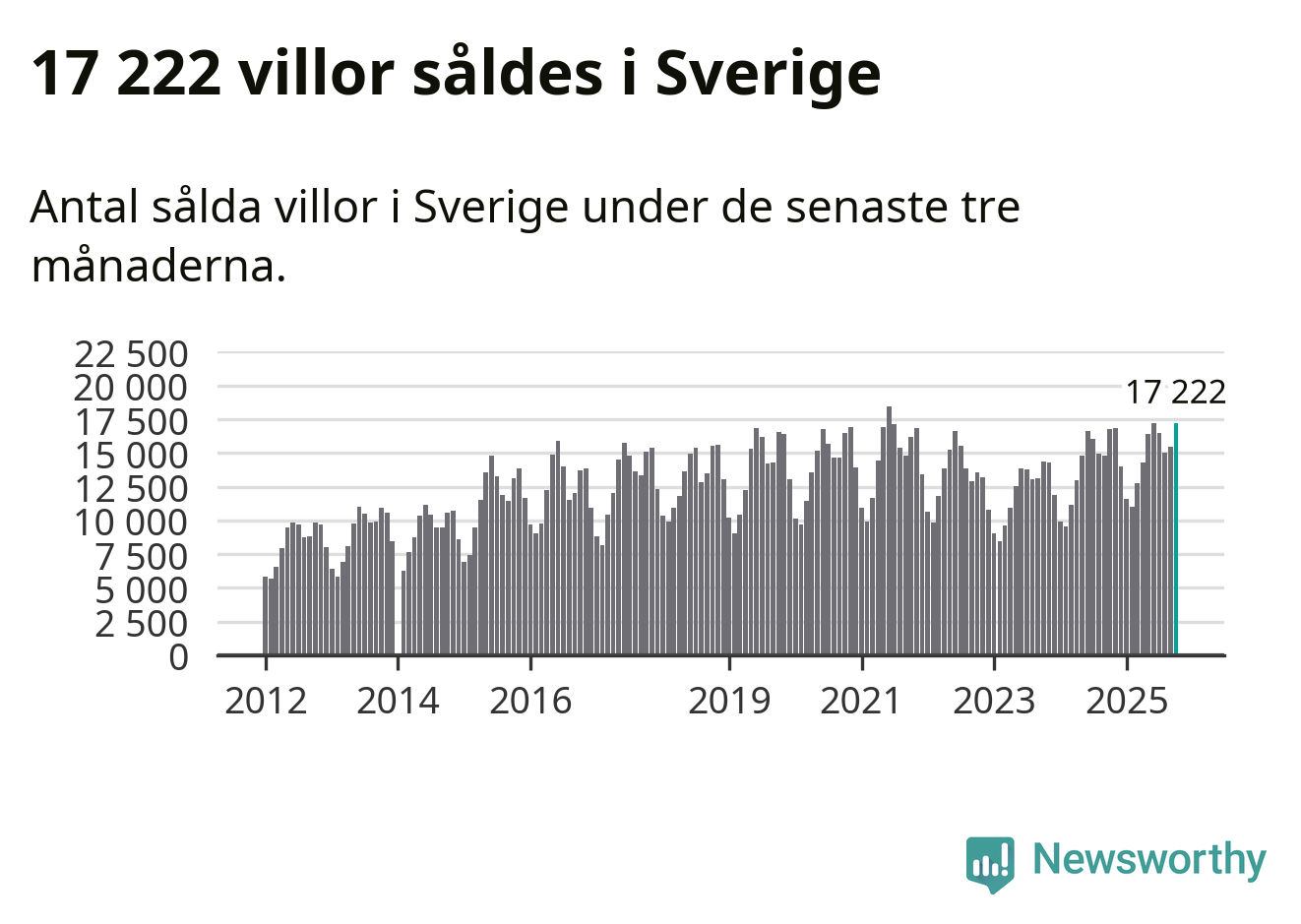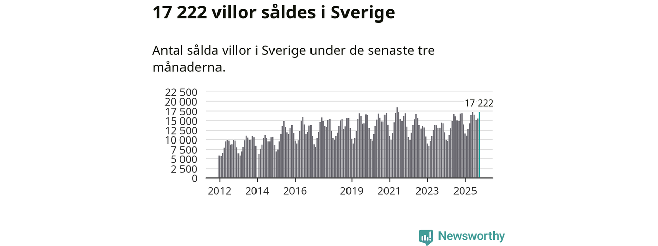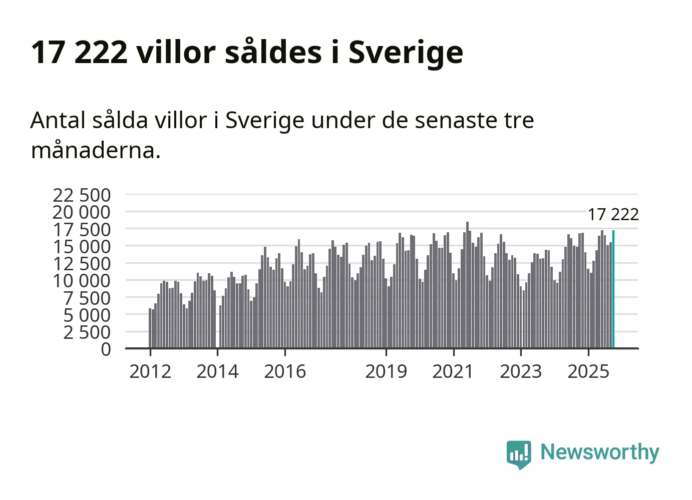 Sammanlagt såldes 17 222 villor i Sverige mellan augusti och oktober till ett genomsnittligt pris på 4,0 miljoner kronor. I fjol gjordes 16 784 affärer vid den här tiden på året.