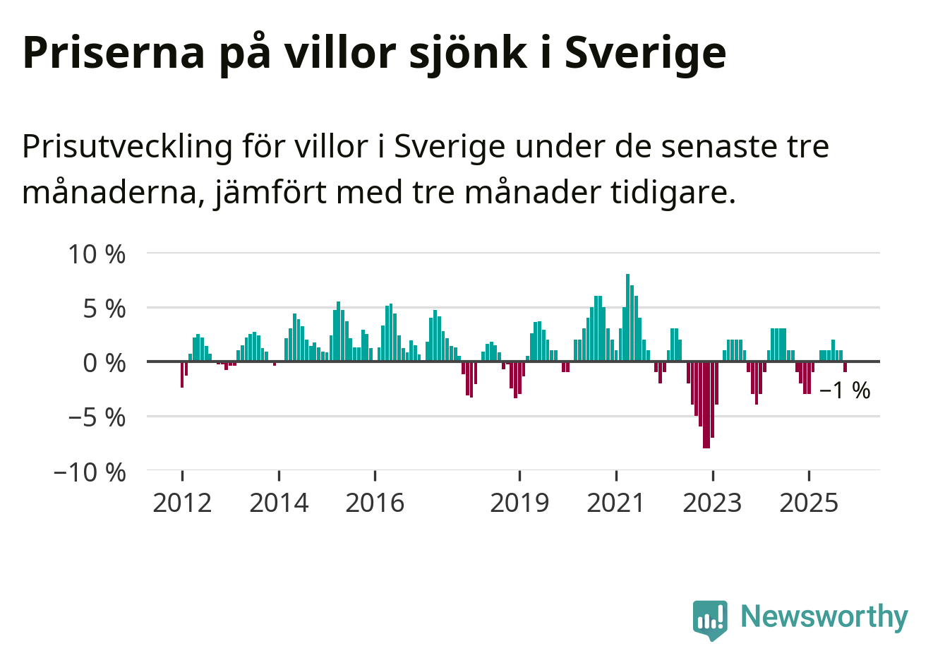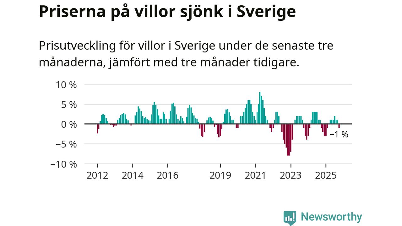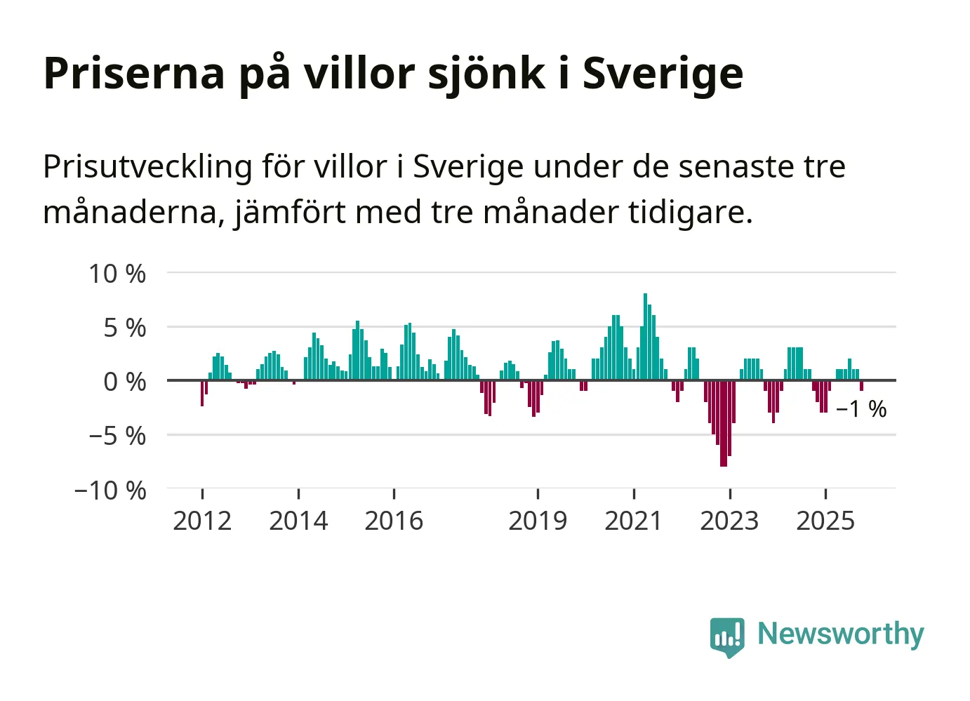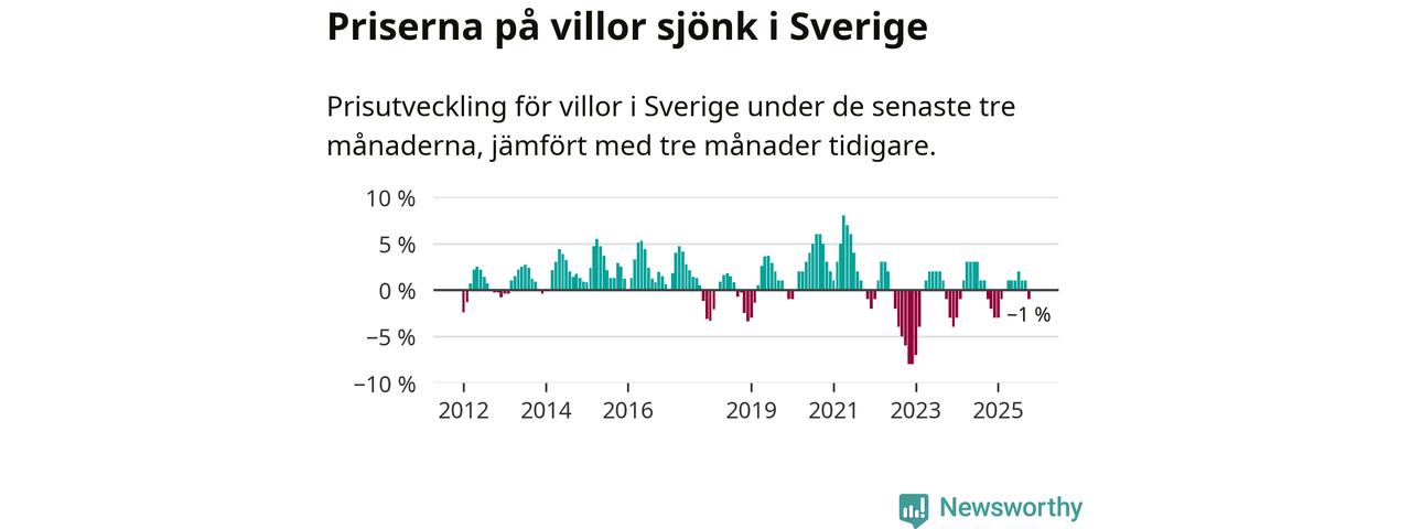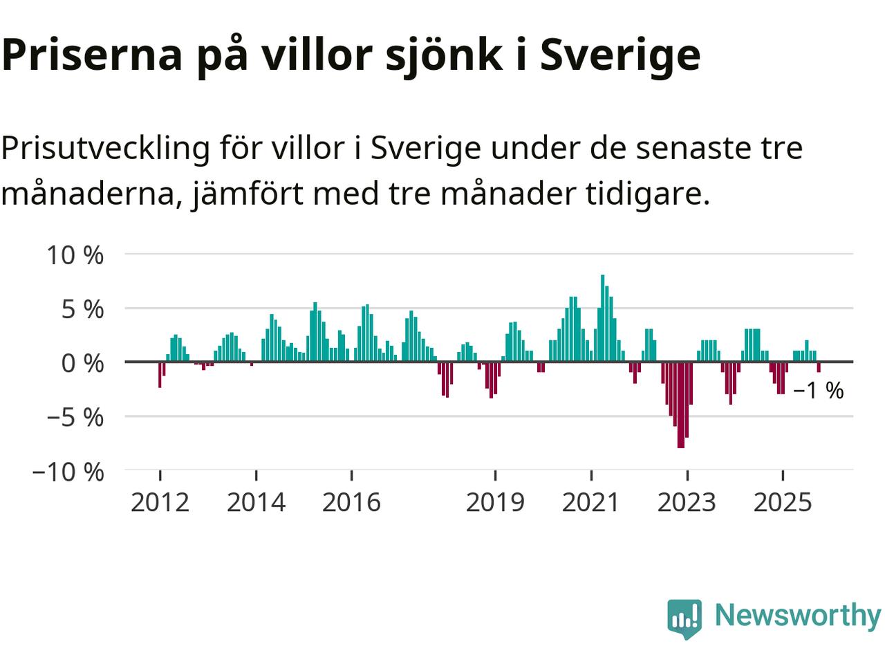 Villapriserna har gått ner i Sverige. Medelpriset på försäljningarna under de senaste tre månaderna visar på en nedgång med 1 procent.