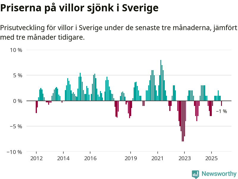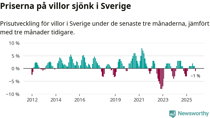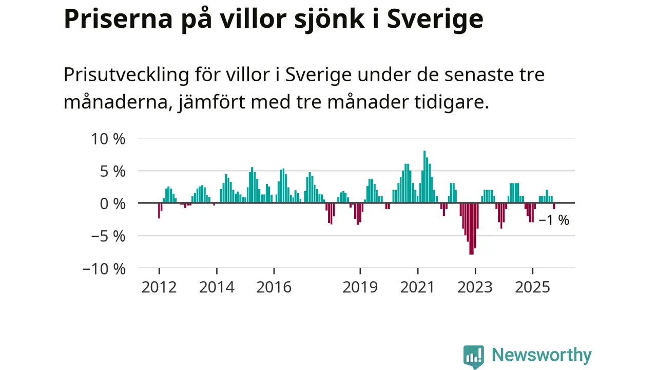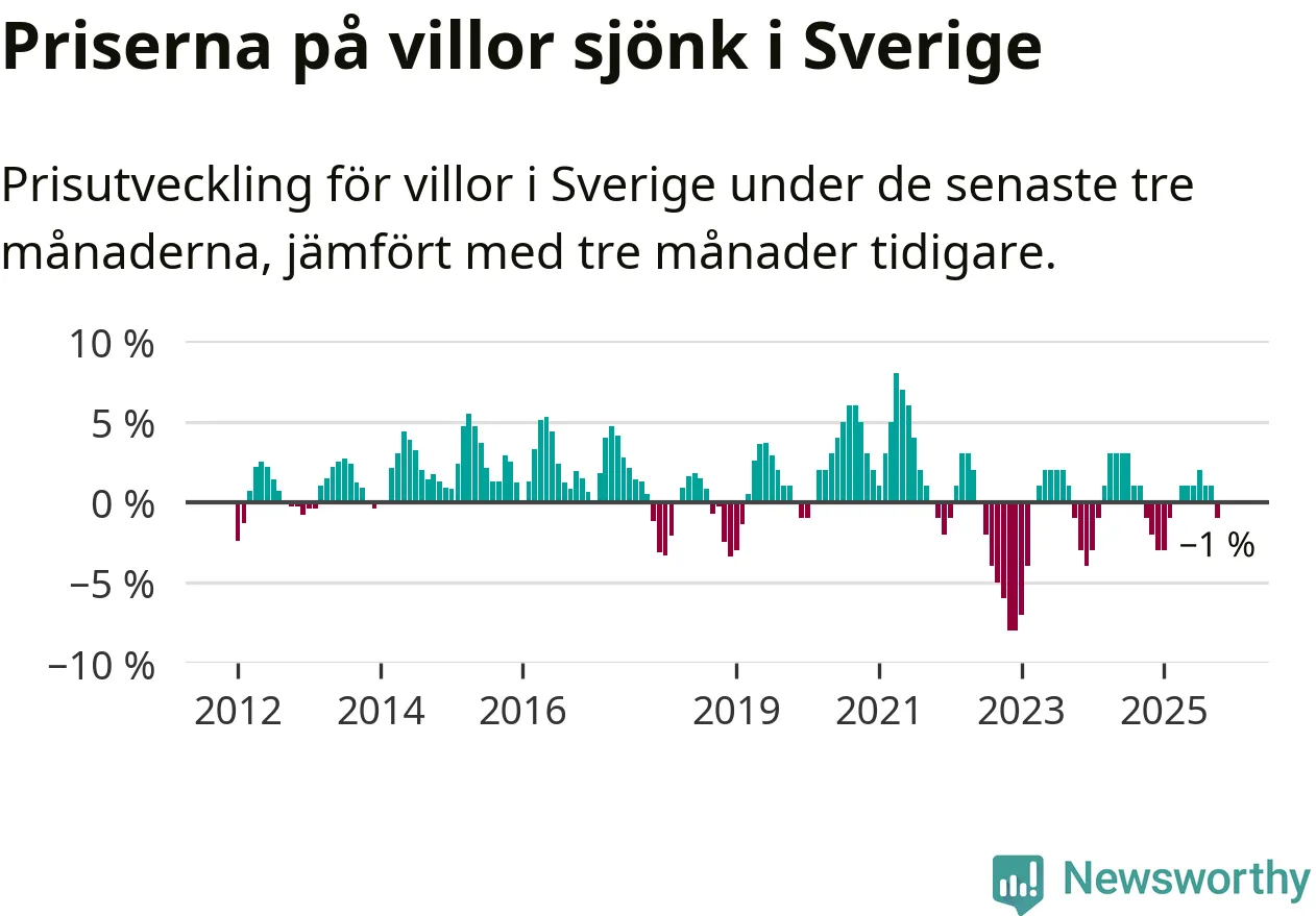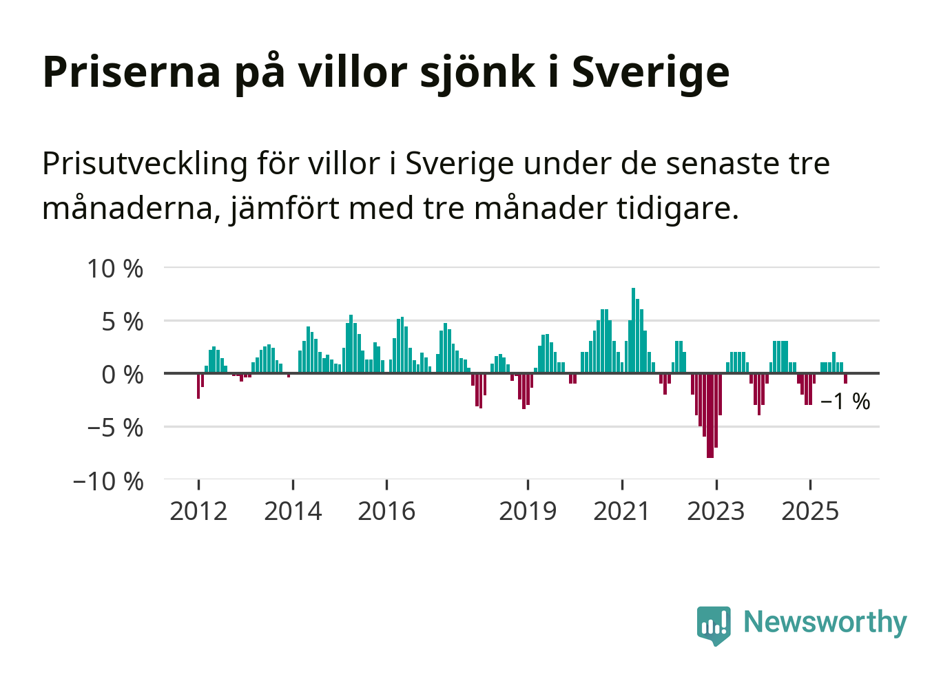 Villapriserna har gått ner i Sverige. Medelpriset på försäljningarna under de senaste tre månaderna visar på en nedgång med 1 procent.