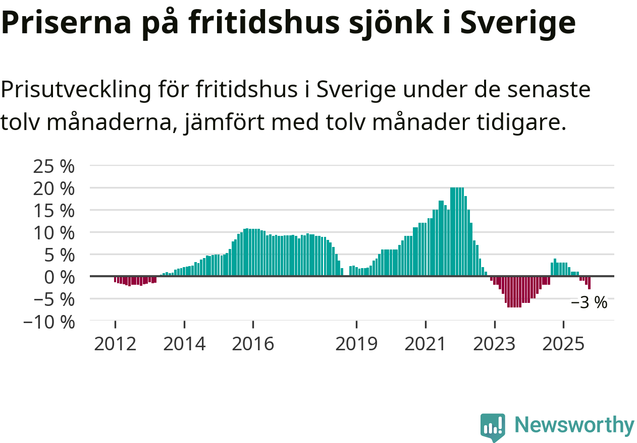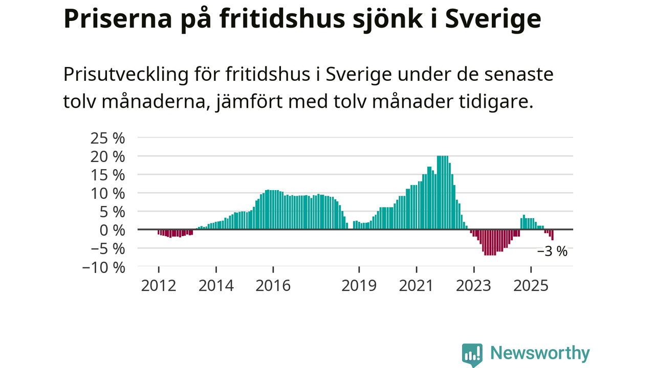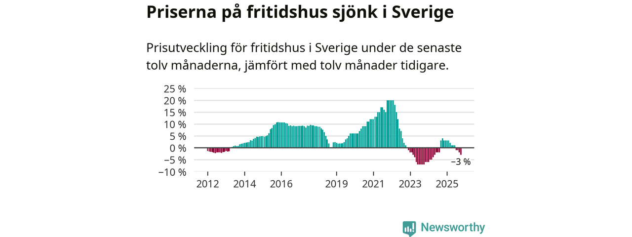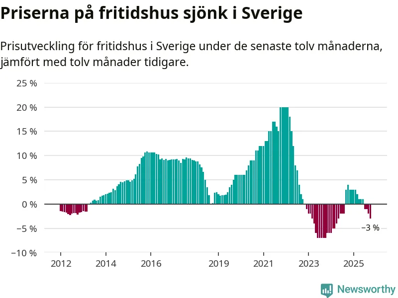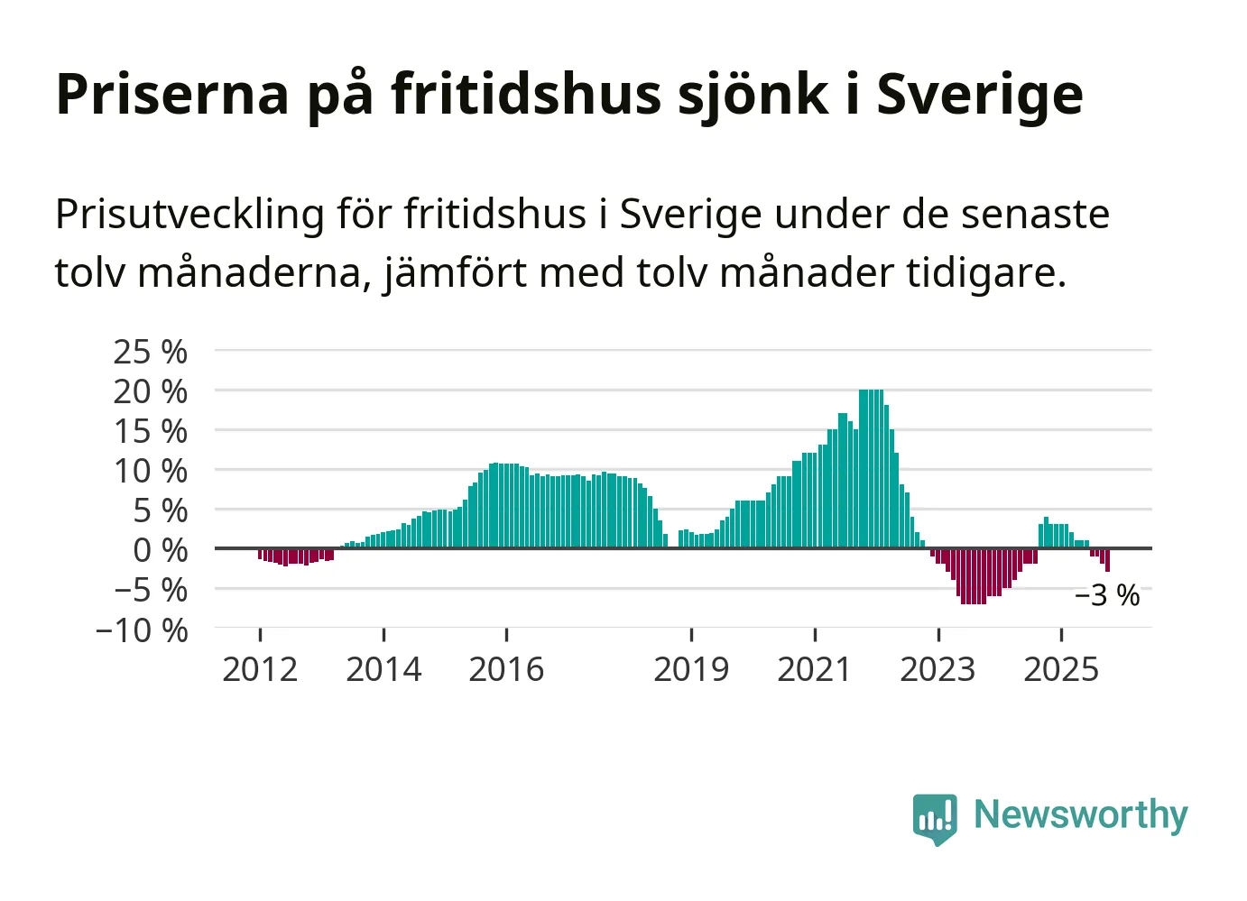 Priserna på fritidshus har gått ner i Sverige. Medelpriset på försäljningarna under de senaste tolv månaderna visar på en nedgång med 3 procent.