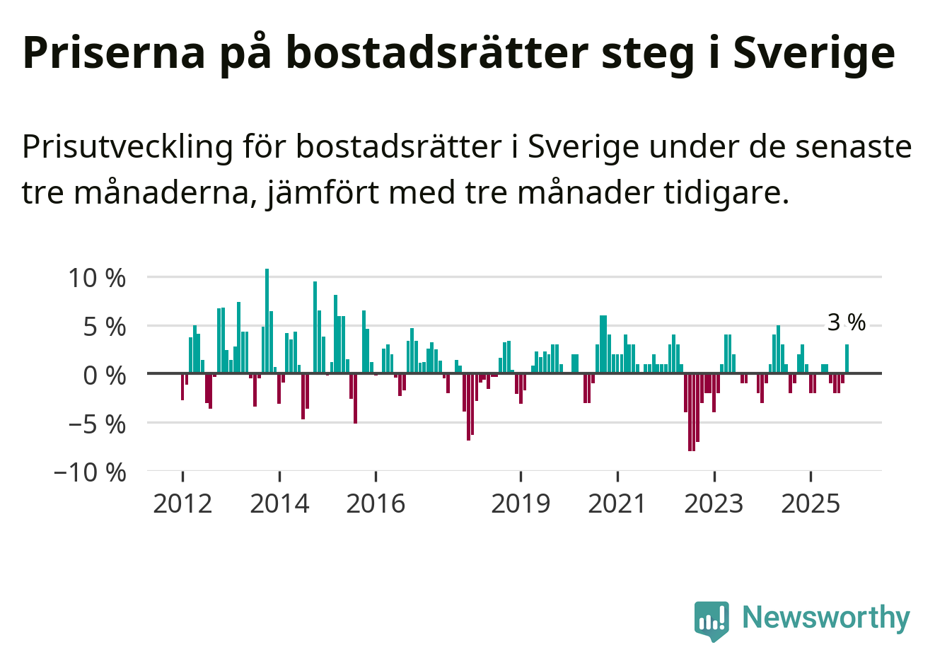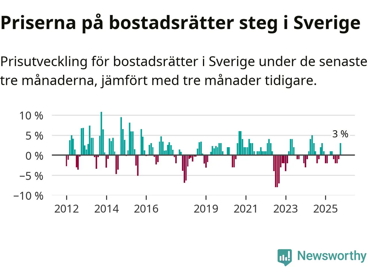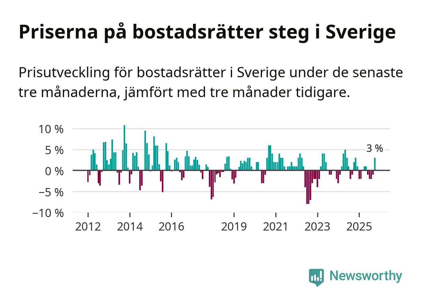 Priserna på bostadsrätter har gått upp i Sverige. Medelpriset på försäljningarna under de senaste tre månaderna visar på en uppgång med 3 procent.