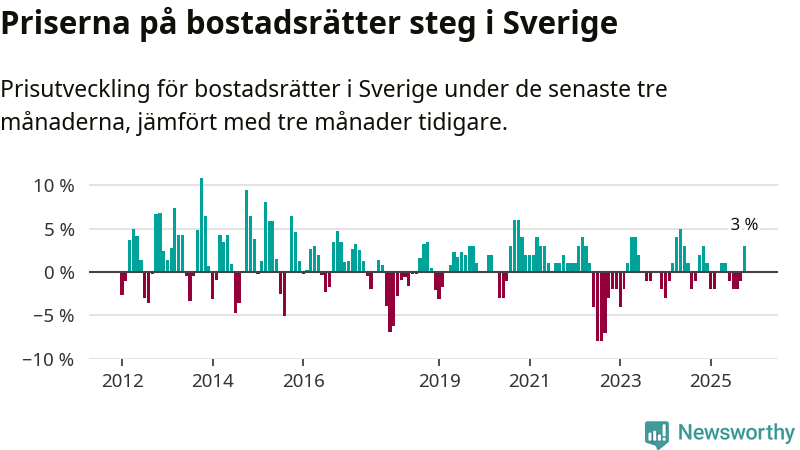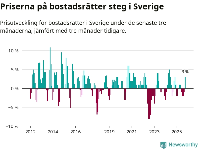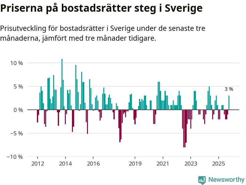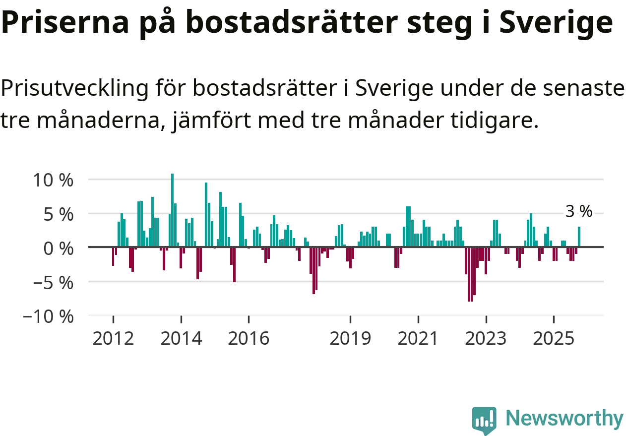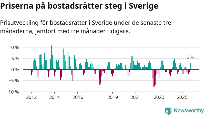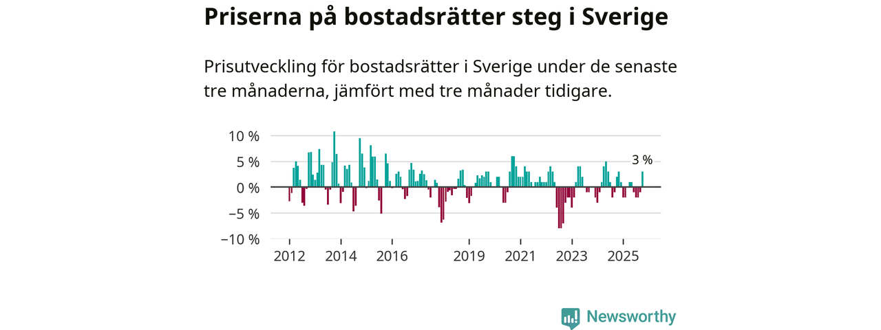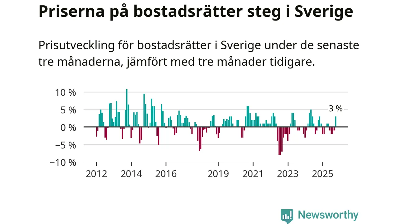 Priserna på bostadsrätter har gått upp i Sverige. Medelpriset på försäljningarna under de senaste tre månaderna visar på en uppgång med 3 procent.