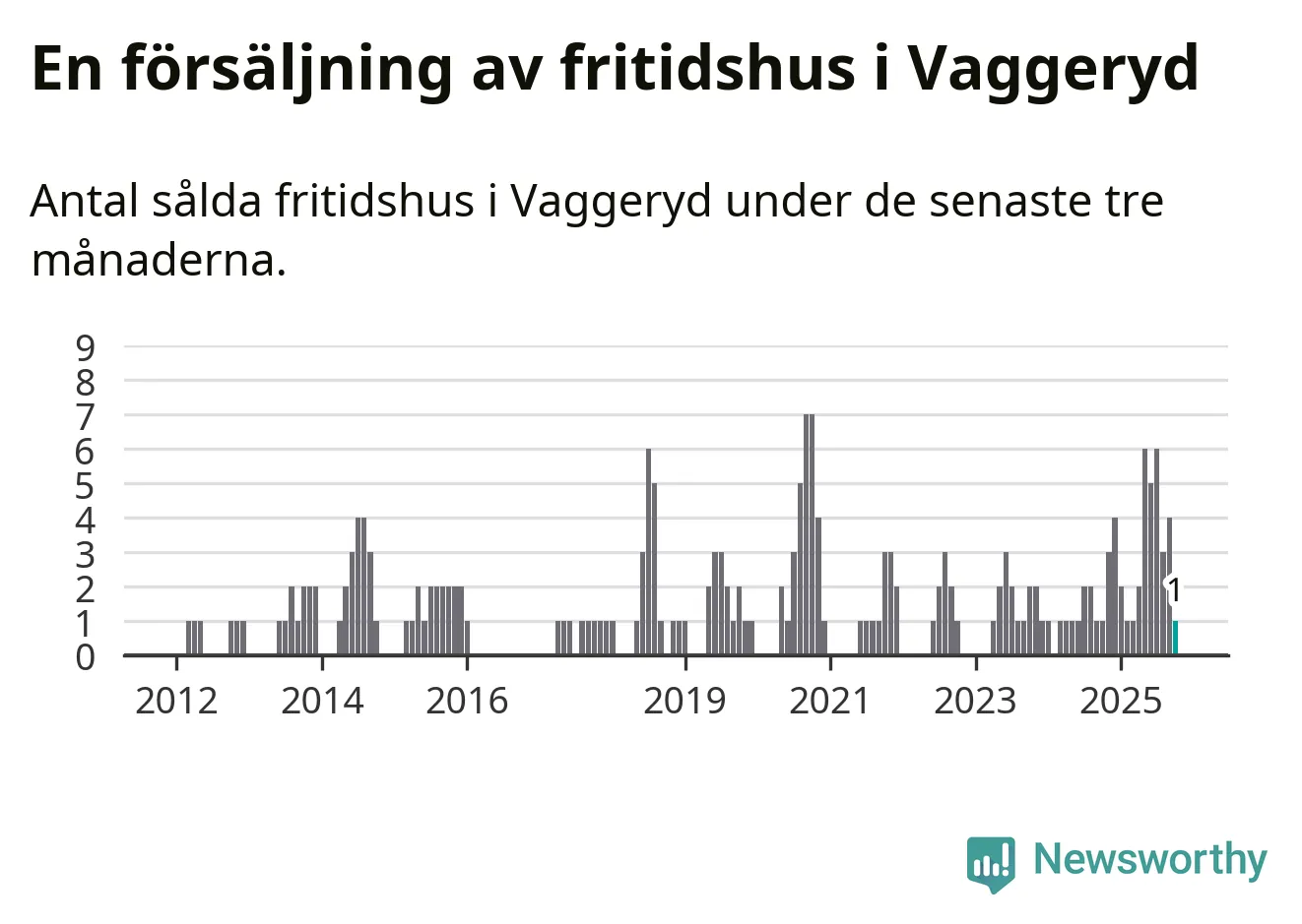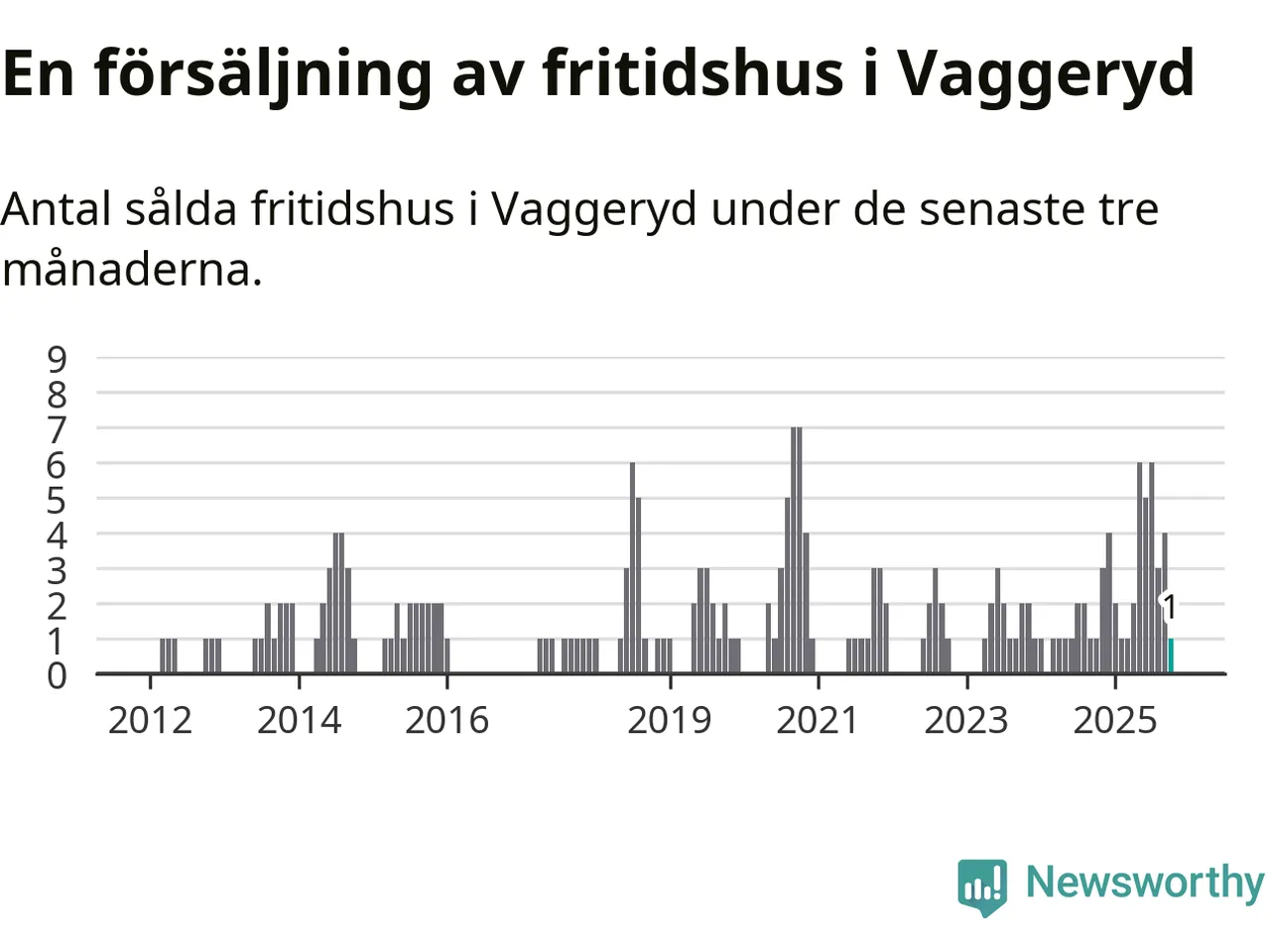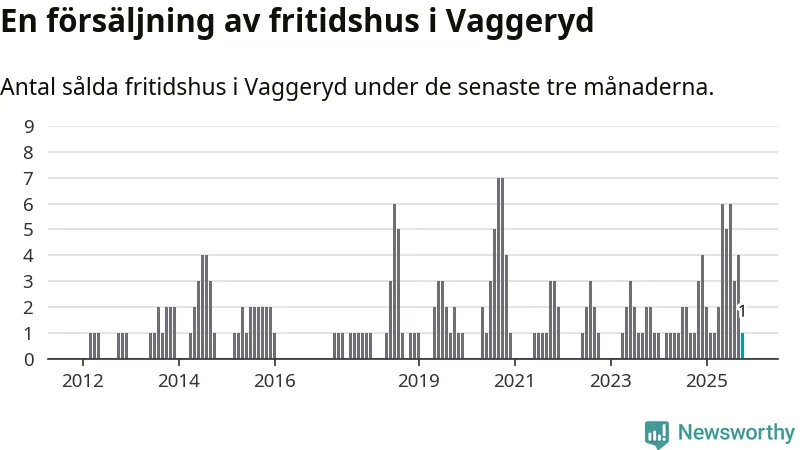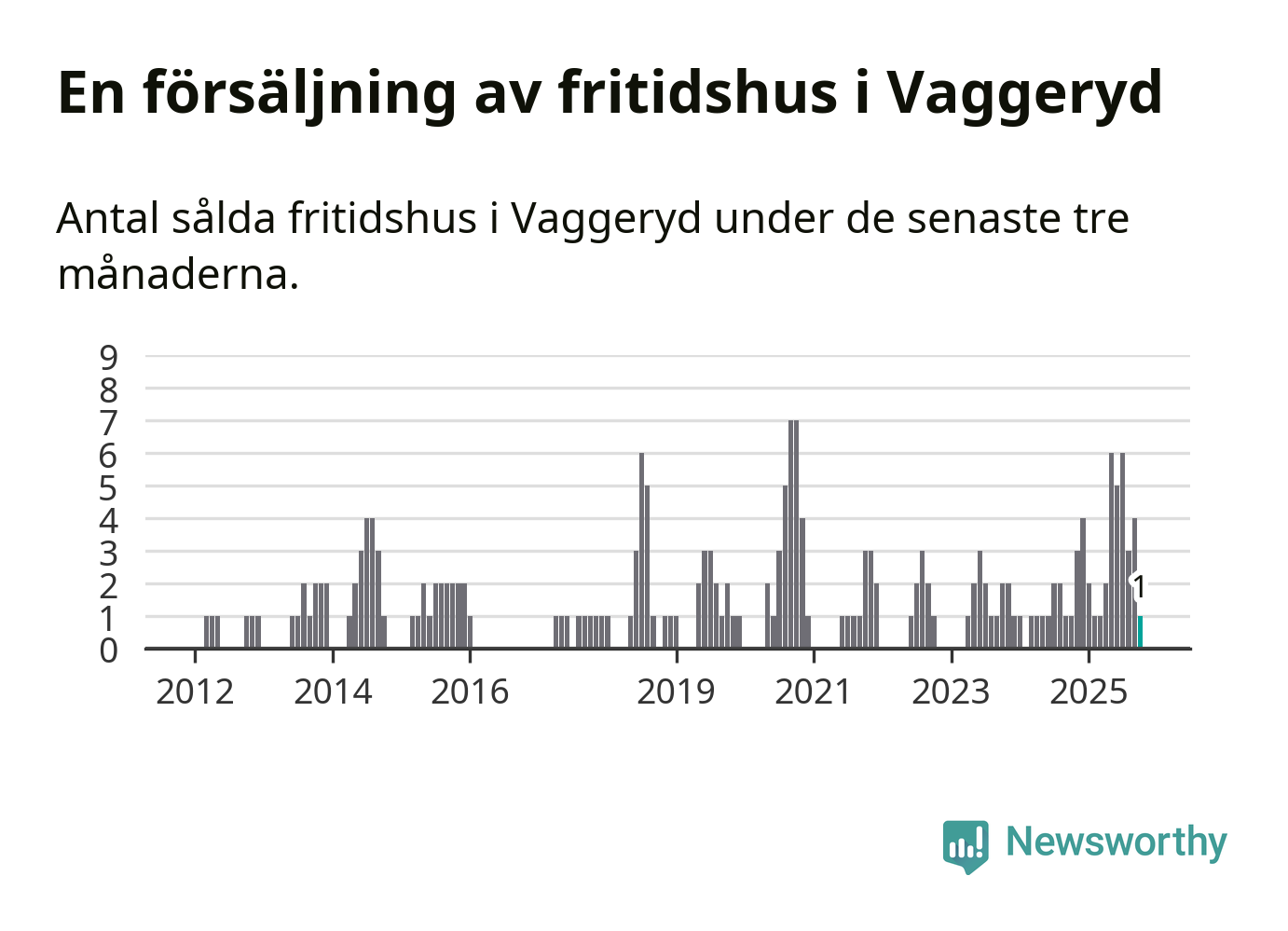 Mellan augusti och oktober gjordes sammanlagt en affär med fritidshus i Vaggeryds kommun. Det är lika många affärer som vid motsvarande tid i fjol.