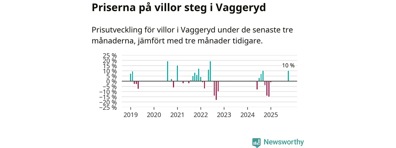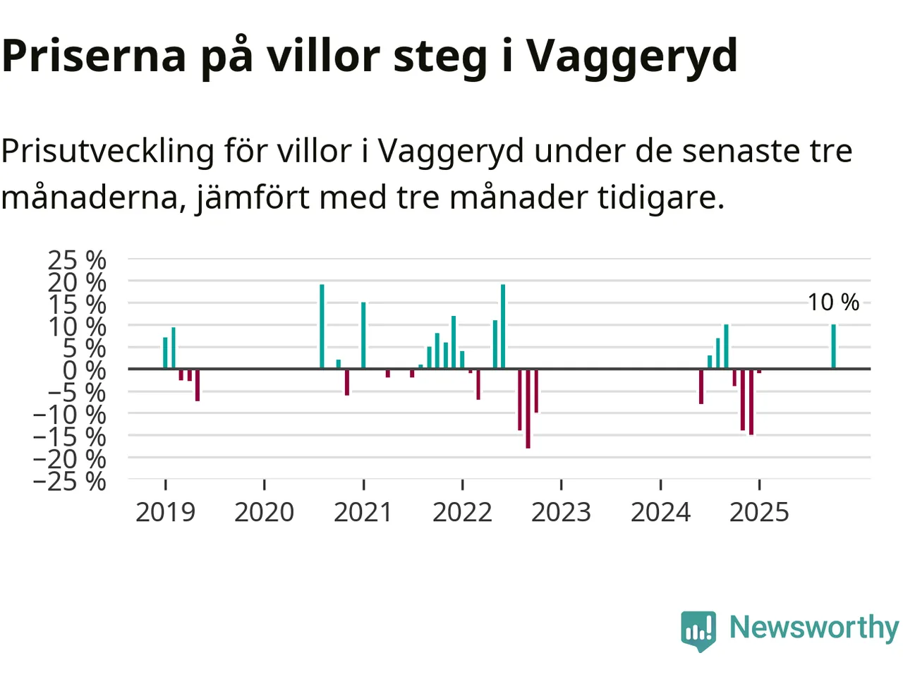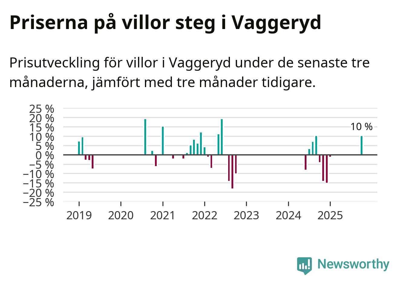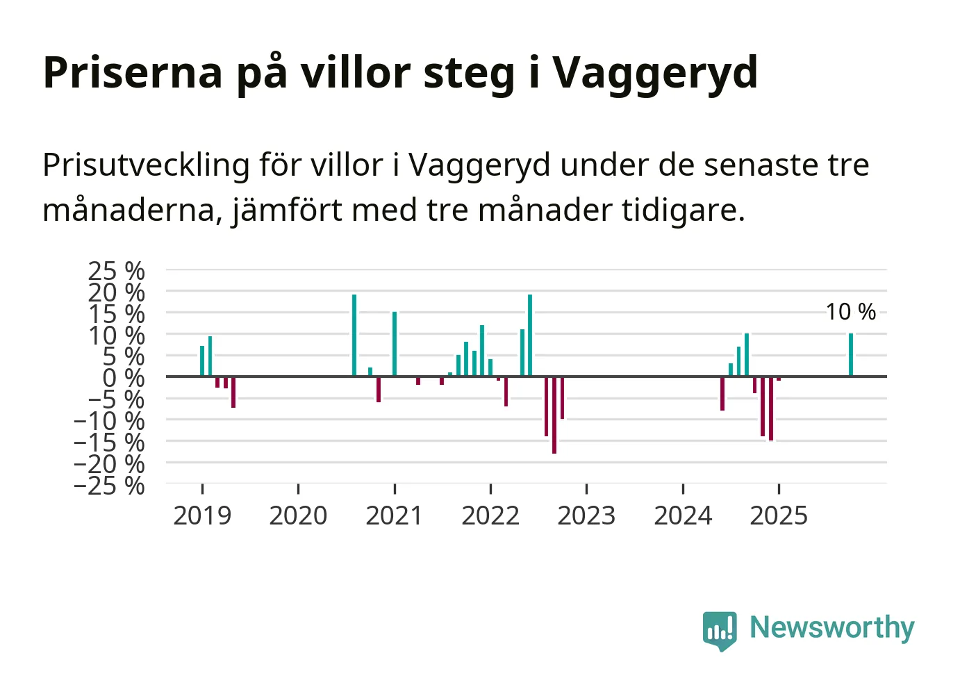 Statistiken visar även på en stor prisuppgång i Vaggeryds kommun. Medelpriset på försäljningarna av villor i kommunen var 10 procent högre än för tre månader sedan. I hela Jönköpings län däremot sjunker villapriserna. I hela länet noterades en prisnedgång på 2 procent.