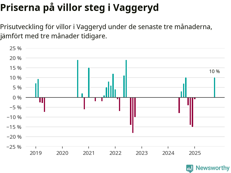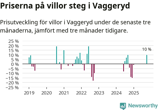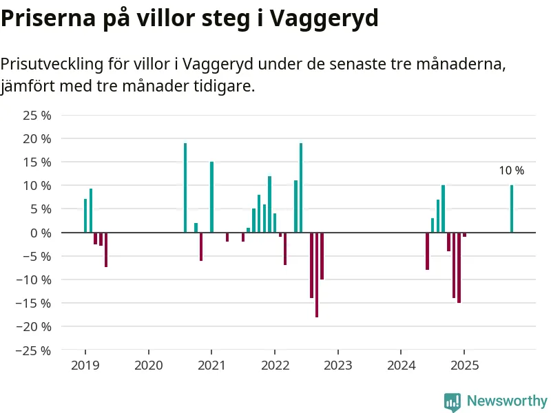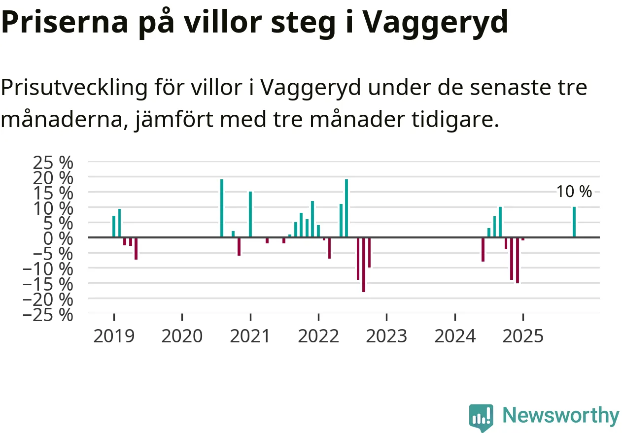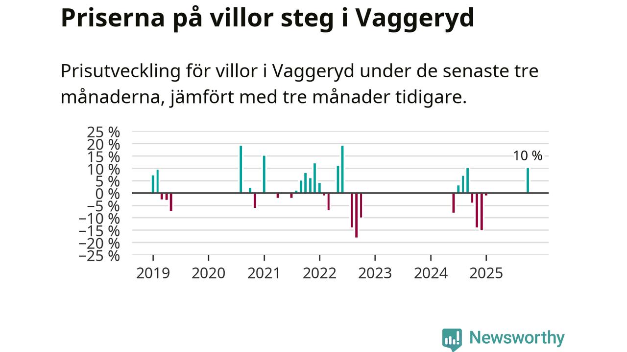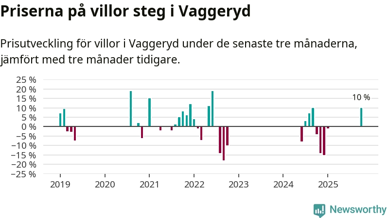 Statistiken visar även på en stor prisuppgång i Vaggeryds kommun. Medelpriset på försäljningarna av villor i kommunen var 10 procent högre än för tre månader sedan. I hela Jönköpings län däremot sjunker villapriserna. I hela länet noterades en prisnedgång på 2 procent.