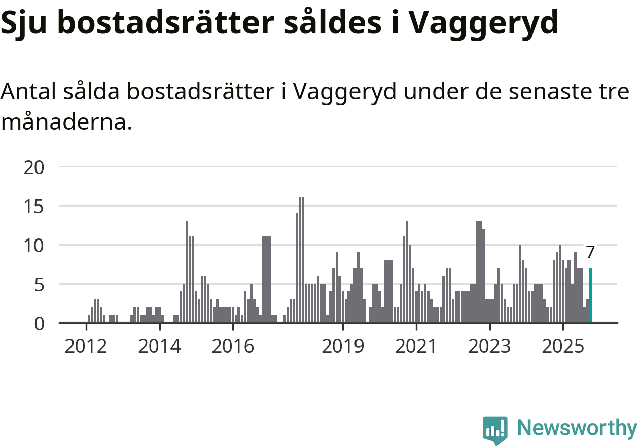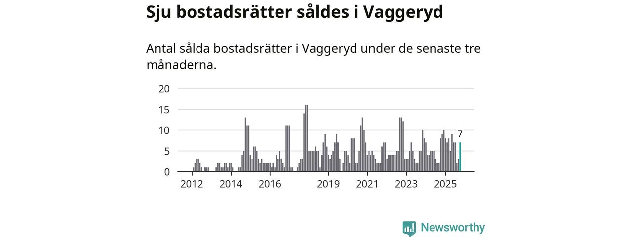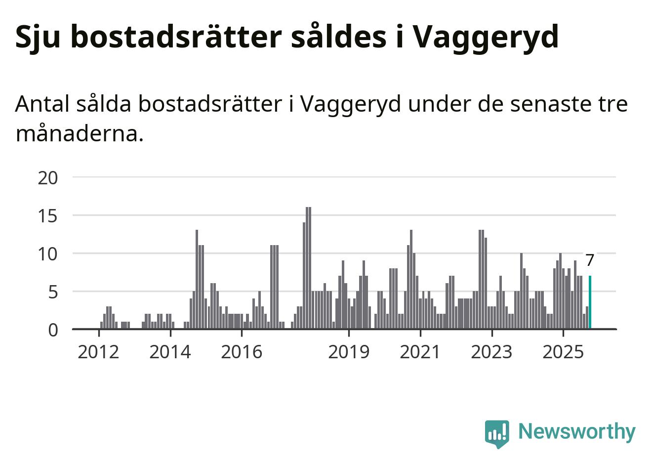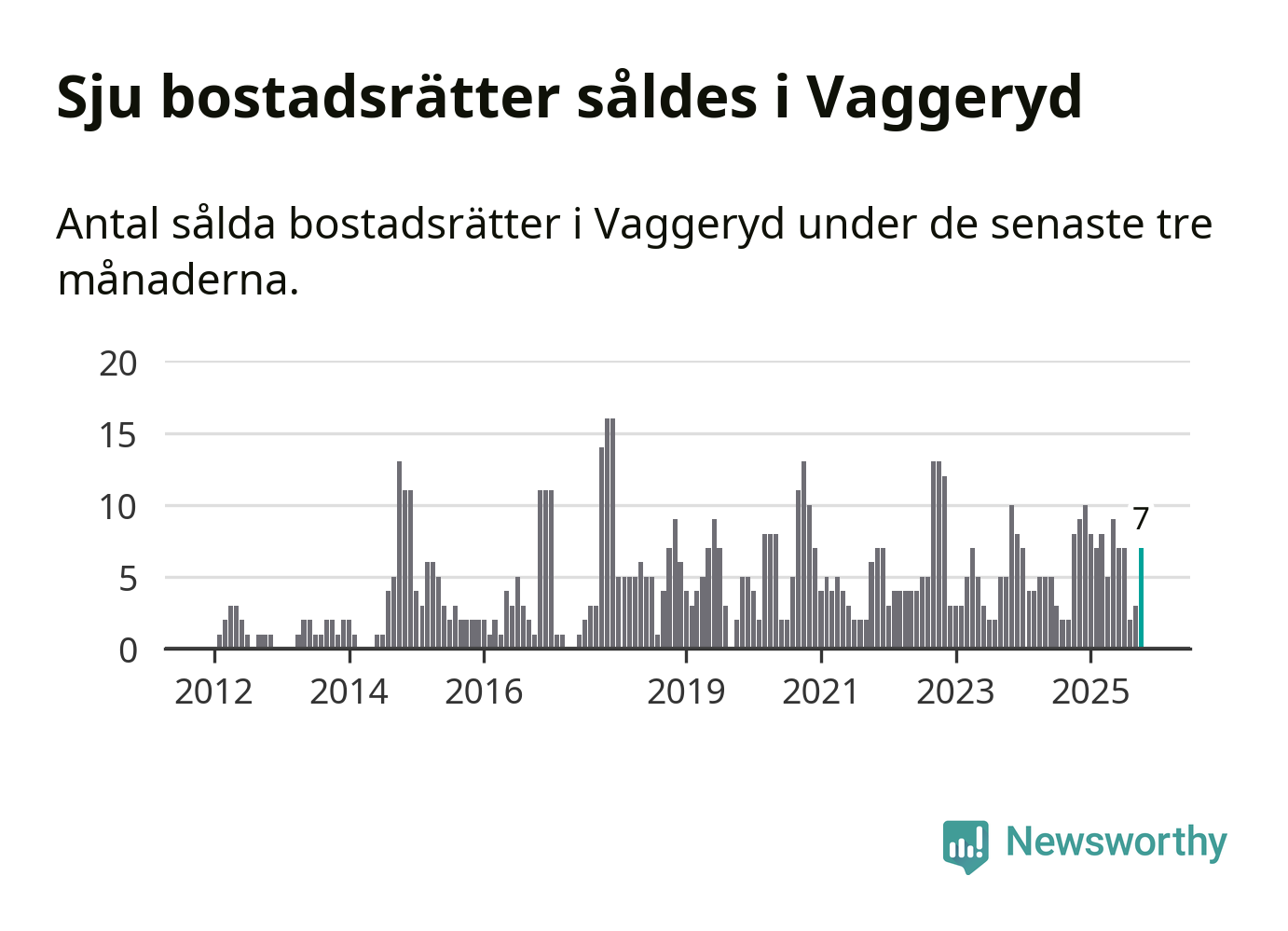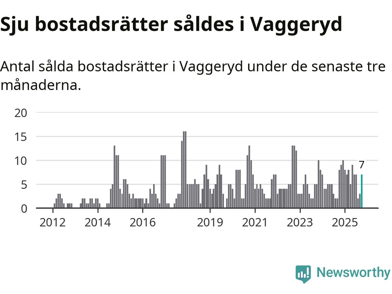 Mellan augusti och oktober gjordes sammanlagt sju affärer med bostadsrätter i Vaggeryds kommun. Det kan jämföras med åtta vid motsvarande tid i fjol.