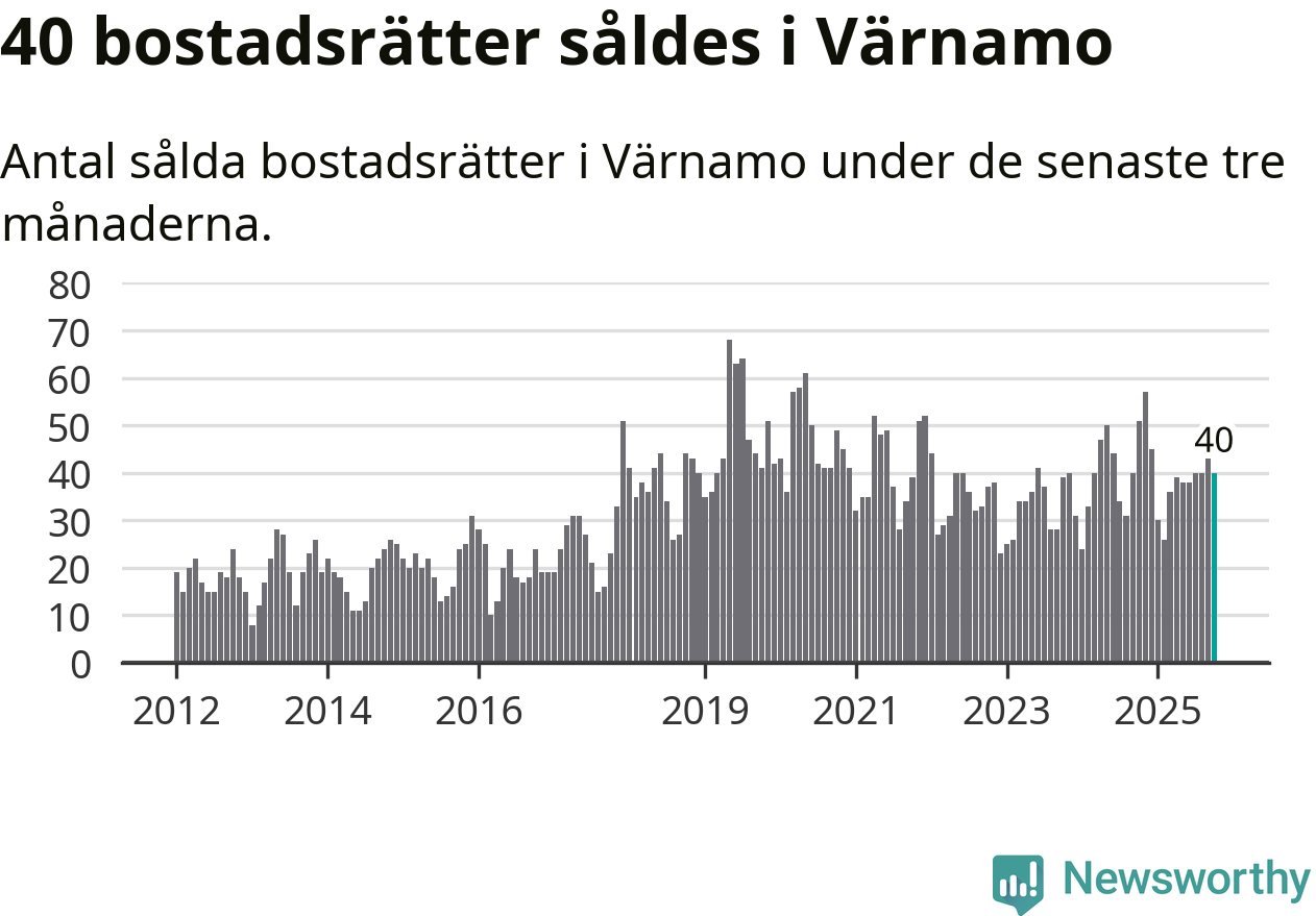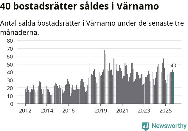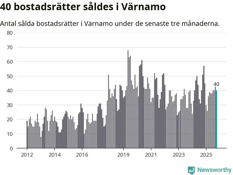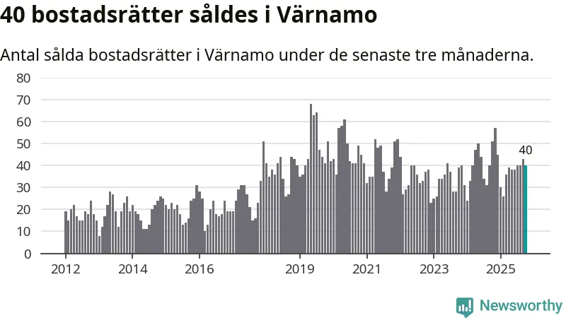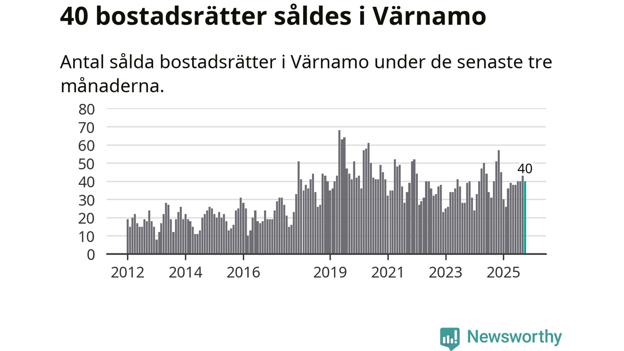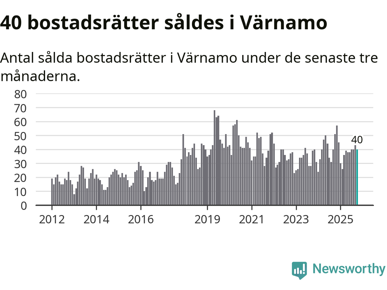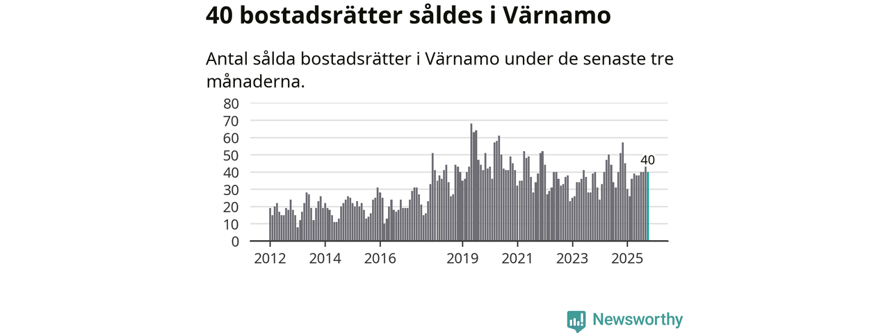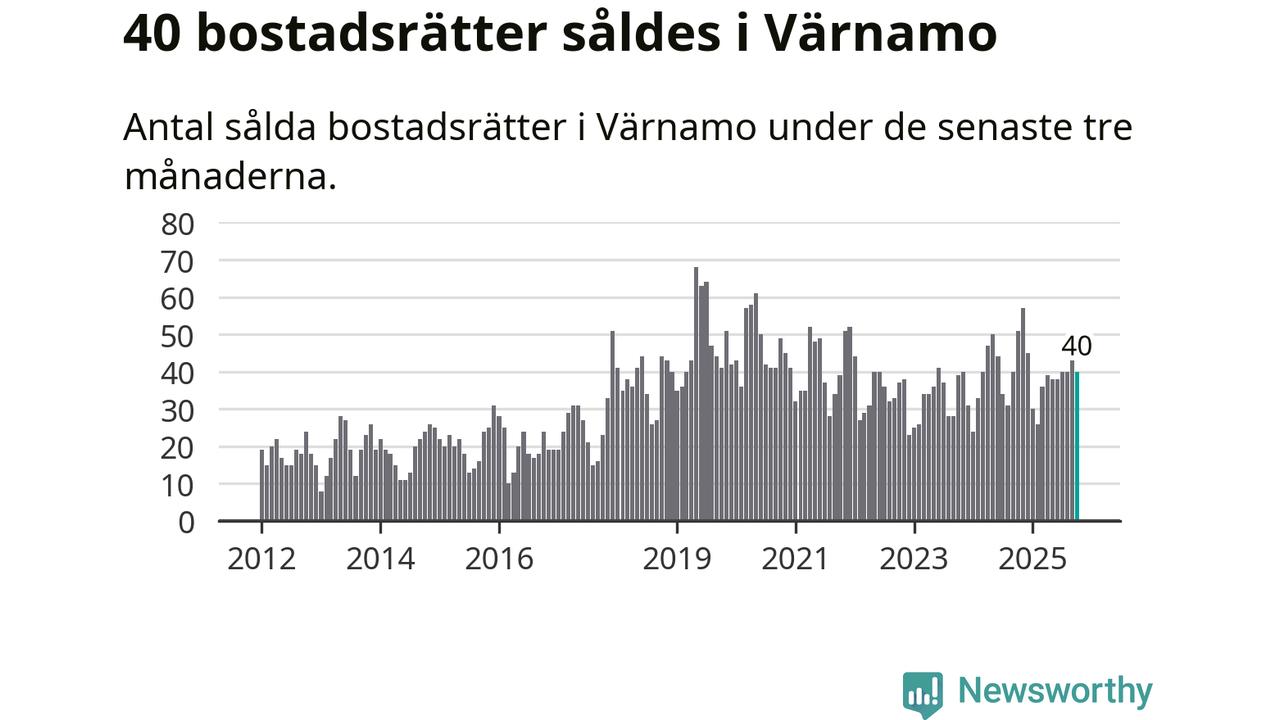 Sammanlagt såldes 40 bostadsrätter i Värnamo kommun mellan augusti och oktober till ett genomsnittligt pris på 1,2 miljoner kronor. I fjol gjordes 51 affärer vid den här tiden på året.
