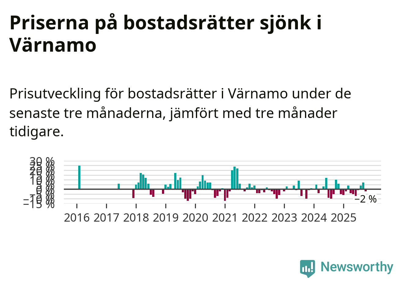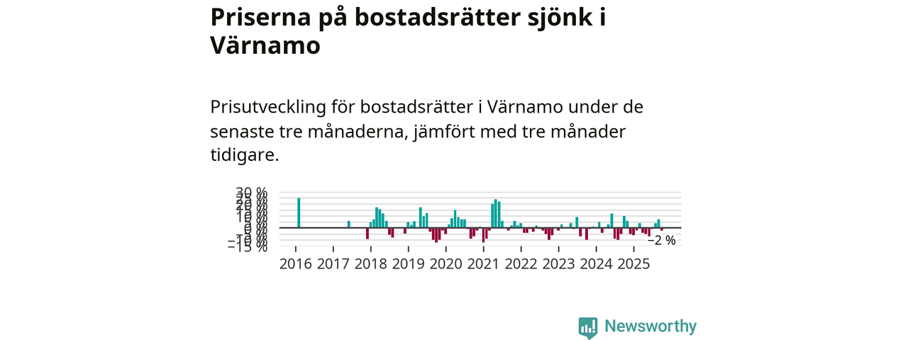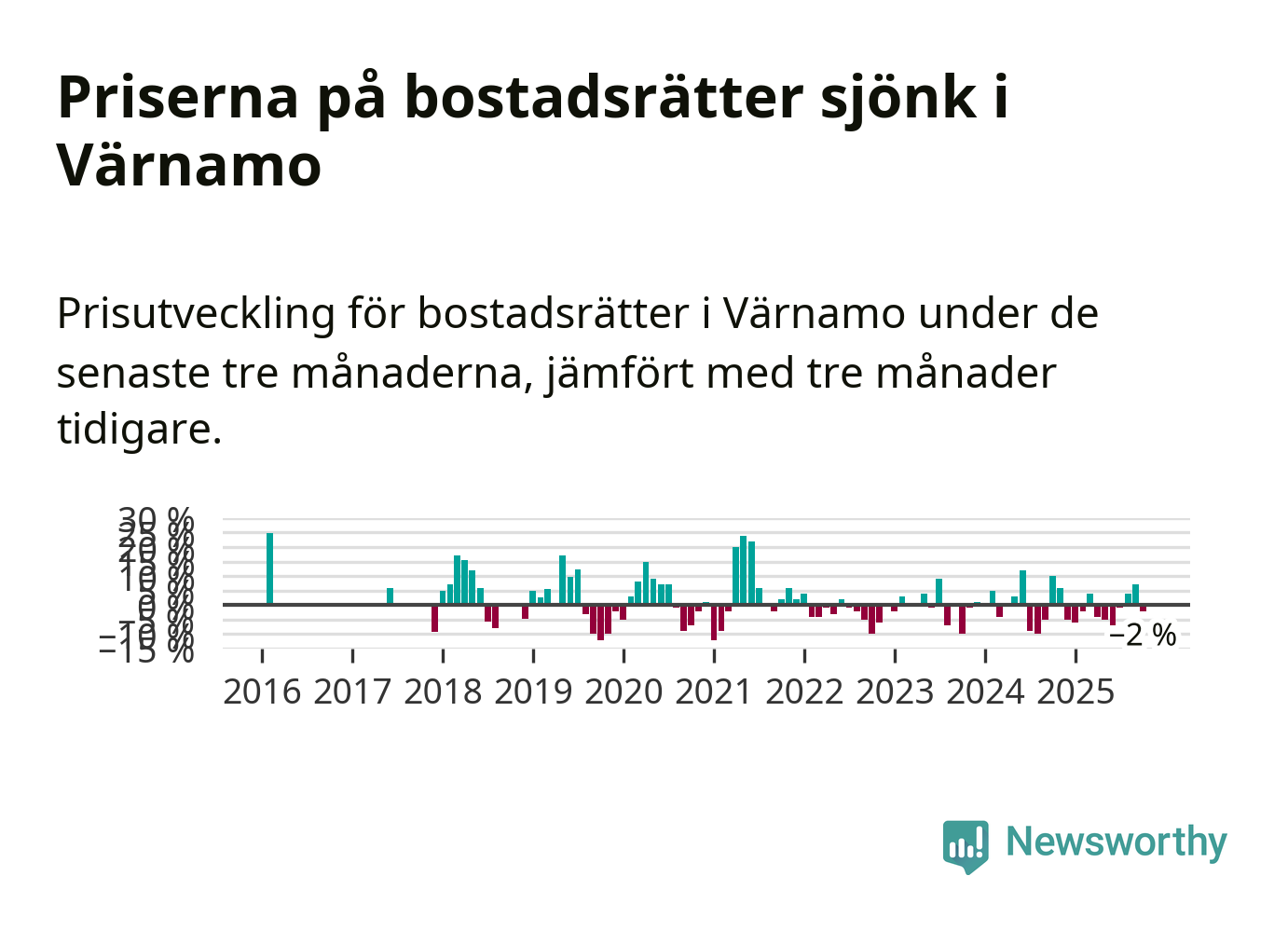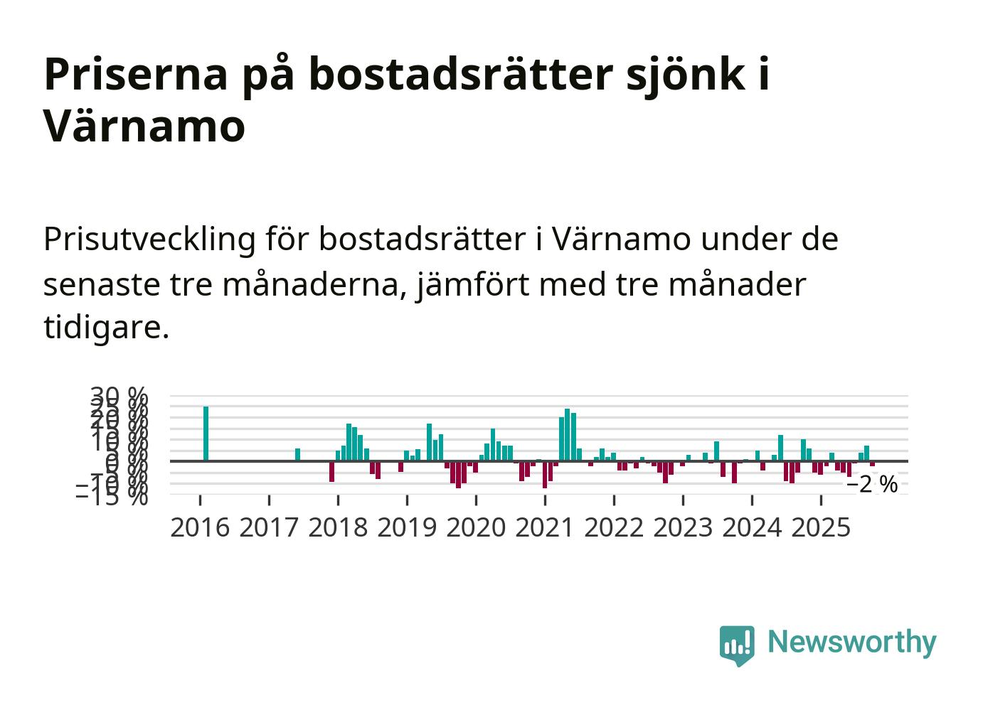 Priserna på bostadsrätter har gått ner i Värnamo kommun. Medelpriset på försäljningarna under de senaste tre månaderna visar på en nedgång med 2 procent.