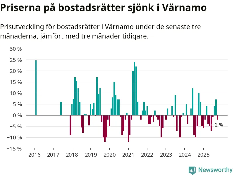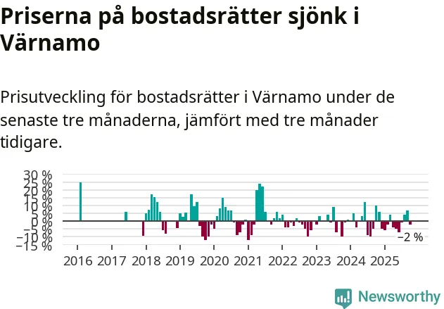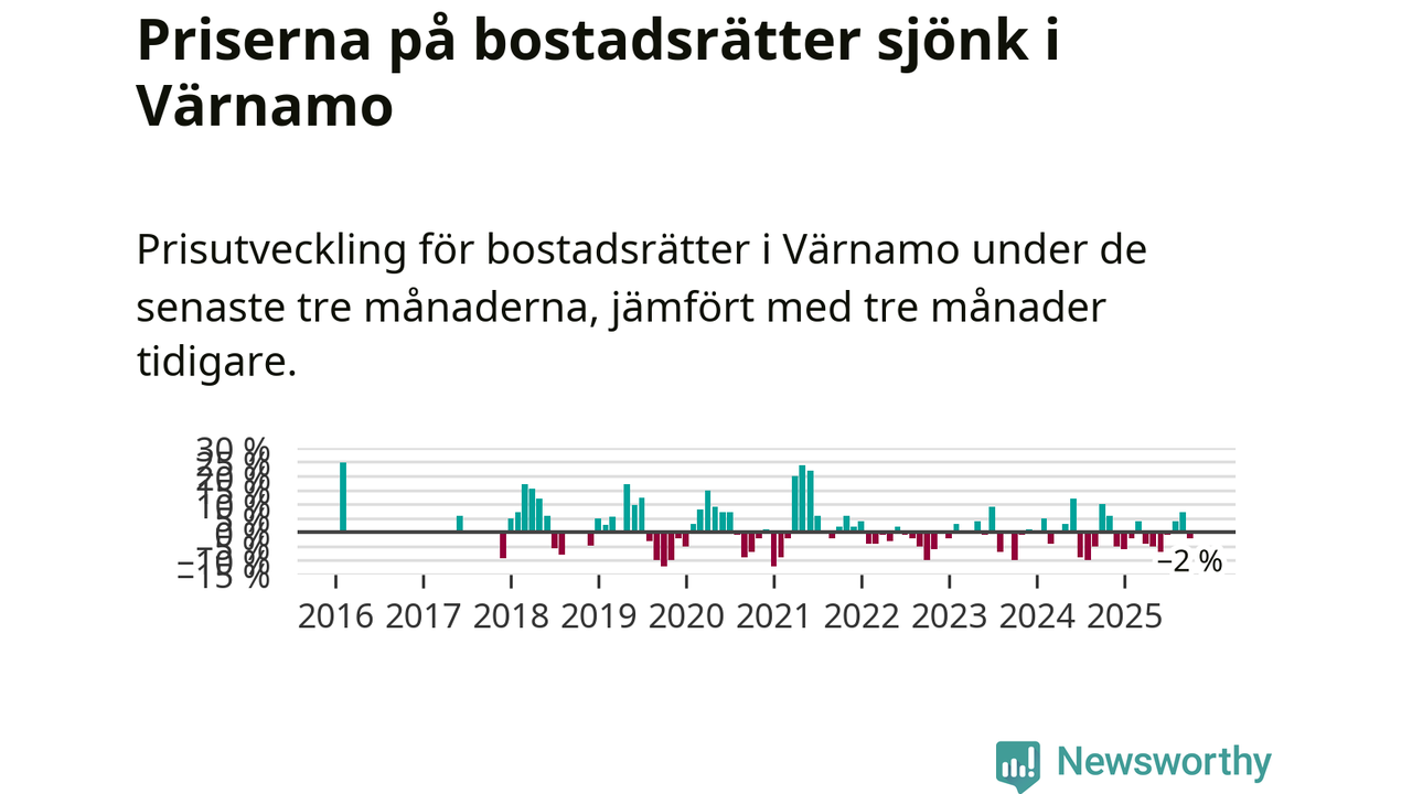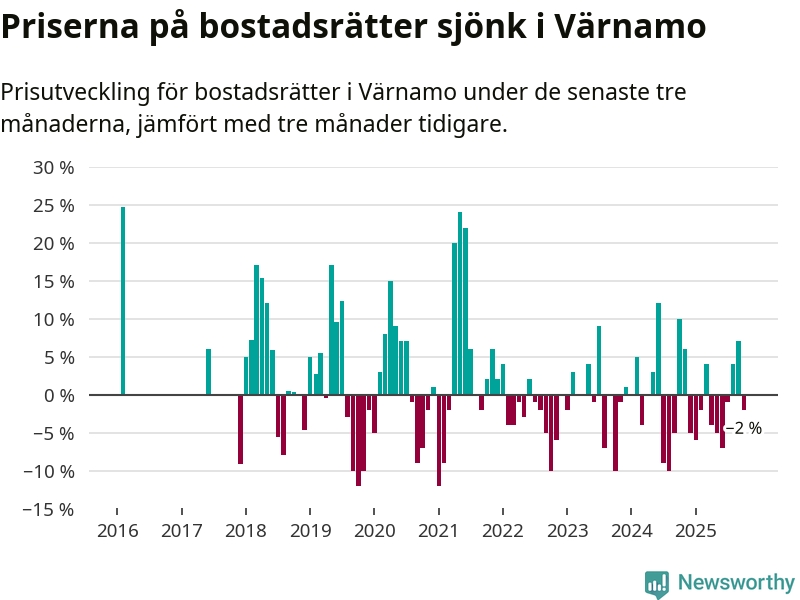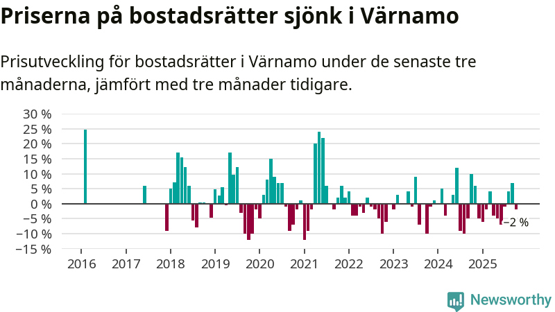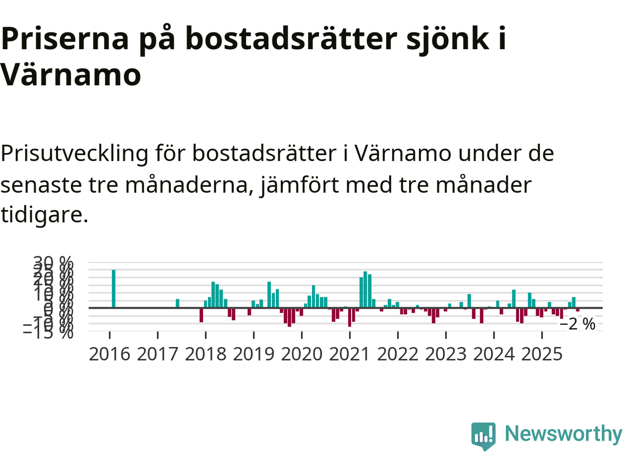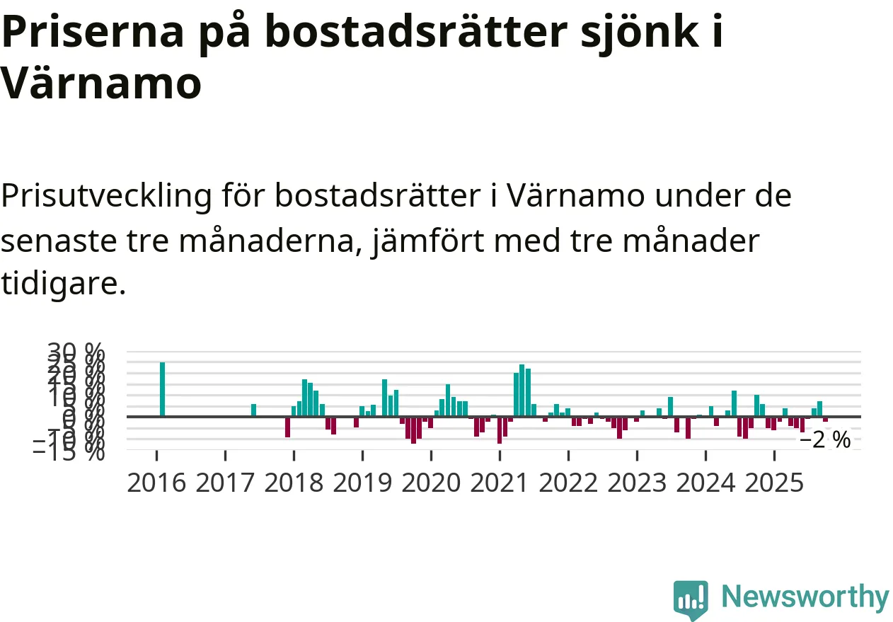 Priserna på bostadsrätter har gått ner i Värnamo kommun. Medelpriset på försäljningarna under de senaste tre månaderna visar på en nedgång med 2 procent.