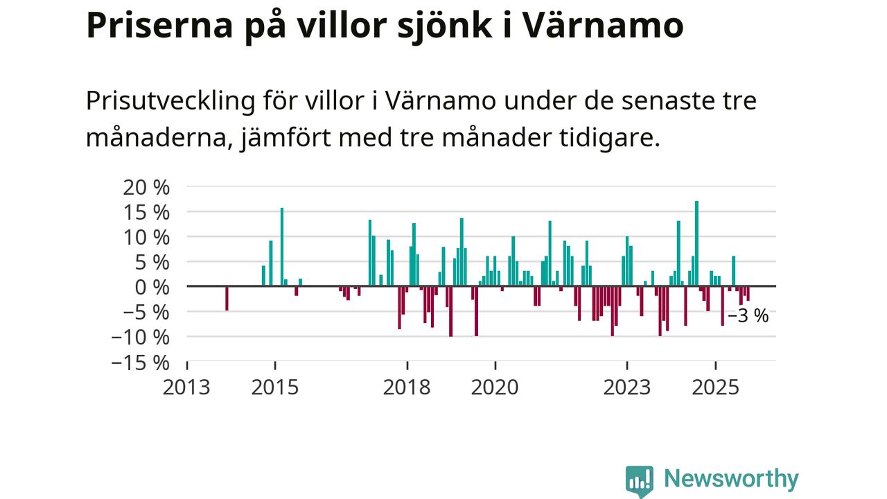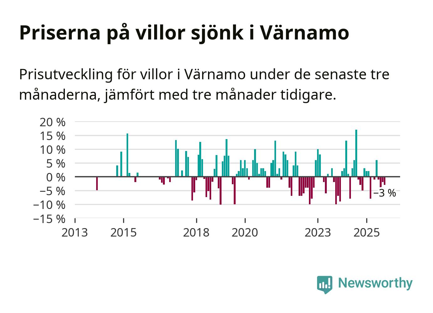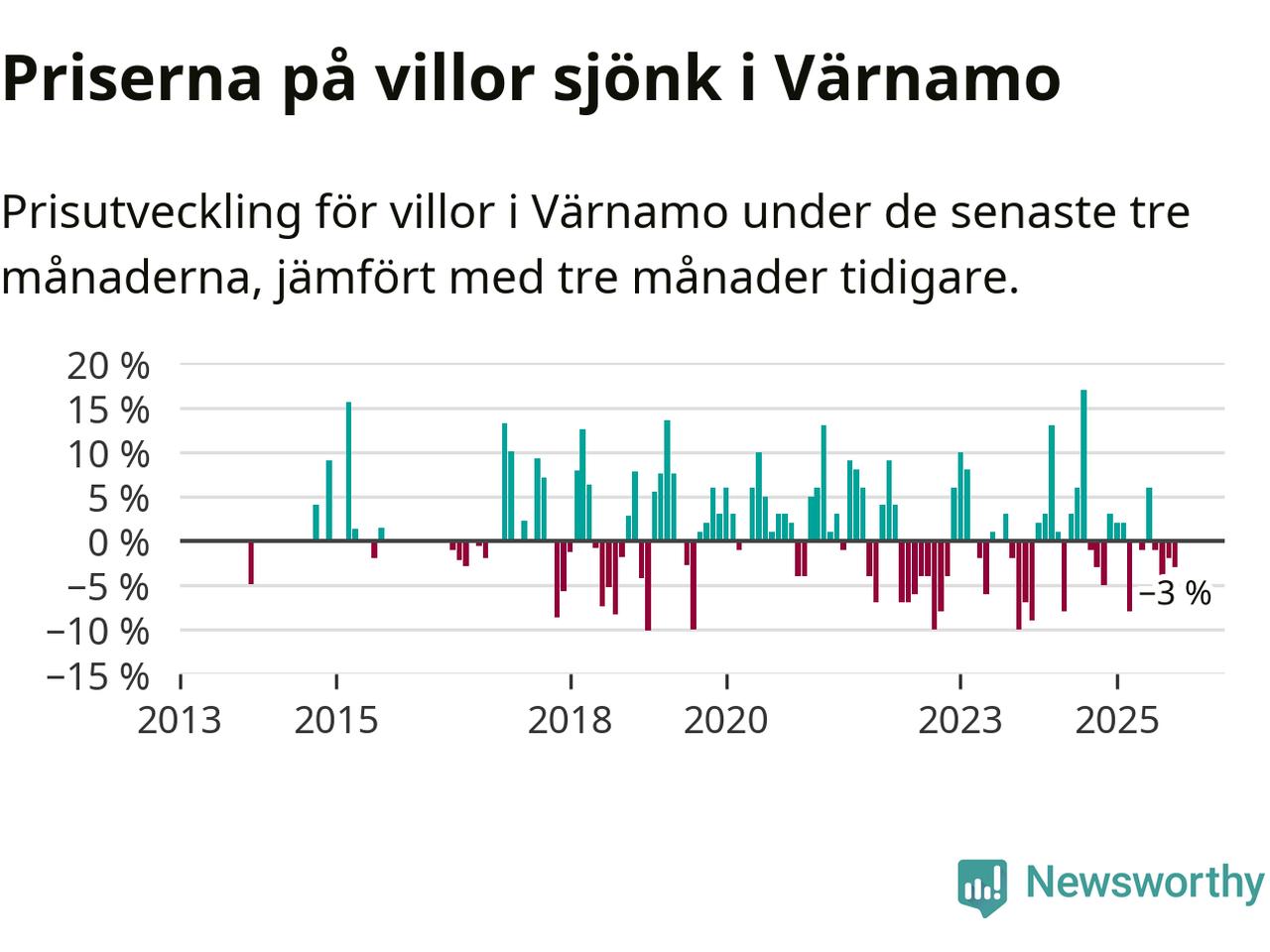 Villapriserna har gått ner i Värnamo kommun. Medelpriset på försäljningarna under de senaste tre månaderna visar på en nedgång med 3 procent.